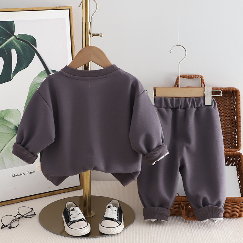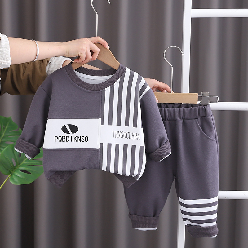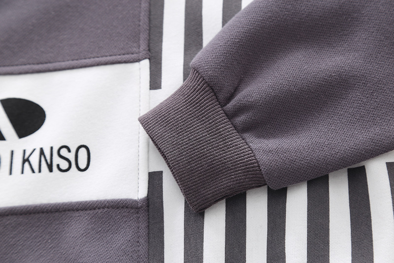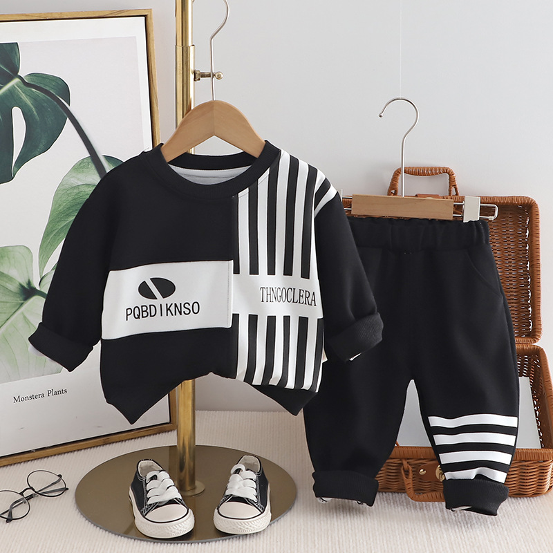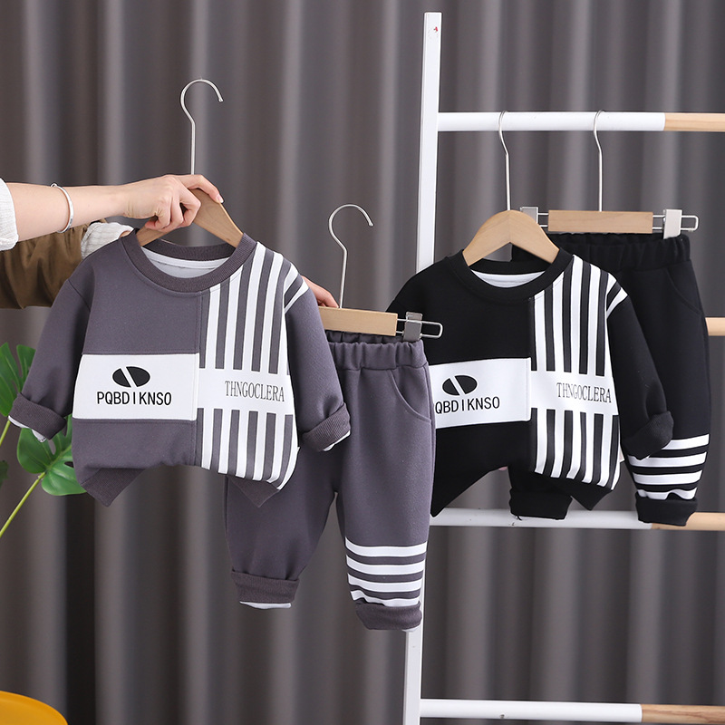 한국식 어린이 봄과 가을 새로운 캐주얼 스포츠 긴 소매 세트 세로 패턴 글자를 꿰매고 소년의 투피스 세트 봄 패션