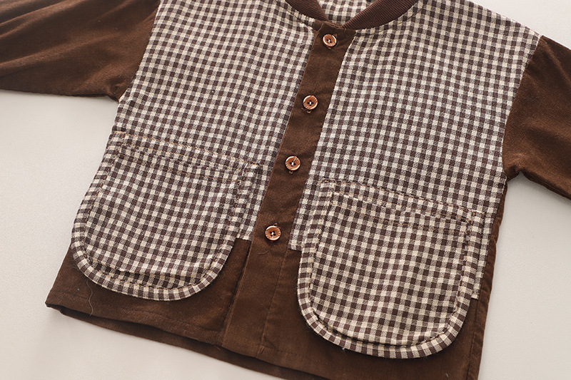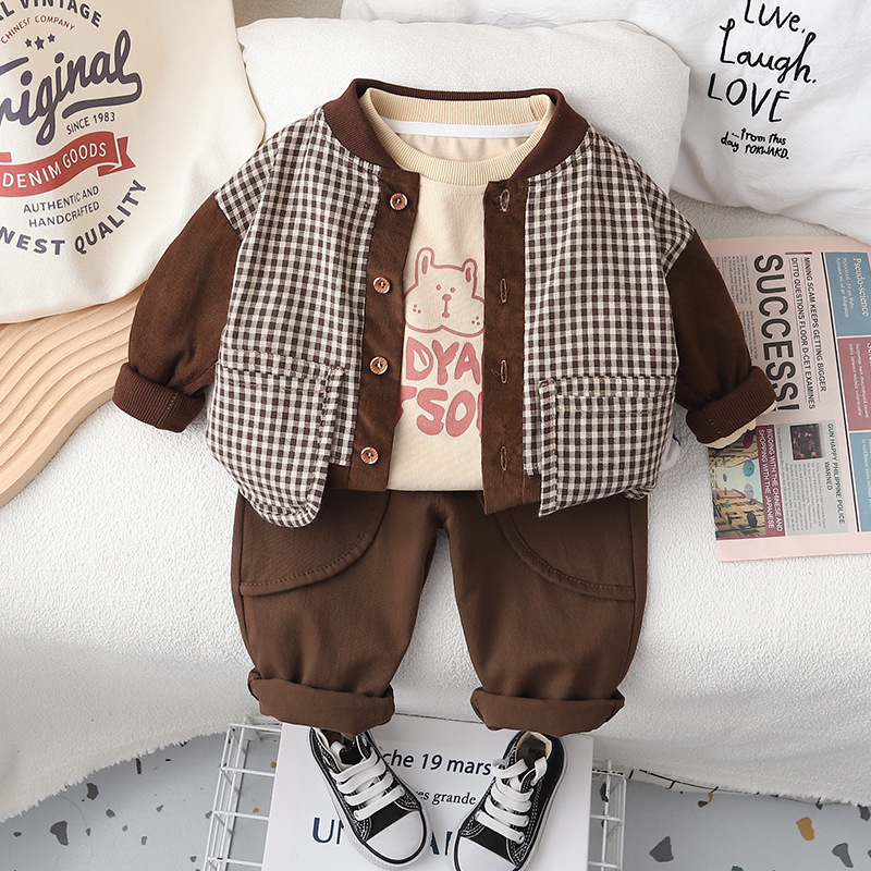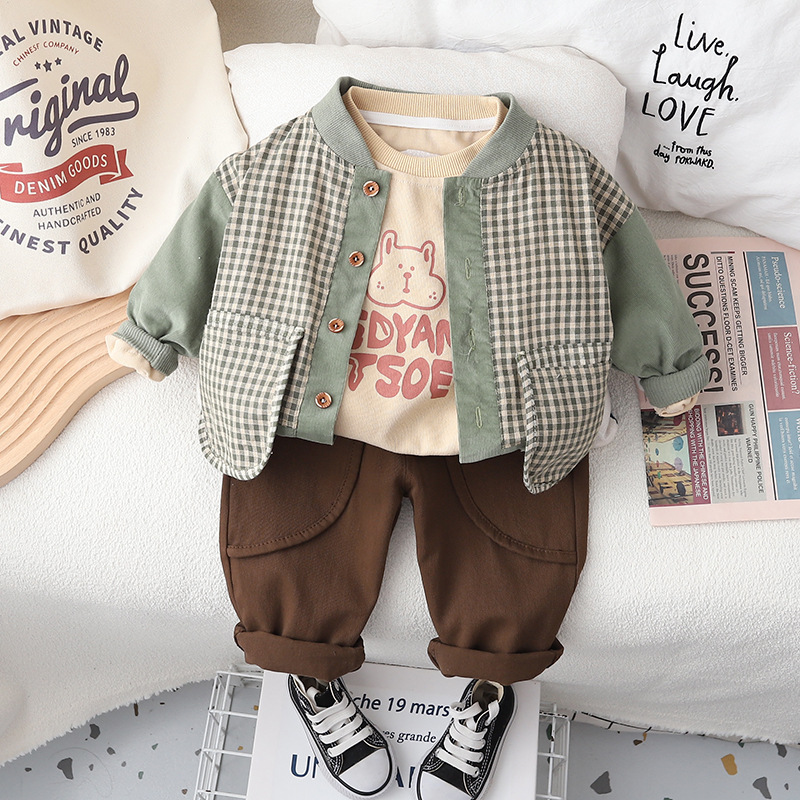 어린이 의류 2024 새로운 한국식 메쉬 스티칭 코트 3 피스 긴팔 소년 봄 옷 어린이 세트 패션스토어 가기