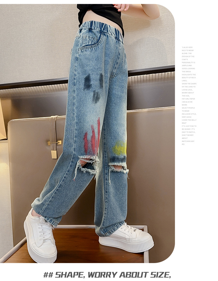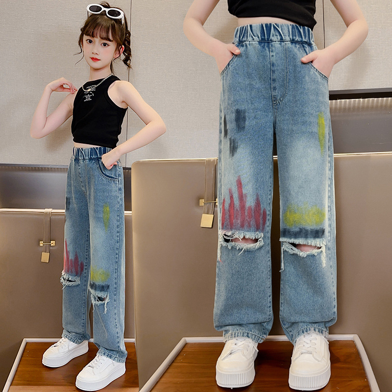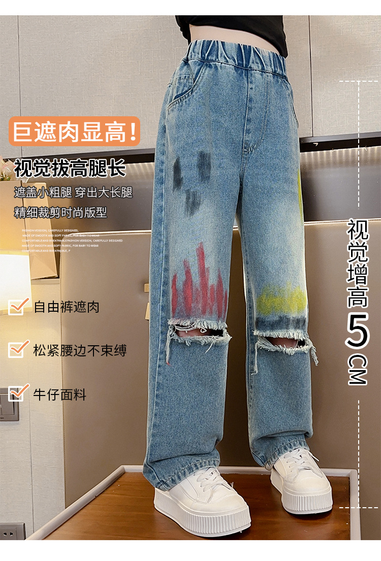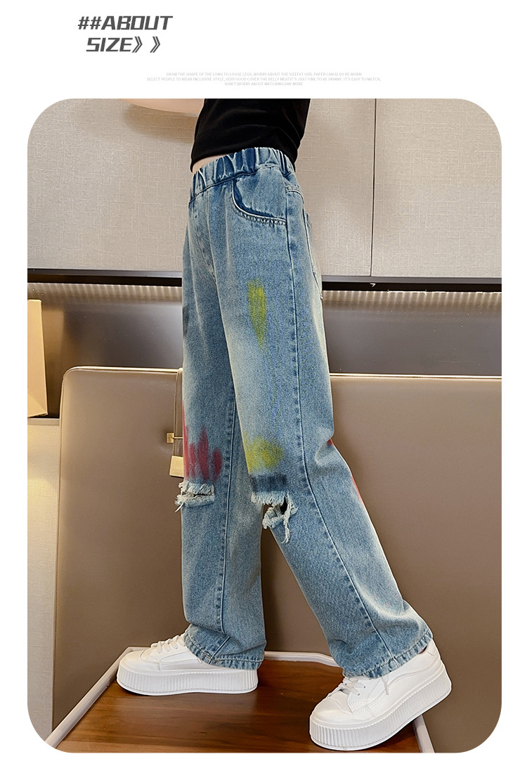 한국식 어린이 바지 소녀 찢어진 청바지 한국식 중형 및 대형 어린이 느슨한 와이드 레그 바지 낙서 바지 봄과 가을 패션