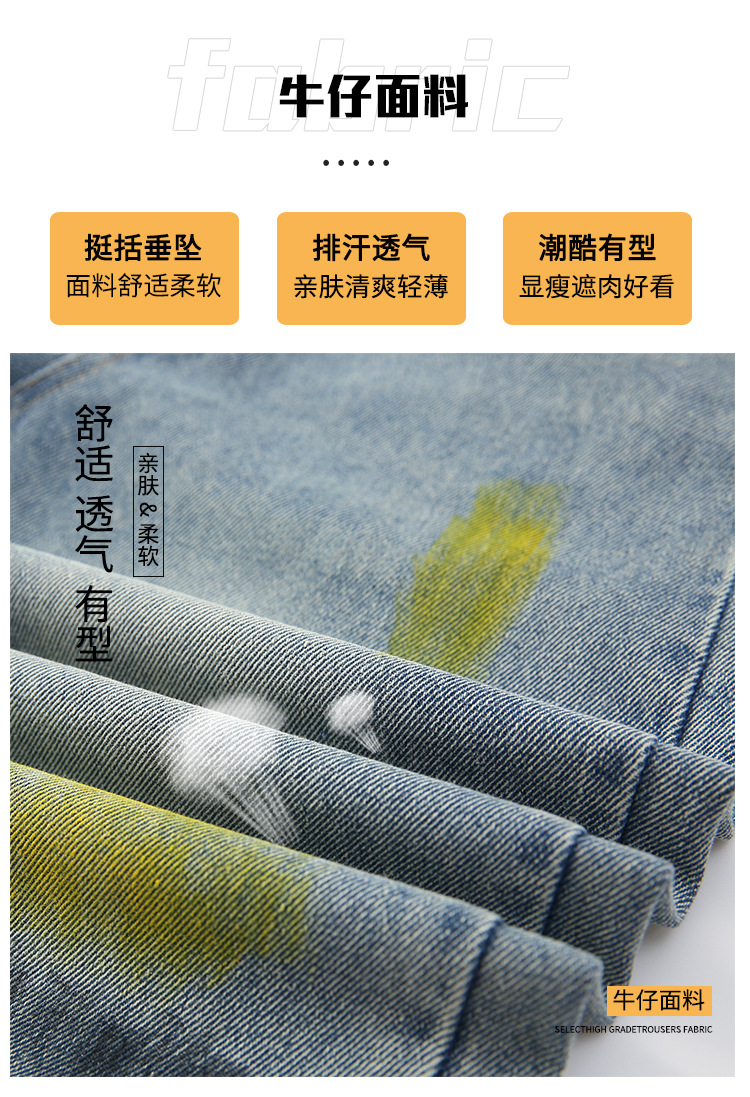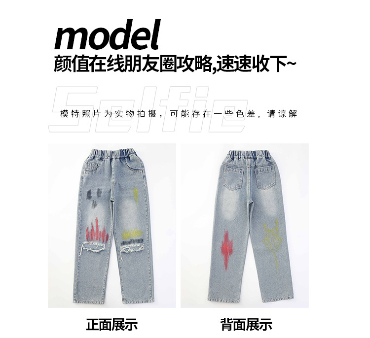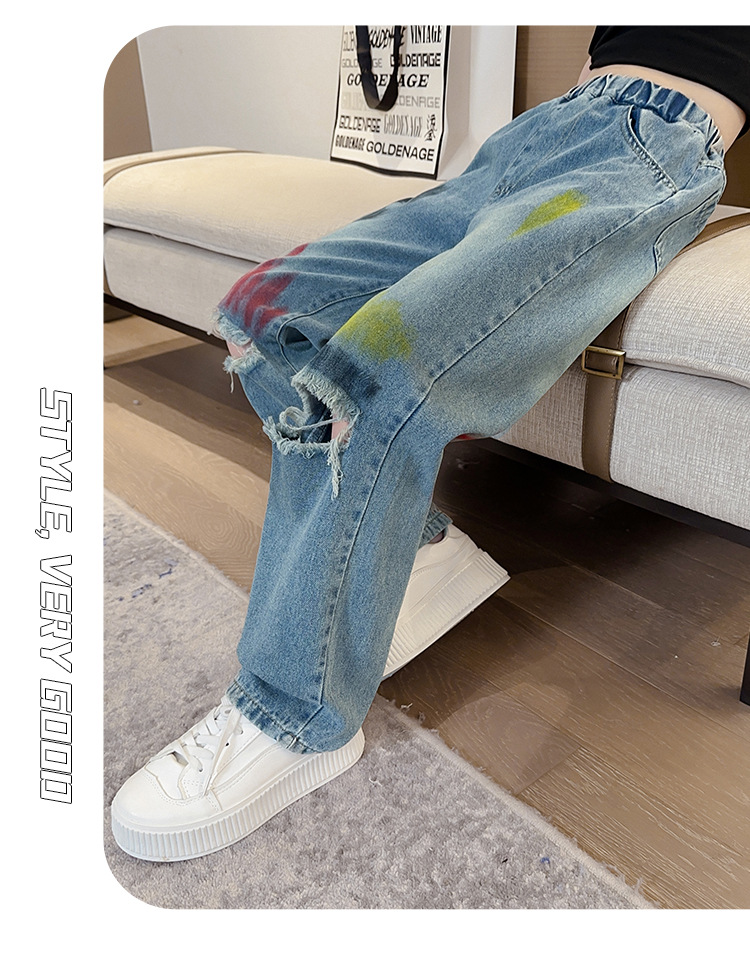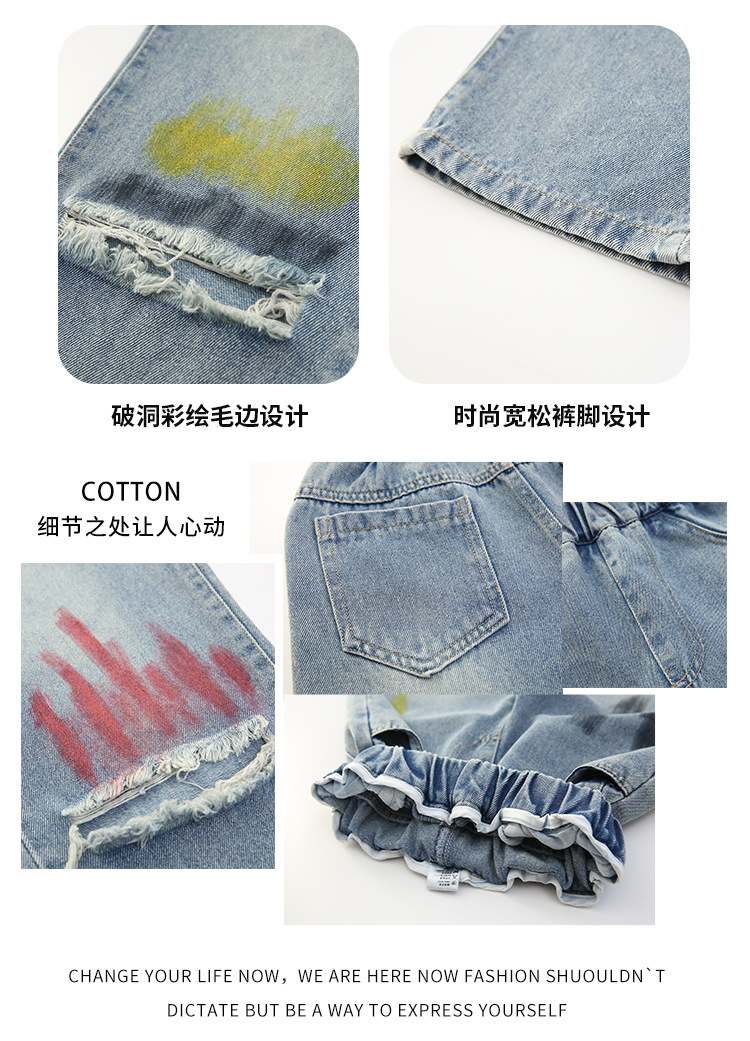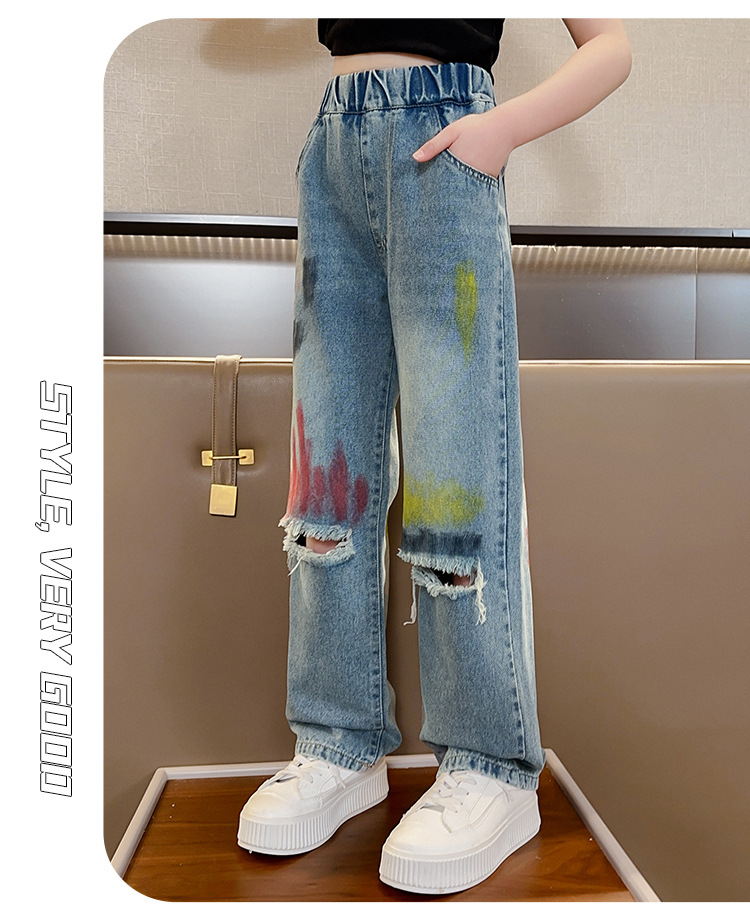 한국식 어린이 바지 소녀 찢어진 청바지 한국식 중형 및 대형 어린이 느슨한 와이드 레그 바지 낙서 바지 봄과 가을 패션