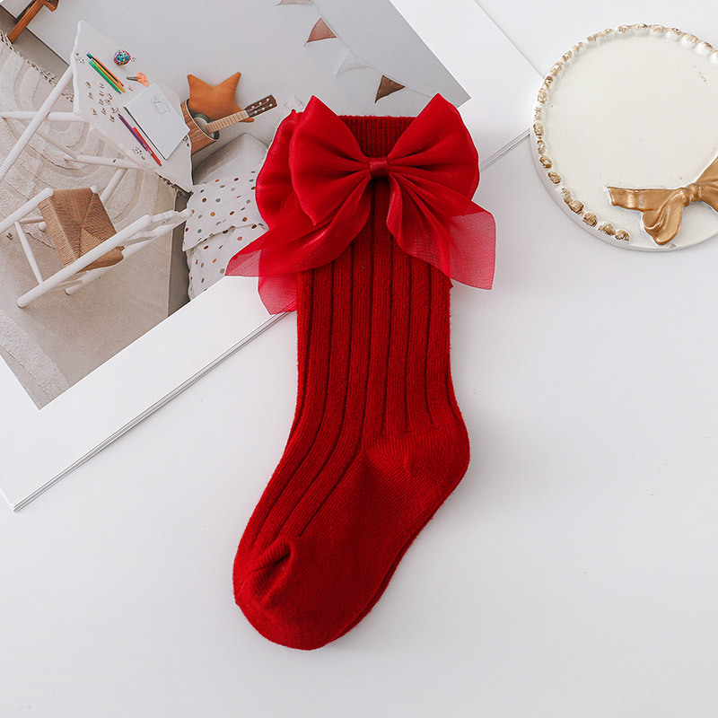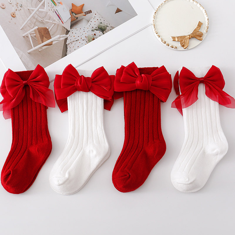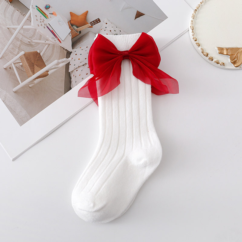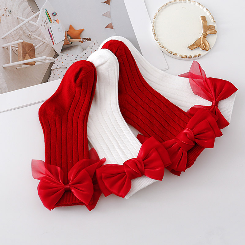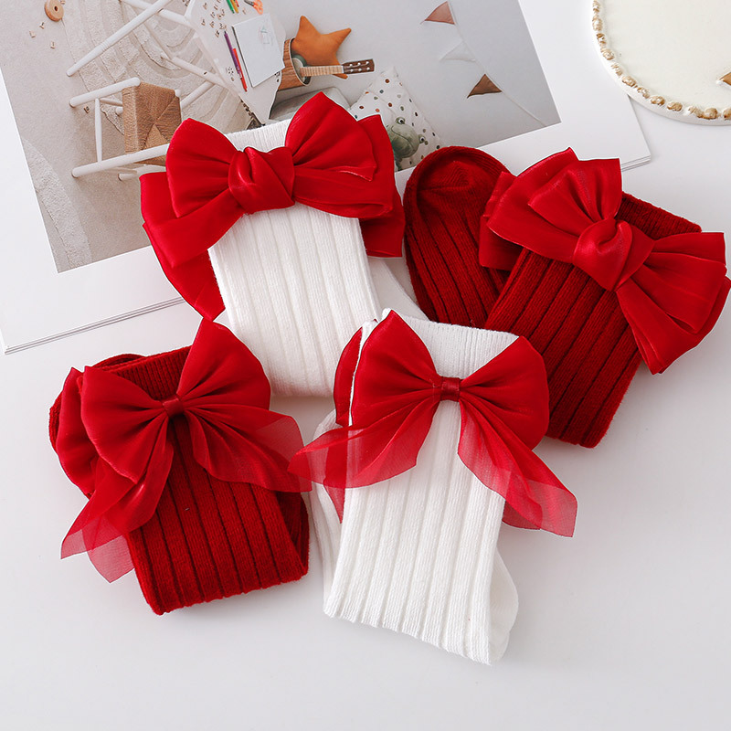 • 흰색 양말-빨간색 실크 표면 리본 매듭