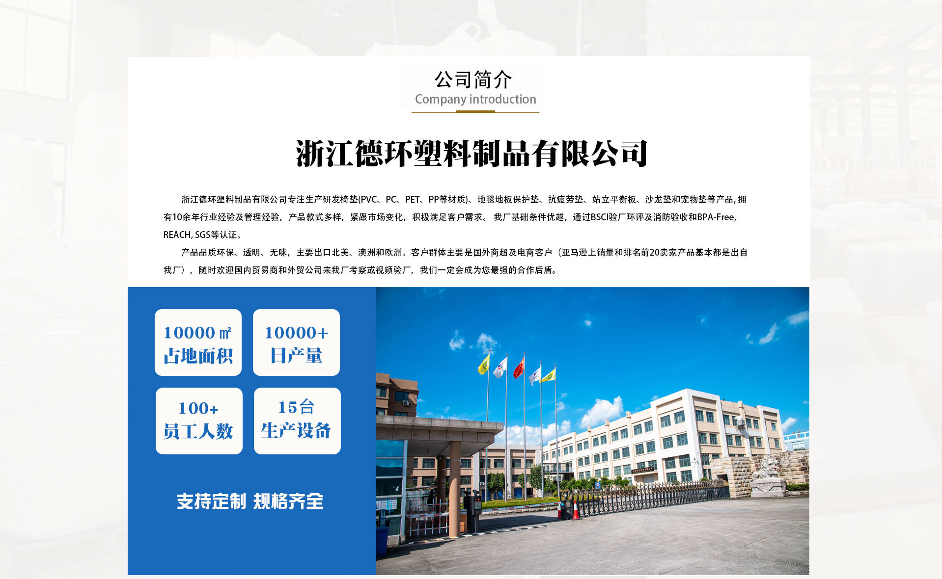 | 生产工厂 | 浙江德环塑料制品有限公司 中国 浙江 三门县 海润街道滨港路17号 |