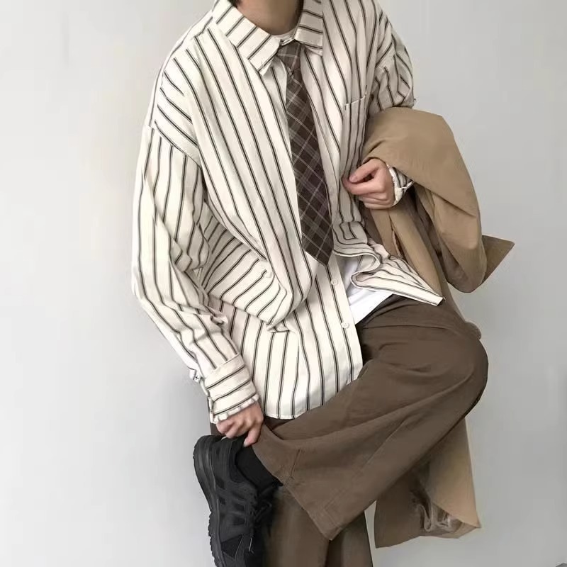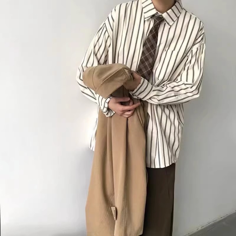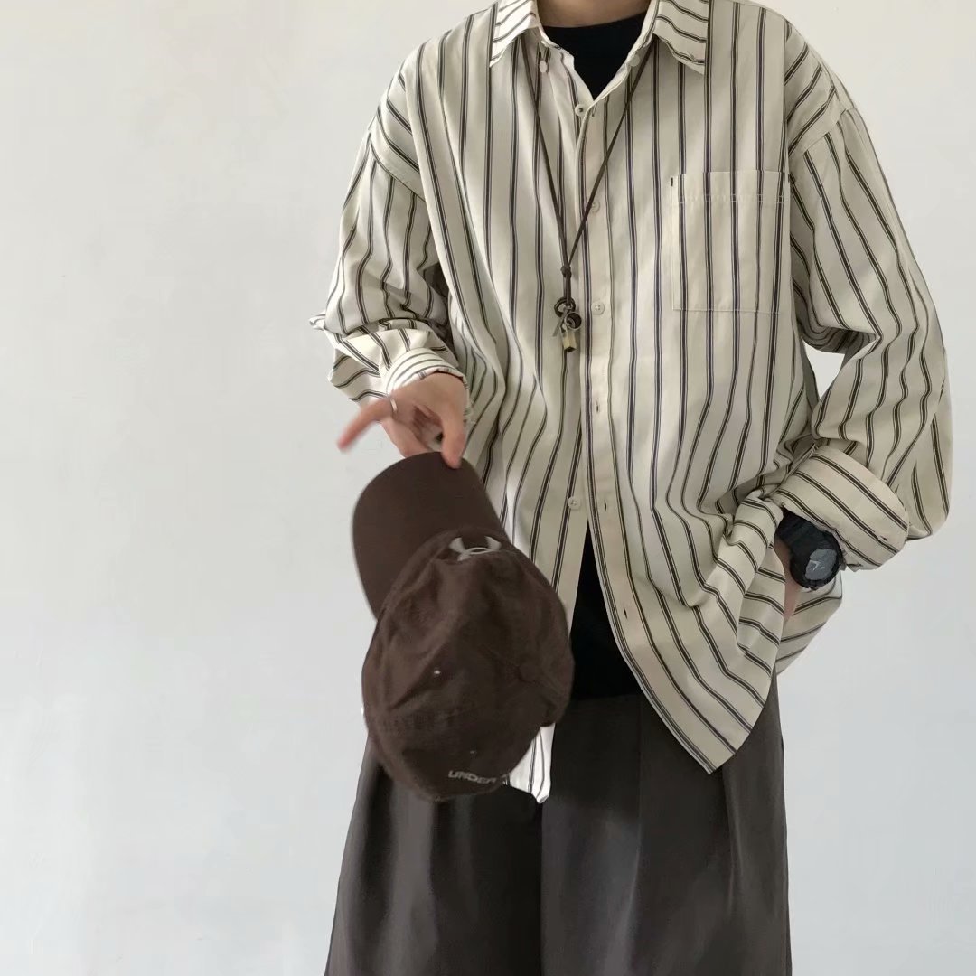 중립 스타일 스트라이프 셔츠 남자의 긴 소매 스태킹 일본 스타일 레트로 탑 디자인 센스 니쉬 내면이 봄과 가을을 입고