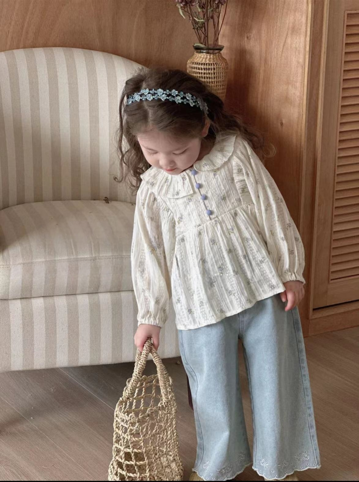 어린이 한국식 셔츠 + 넓은 다리 바지 세트 여자 봄 꽃 신선한 in 스타일 서양식 봄 옷 새로운