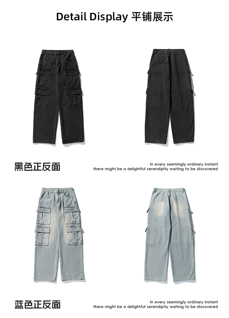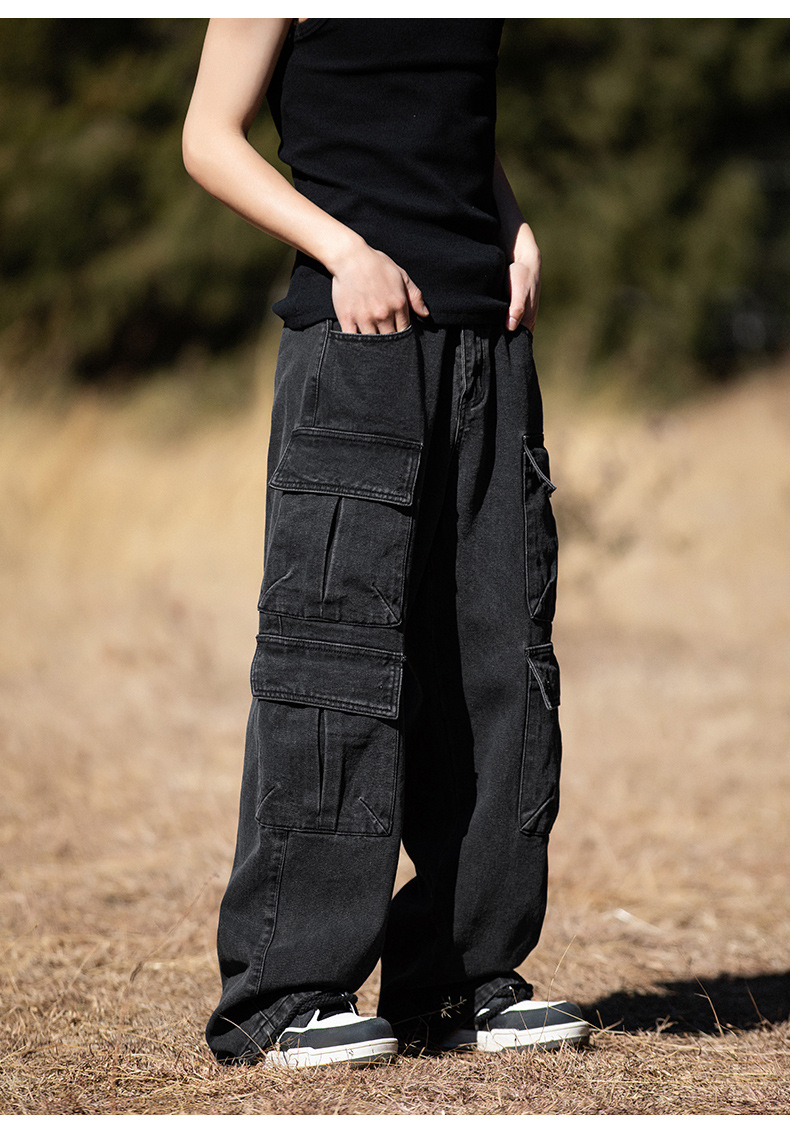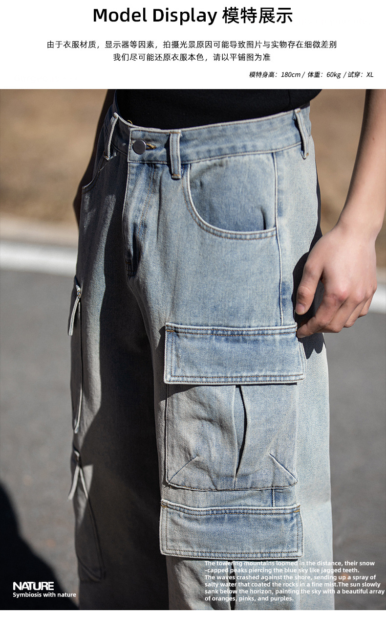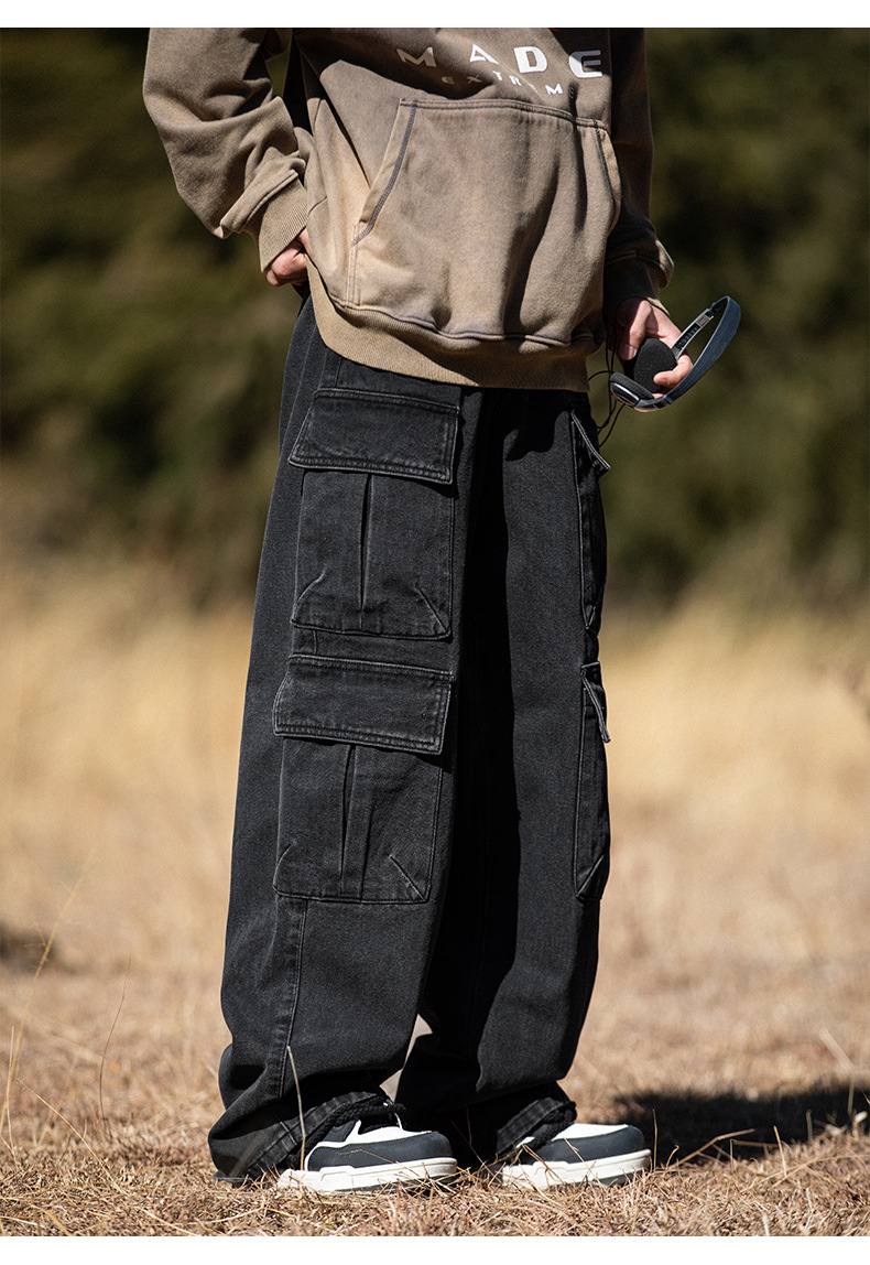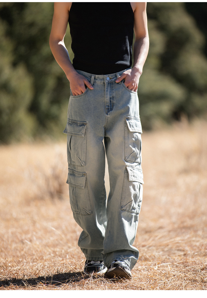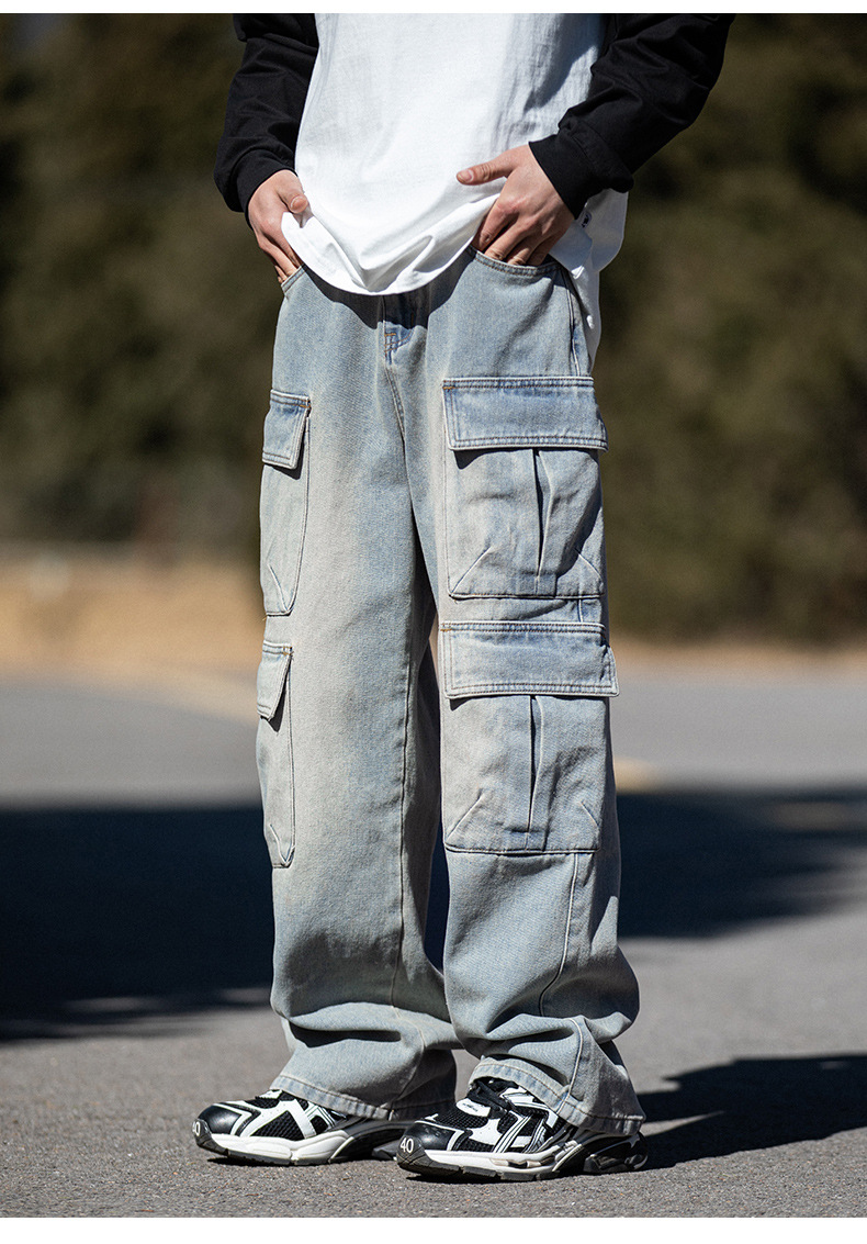 한루 남성복 아메리칸 레트로 멀티 포켓 워싱 데님 팬츠 남성 하이 스트리트 스트레이트 루즈핏 워크웨어 롱 팬츠