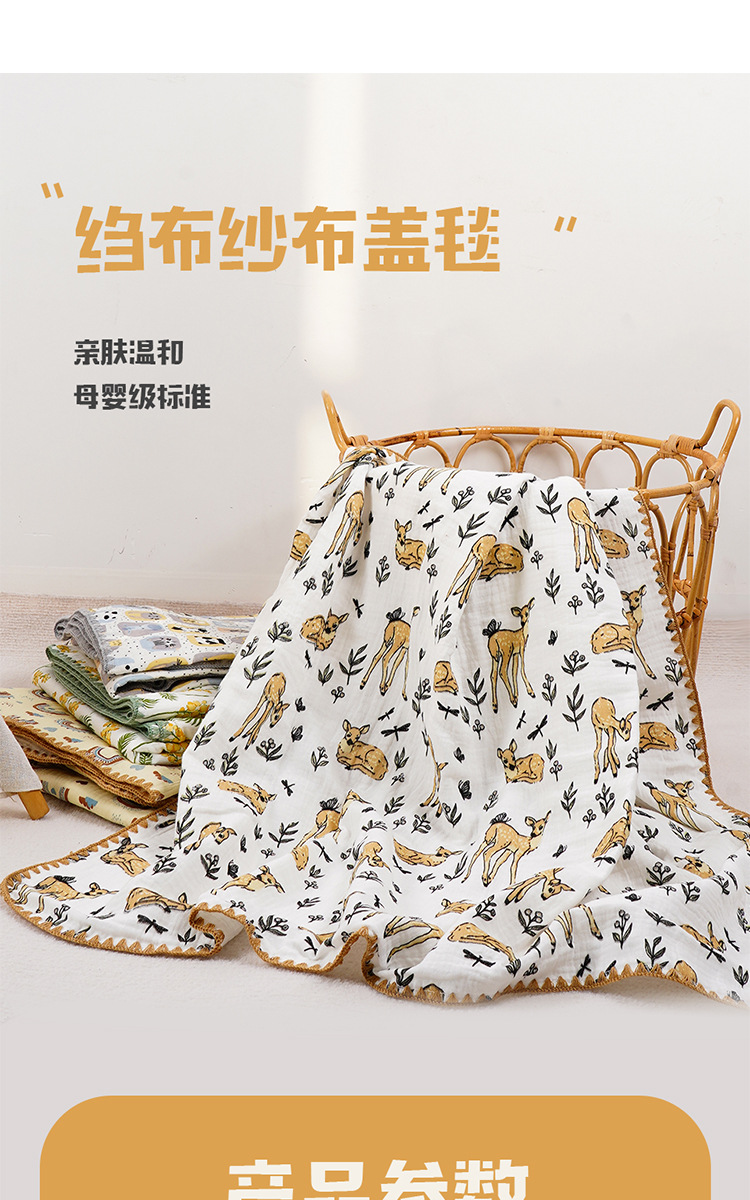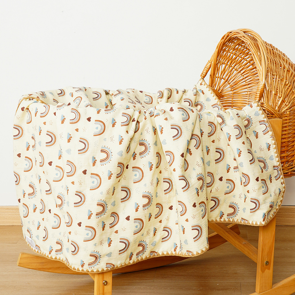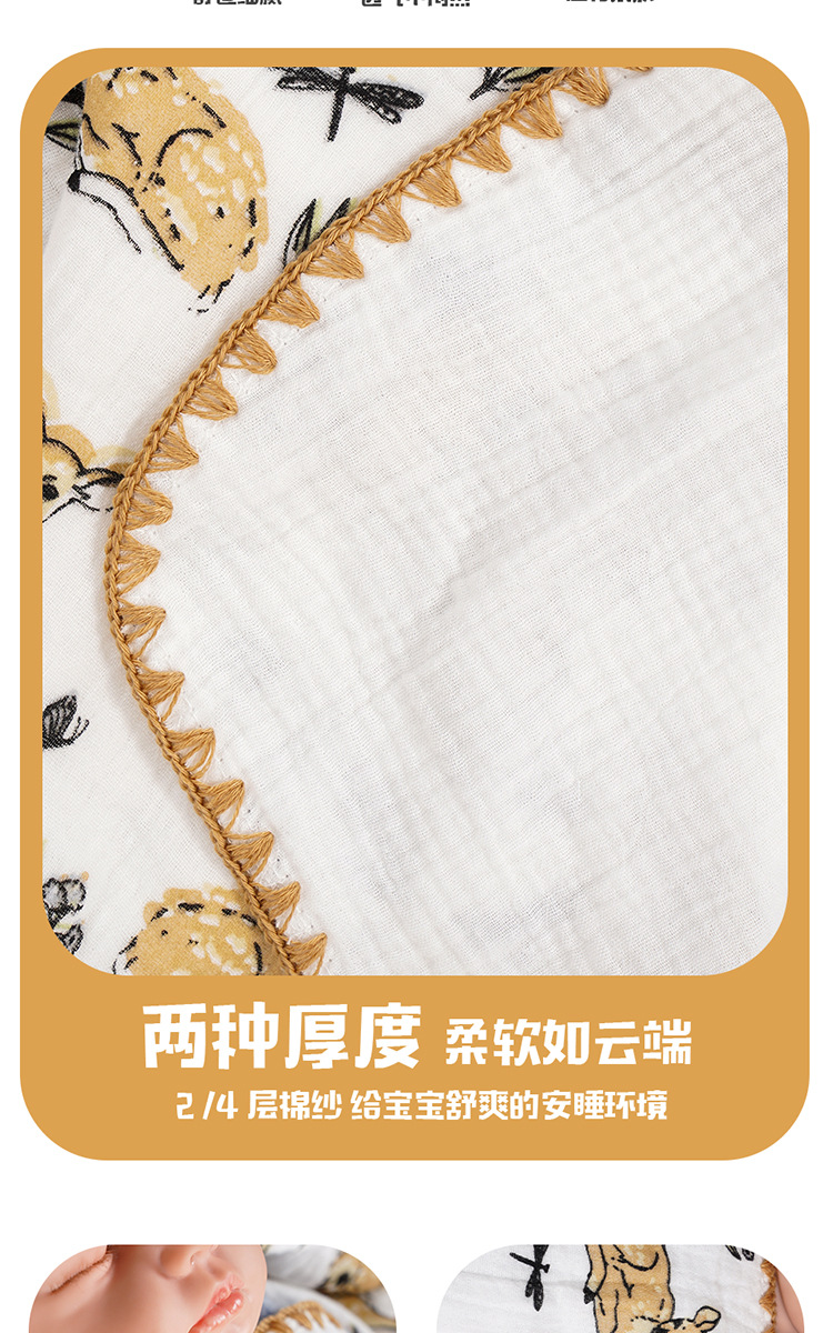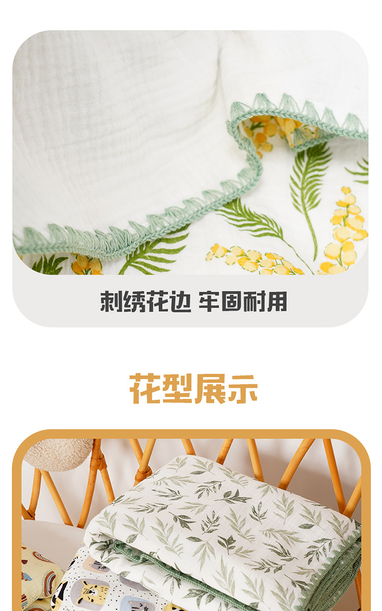 名称:Kangobaby新生儿绉布纱布盖毯4层刺绣花边宝宝棉纱毯子午睡小被子