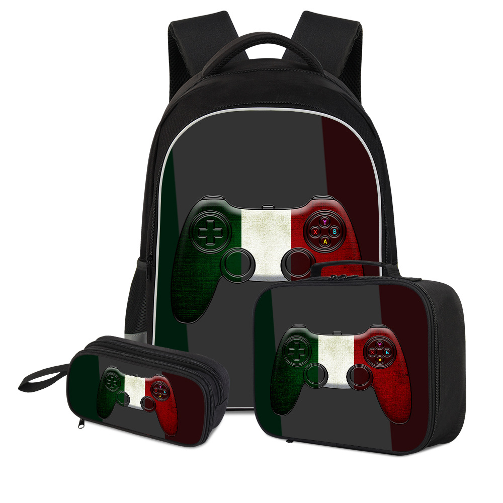 库博原创游戏手柄意大利国旗做旧书包三件套 学生双层背包笔袋餐包