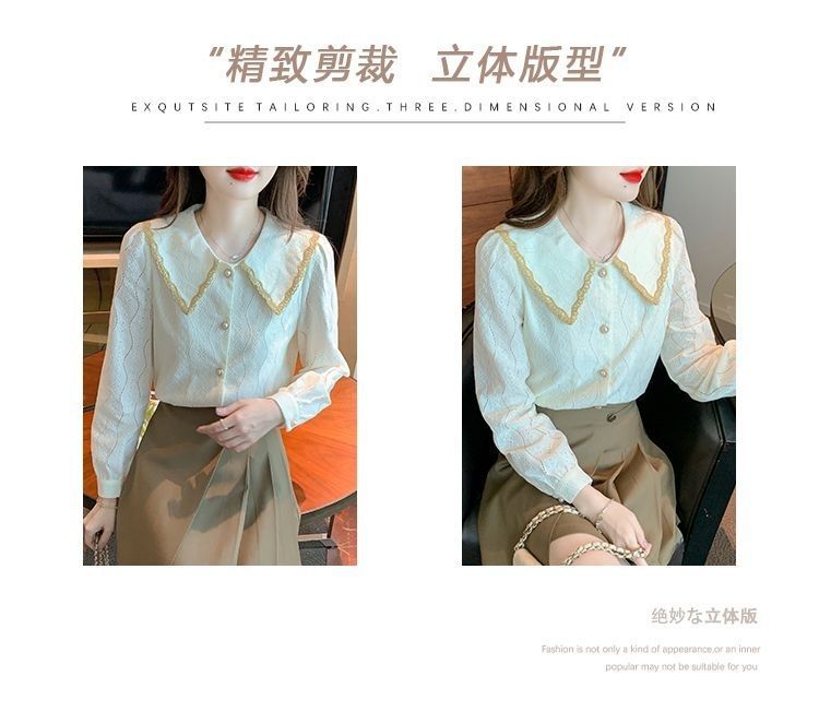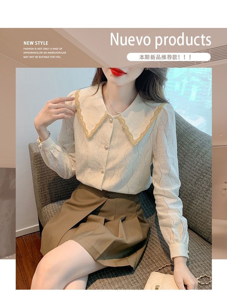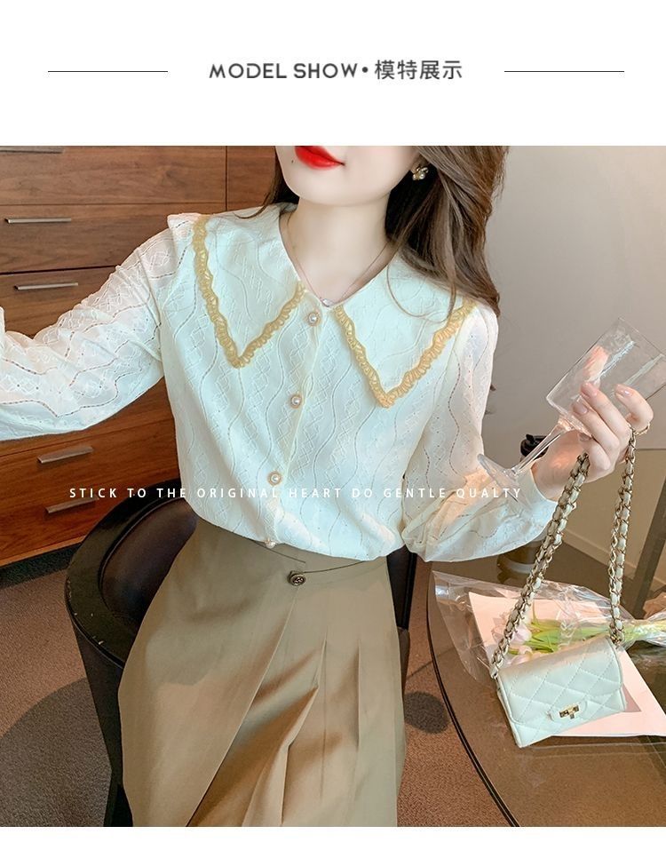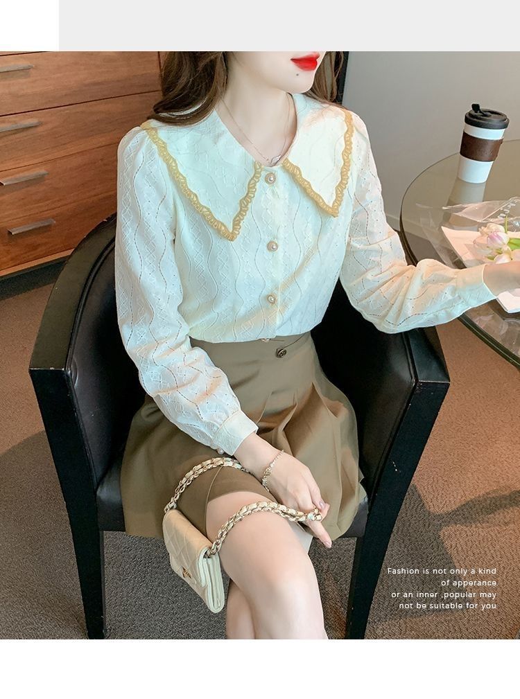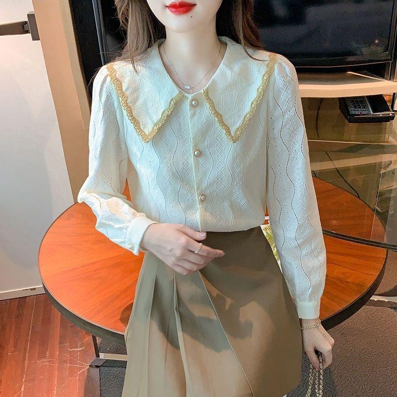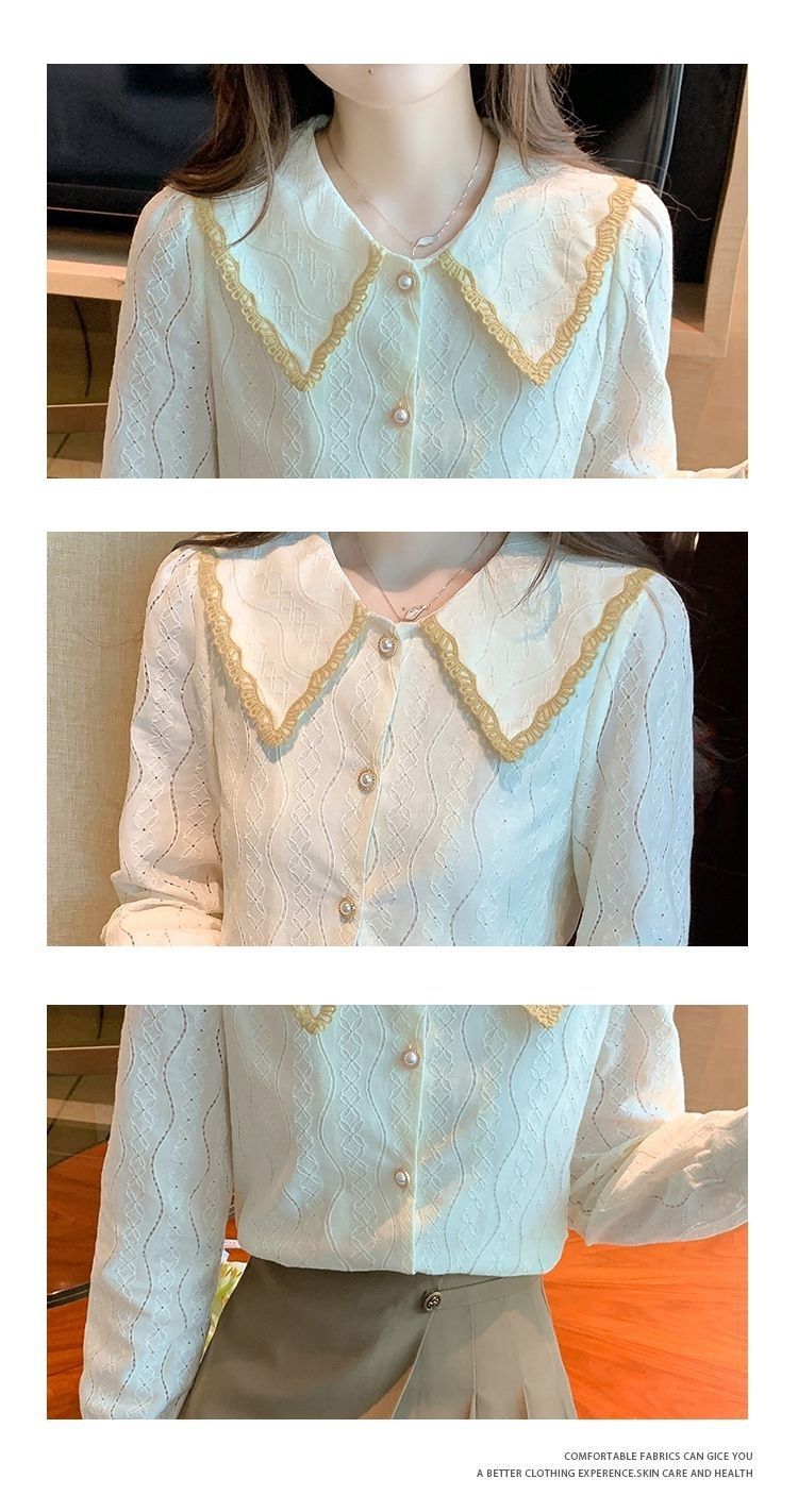 여성을위한 인형 칼라 쉬폰 셔츠 봄과 가을 새로운 2024 봄과 가을 유행 유행 유행 유행 레이스 바닥 셔츠스토어 가기