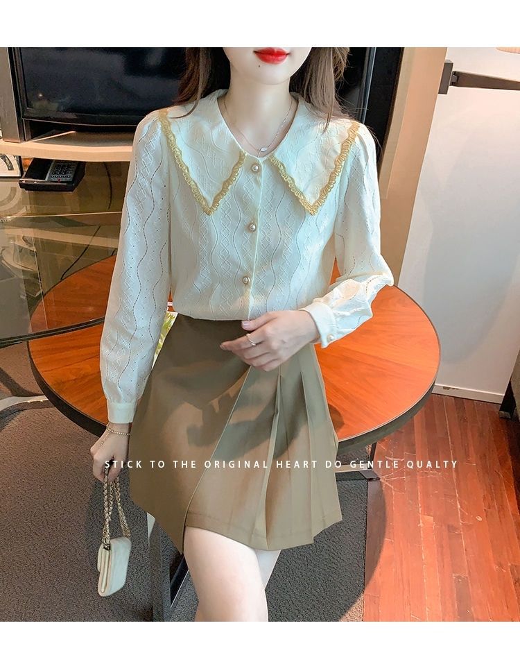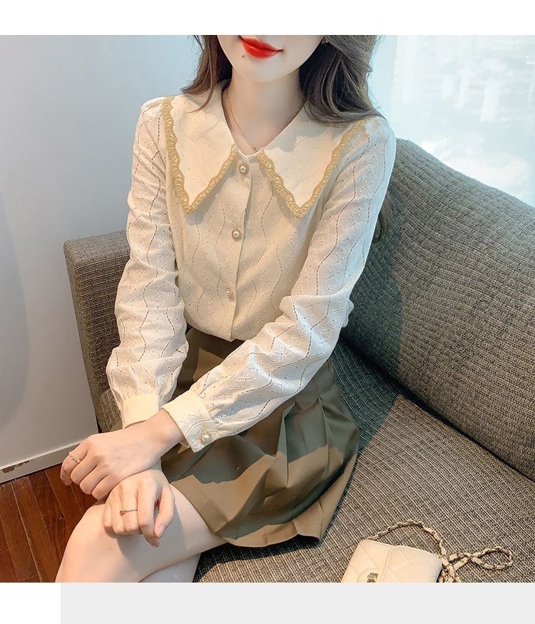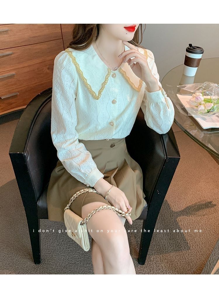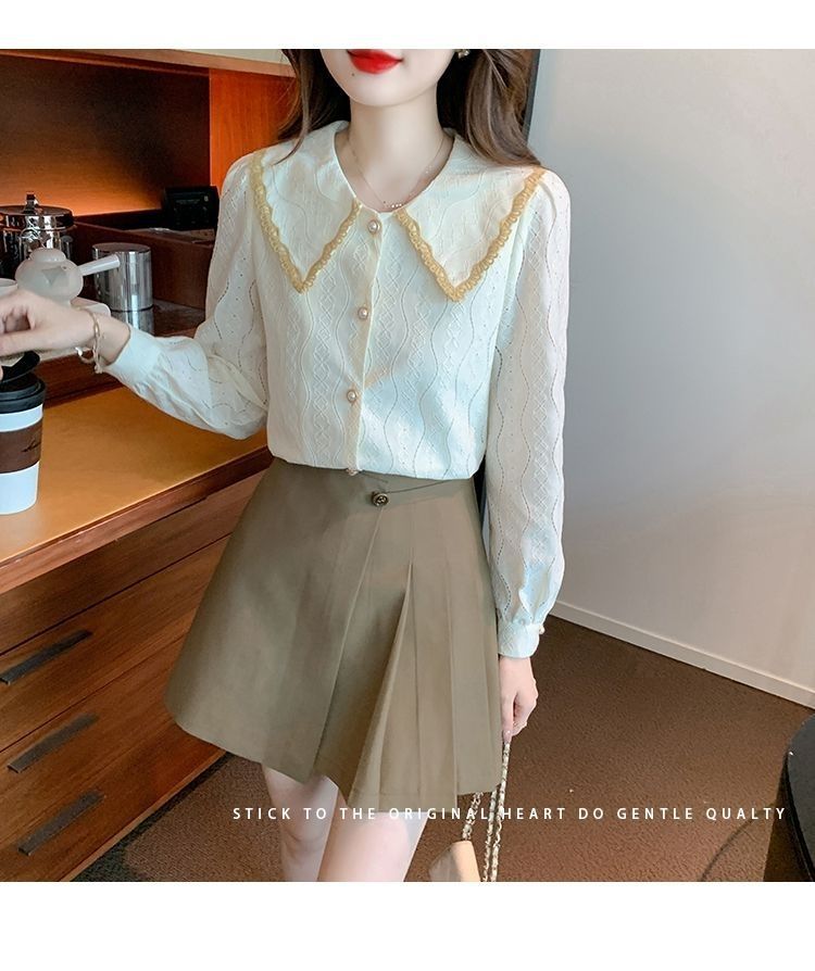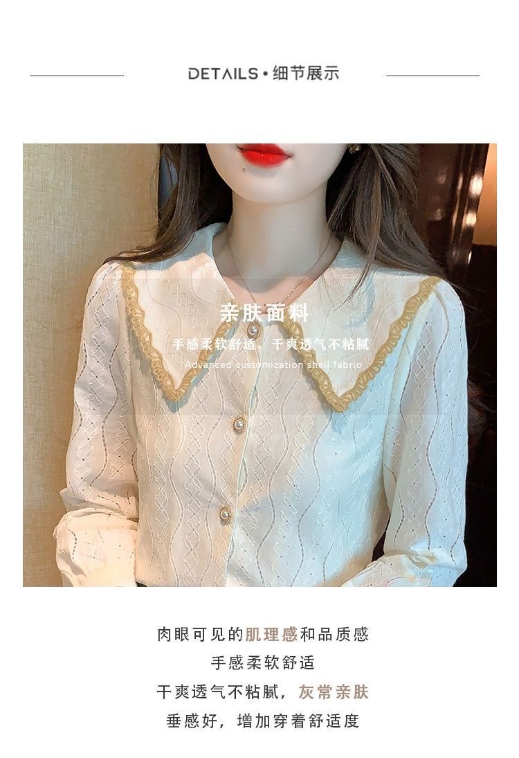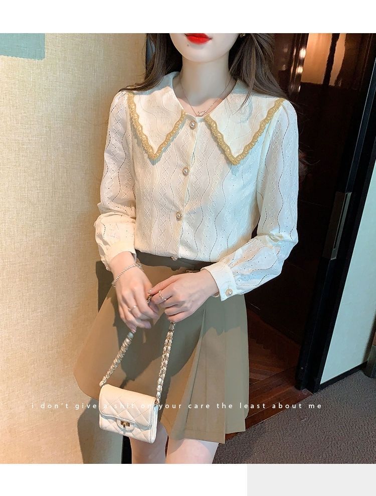 여성을위한 인형 칼라 쉬폰 셔츠 봄과 가을 새로운 2024 봄과 가을 유행 유행 유행 유행 레이스 바닥 셔츠스토어 가기