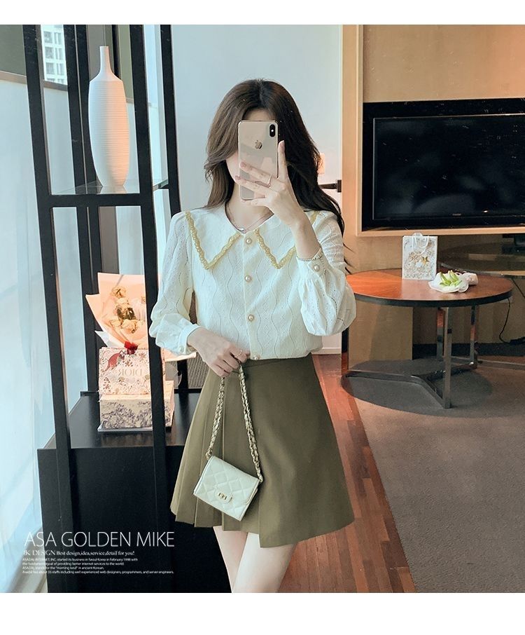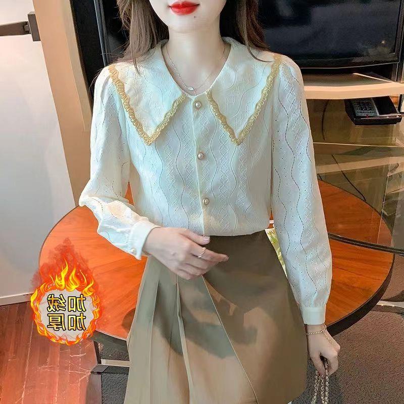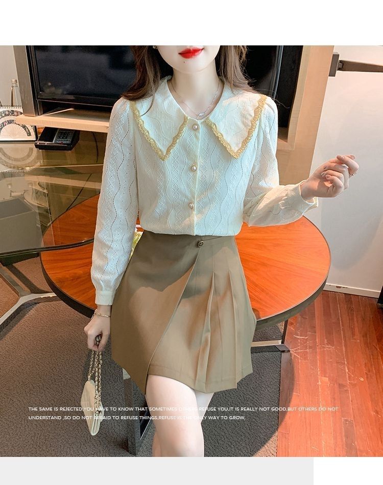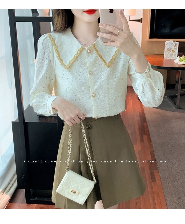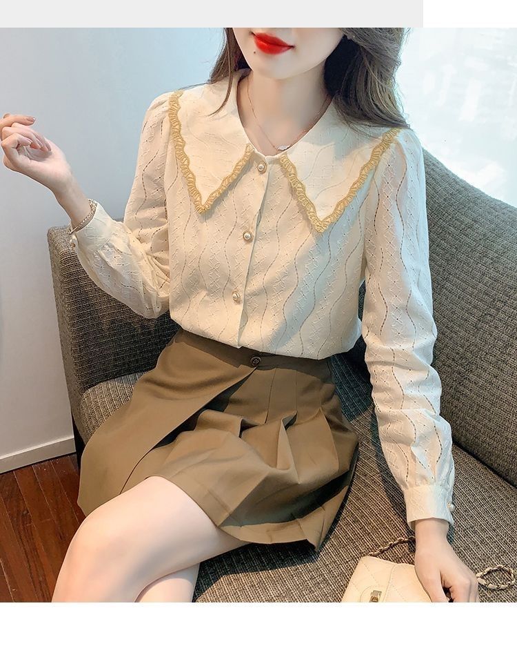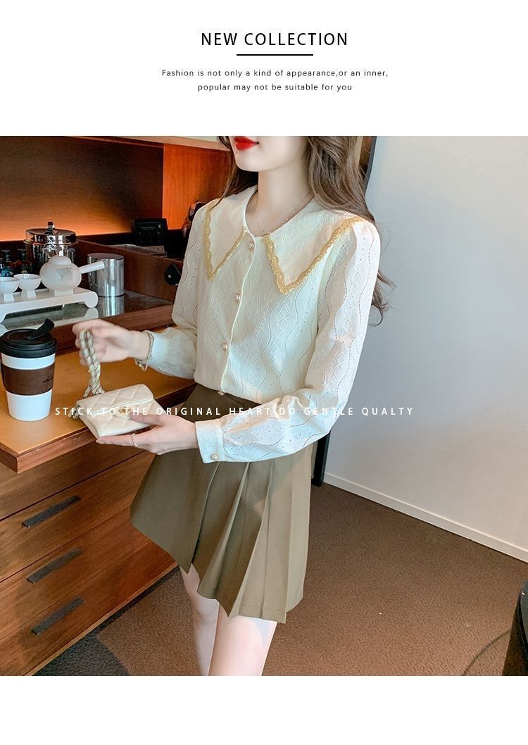 여성을위한 인형 칼라 쉬폰 셔츠 봄과 가을 새로운 2024 봄과 가을 유행 유행 유행 유행 레이스 바닥 셔츠스토어 가기
