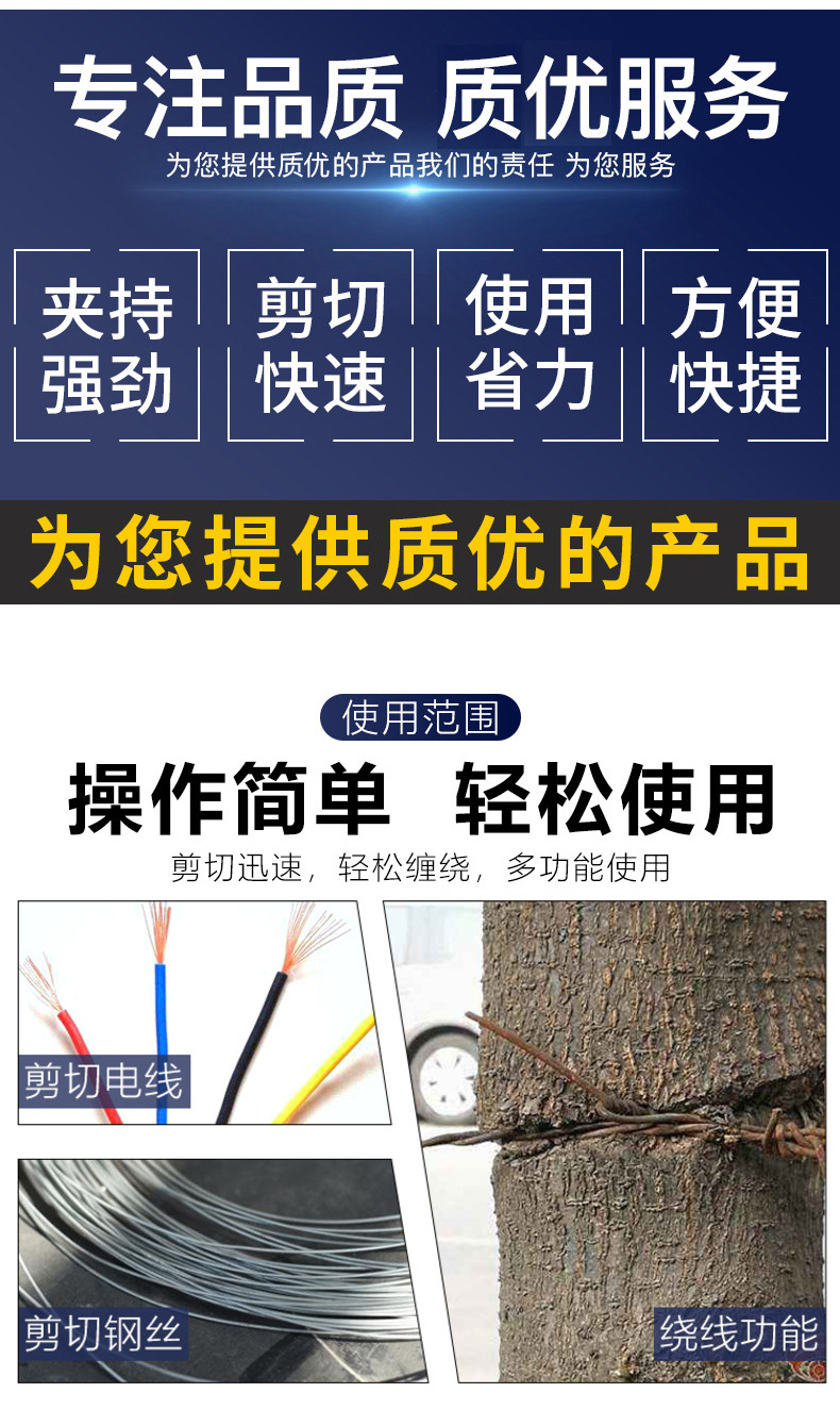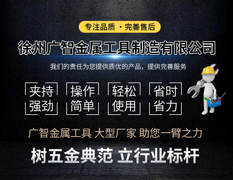 徐州广智金属工具制造有限公司是电缆剪、工业剪刀、剥线钳、金属工具等产品专业生产加工的公司,拥有完整、科学的质量管理体系。徐州广智金属工具制造有限公司的诚信、实力和产品质量获得业界的认可。公司一直以服务专业、顾客满意为经营宗旨,以求仁为大、求利为小、真正为人民服务的经营理念,开拓进取,务实创新,在做好经营的基础上,还以打造地方特色品牌为己任。在多年的经营中,坚持培养高素质员工,不断优化生产技术,用品质和服务让客户回头的经营原则;实行品质为先、快速加工,依靠专业能力获取公平回报的经营策略。坚持快速销售、合理定价,要求销售人员与客户心对心联络、面对面交流。同时,公司坚持规范经营,不追求高利润率,坚守价值底线、拒绝利益诱惑,坚持以专业能力从市场获取公平回报,是获得成功的基石。欢迎各界朋友莅临参观、指导和业务洽谈。