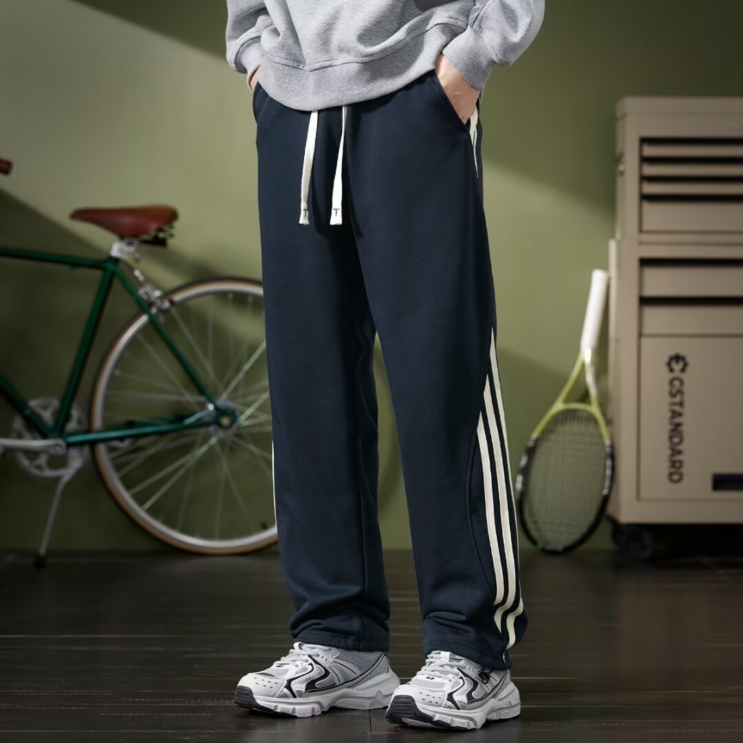 새로운 스트레이트 드레이핑 스웨트 팬츠 봄 남자 시즌 새로운 사이드 스트라이프 느슨한 올 매치 플러스 사이즈 스포츠 캐주얼 바지 남성 바지