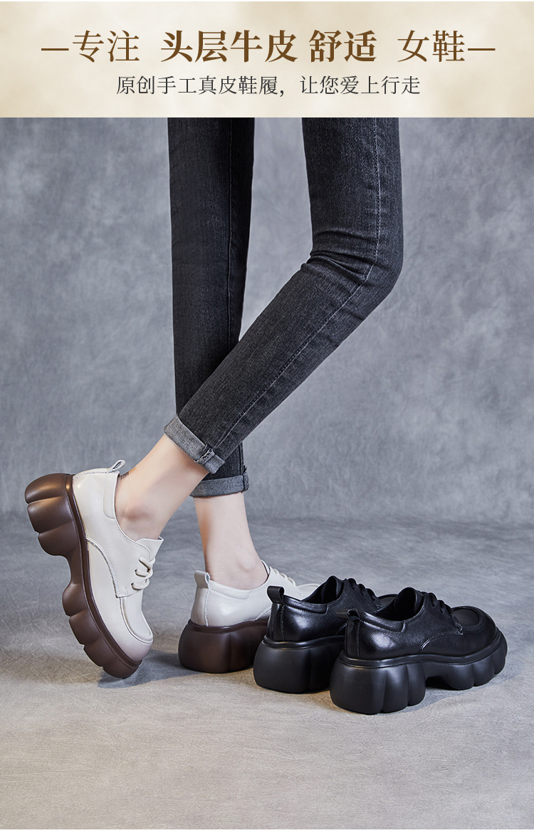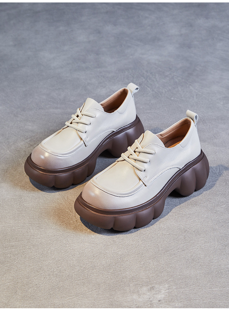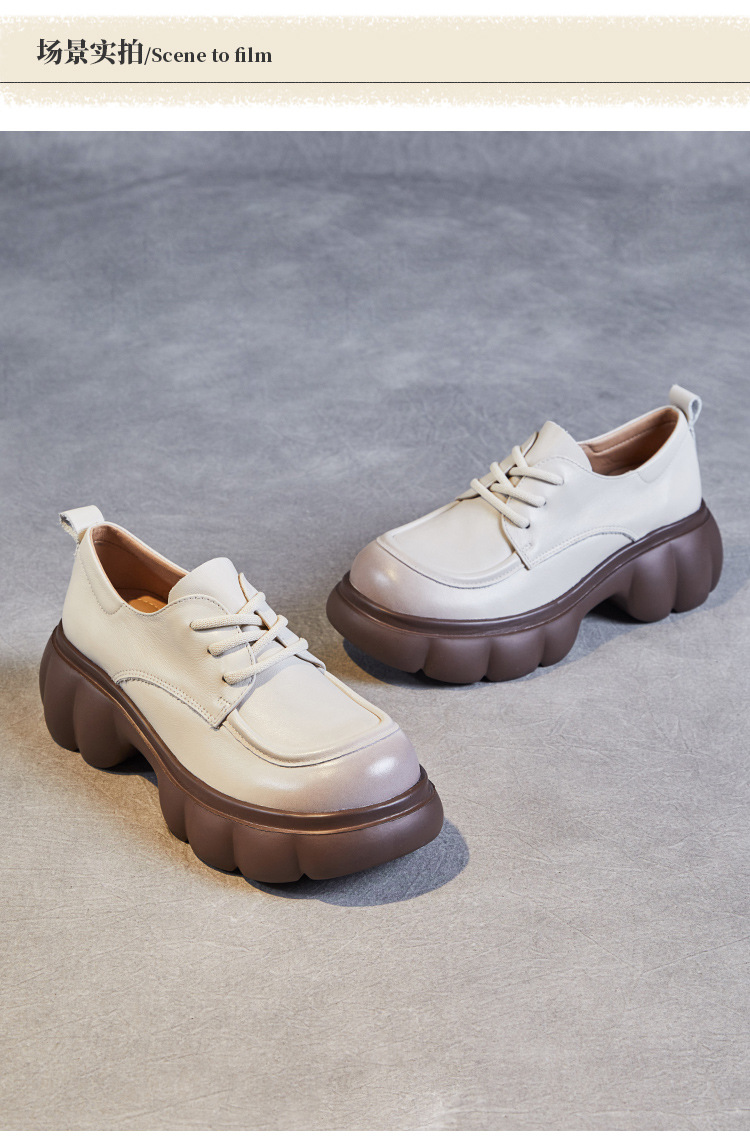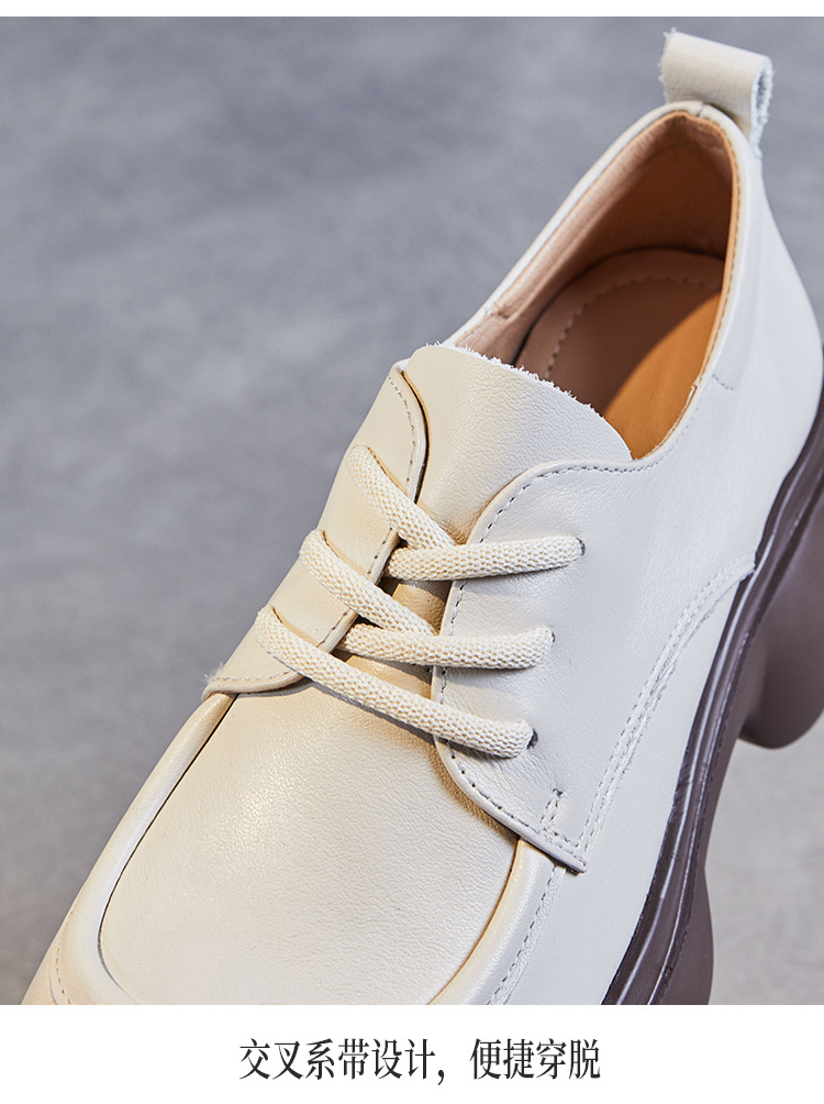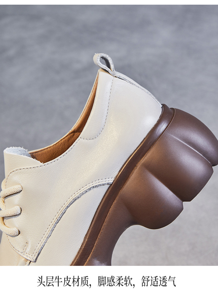 2024 봄 새로운 베이지 색 가죽 레이스 업 플랫폼 로퍼 여성 영국 스타일 올 매치 깊은 입 신발스토어 가기