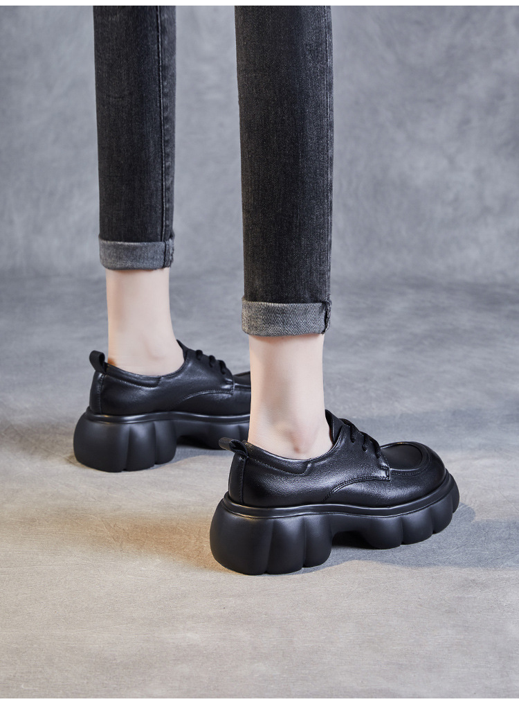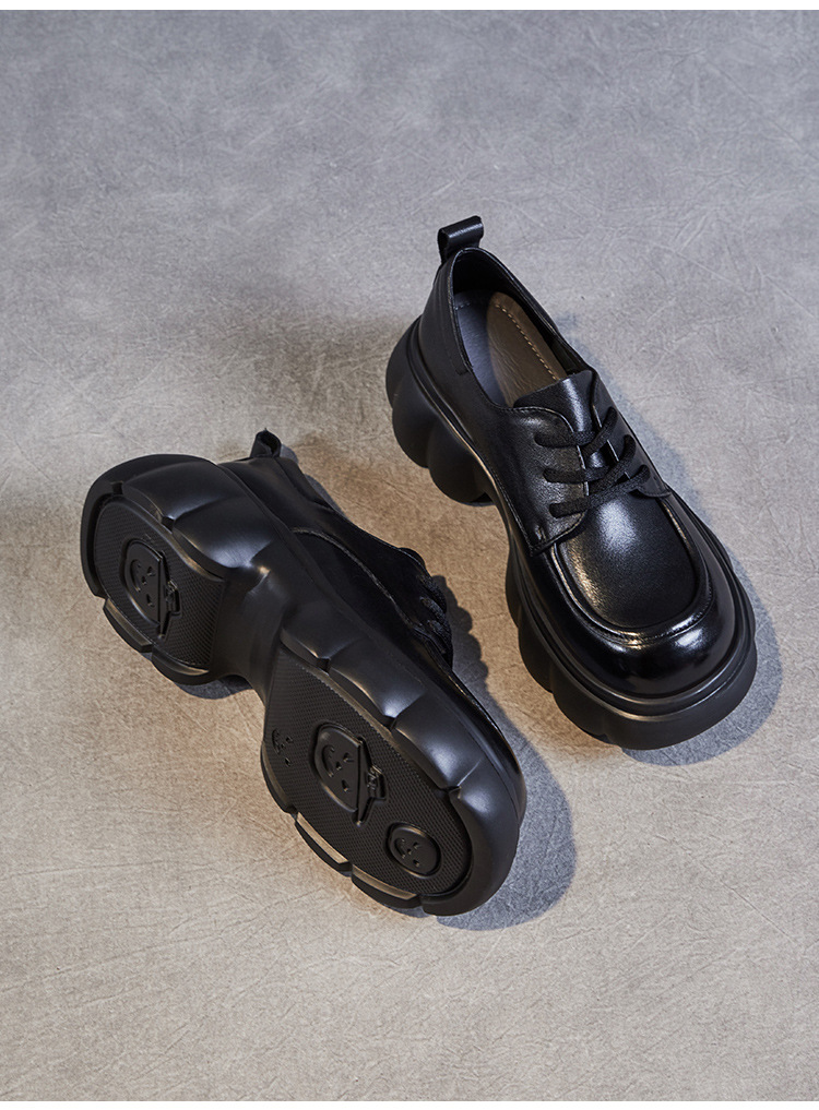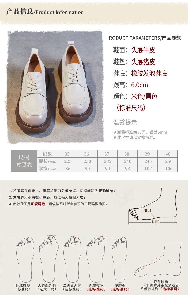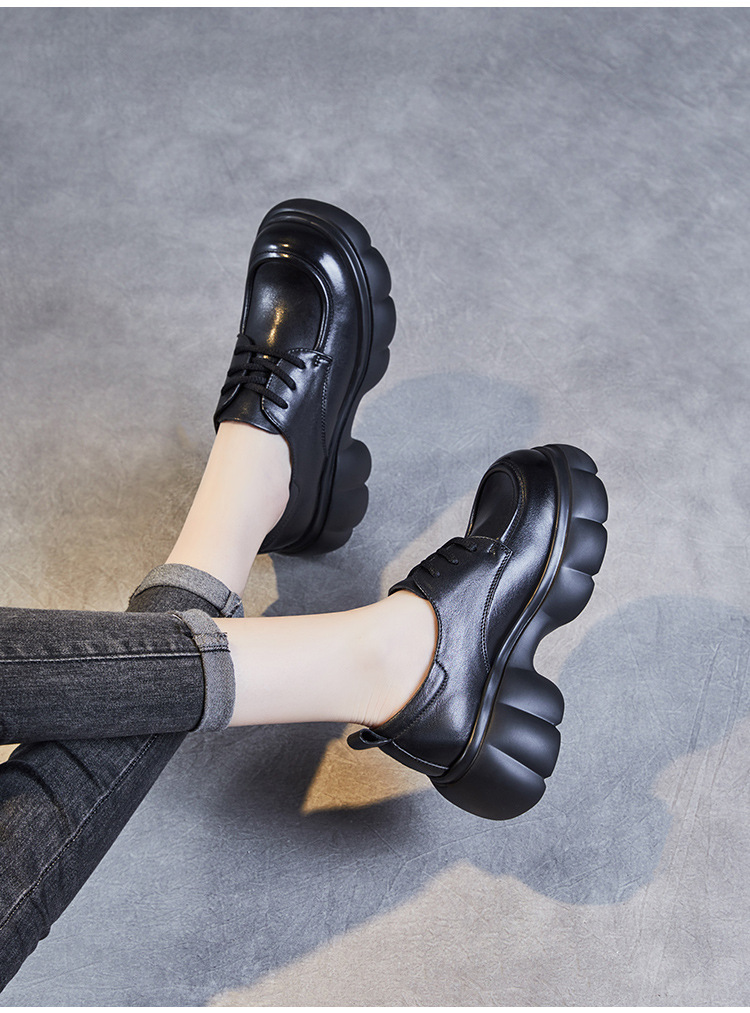 2024 봄 새로운 베이지 색 가죽 레이스 업 플랫폼 로퍼 여성 영국 스타일 올 매치 깊은 입 신발스토어 가기