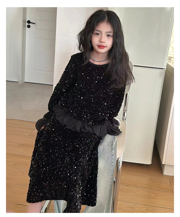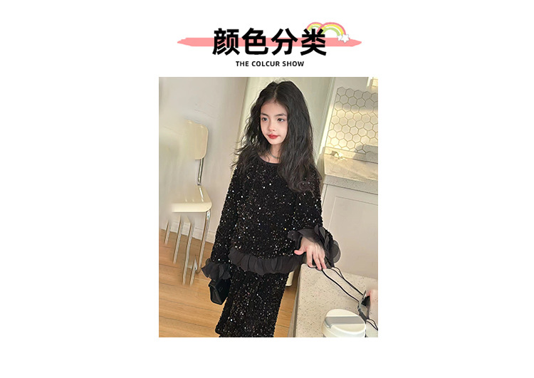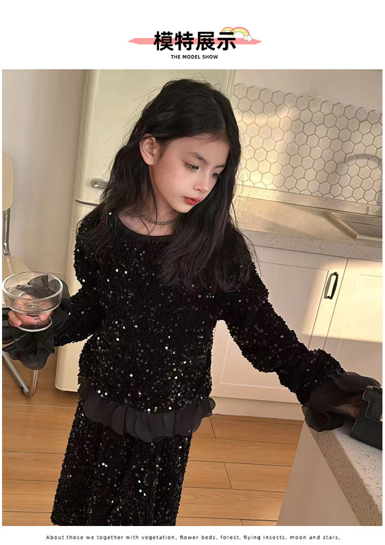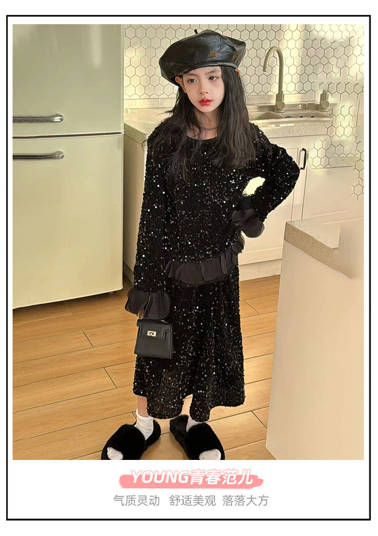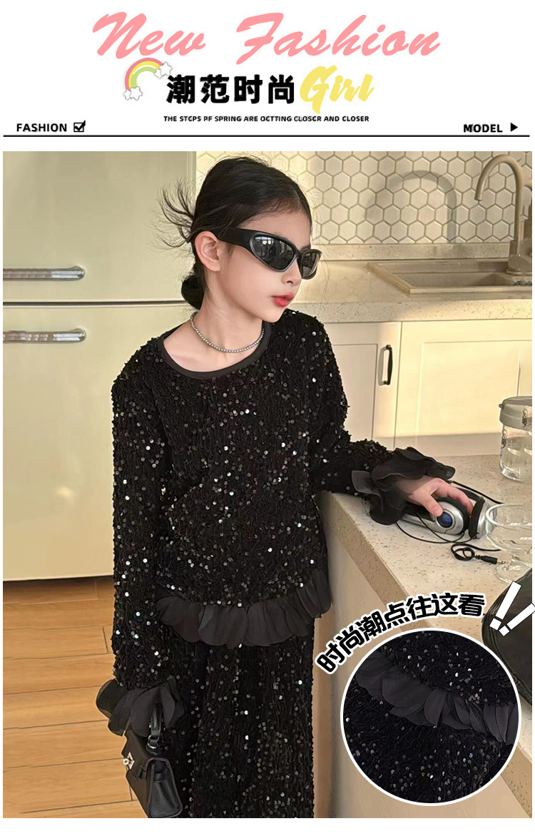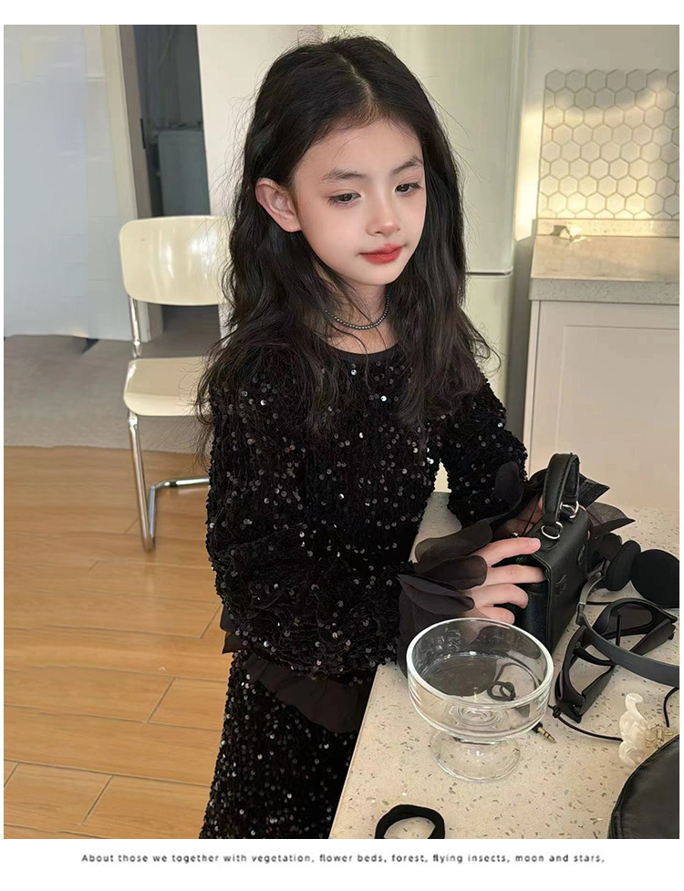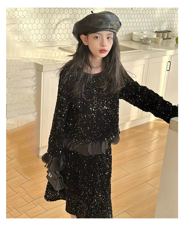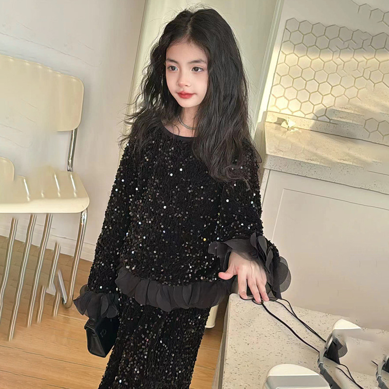 소녀의 봄과 가을 2024 새로운 서양식 어린이 긴팔 봄 옷 유행 소녀 큰 아이들 세트 스팽글 무거운 작업 스커트 패션스토어 가기