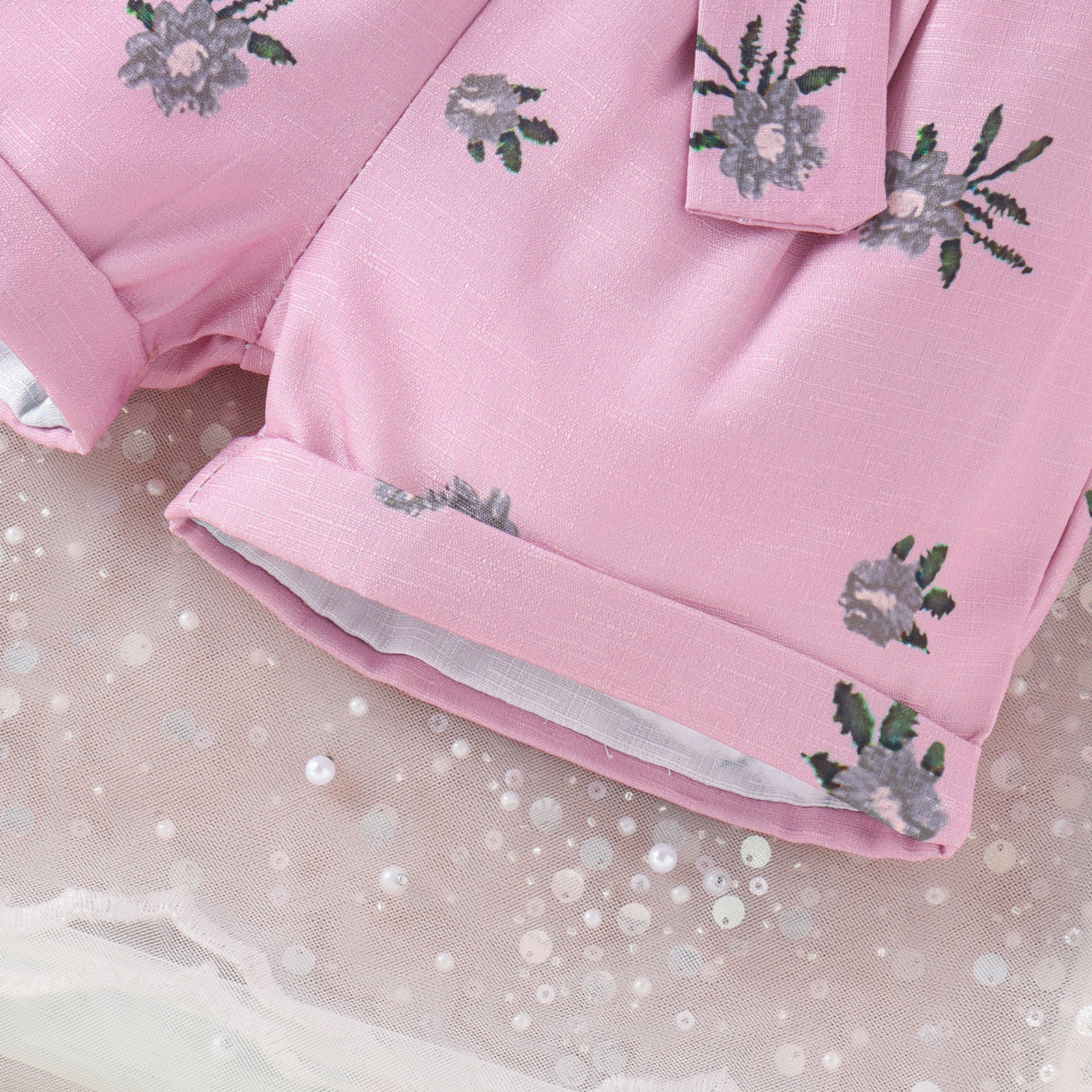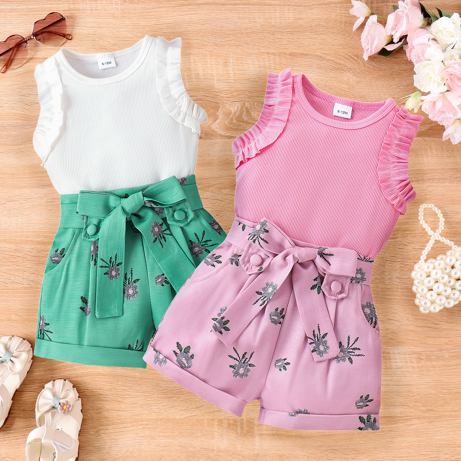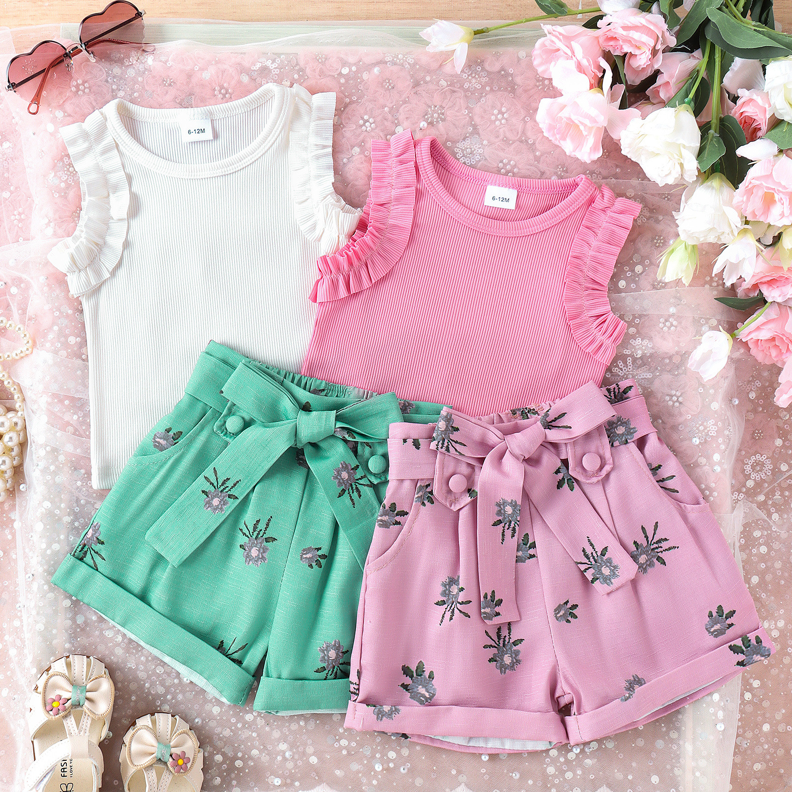 바옥신 아동복 국경 유럽 및 미국 여름 중소형 소녀 피트 스트립 레이스 탑 프린트 반바지 벨트 세트