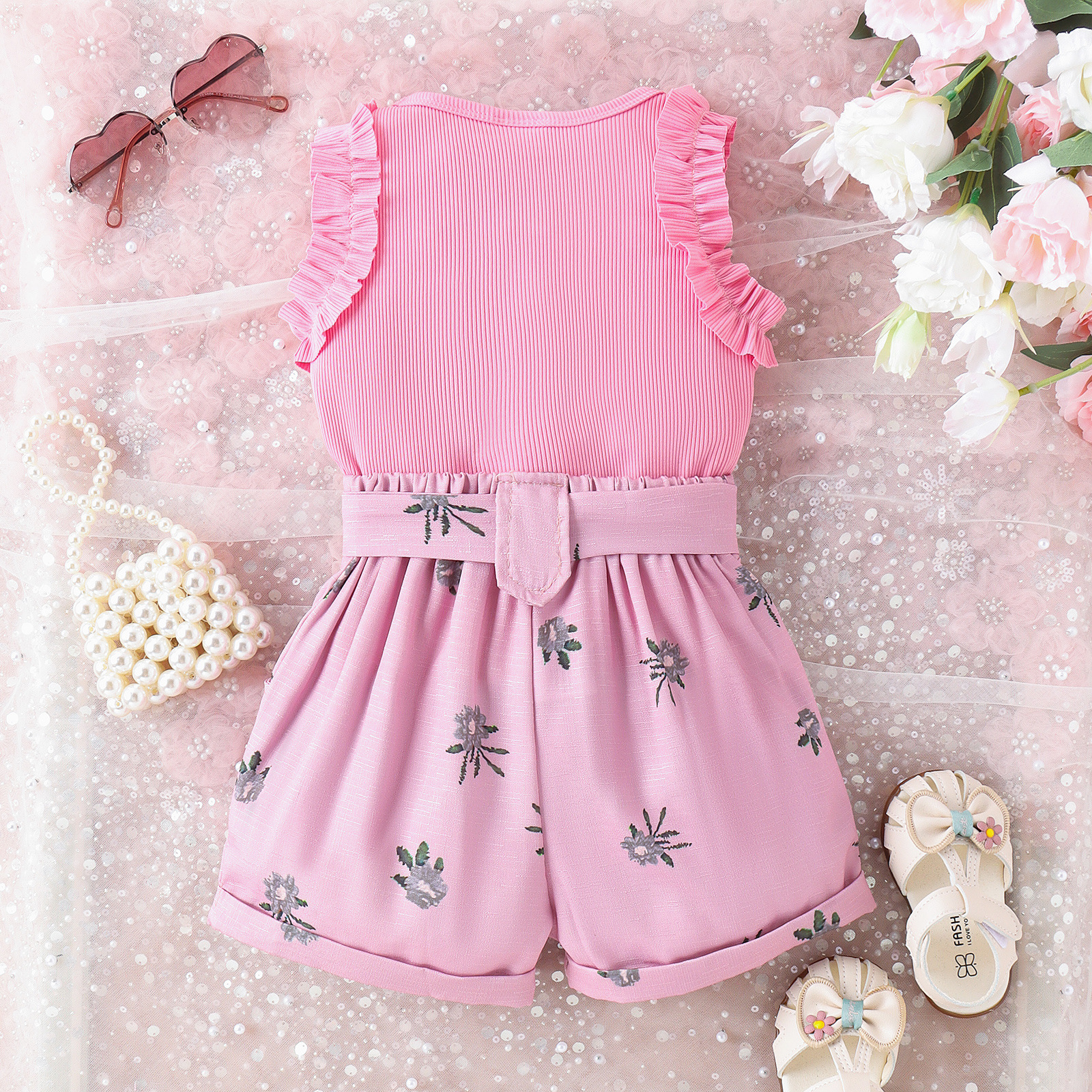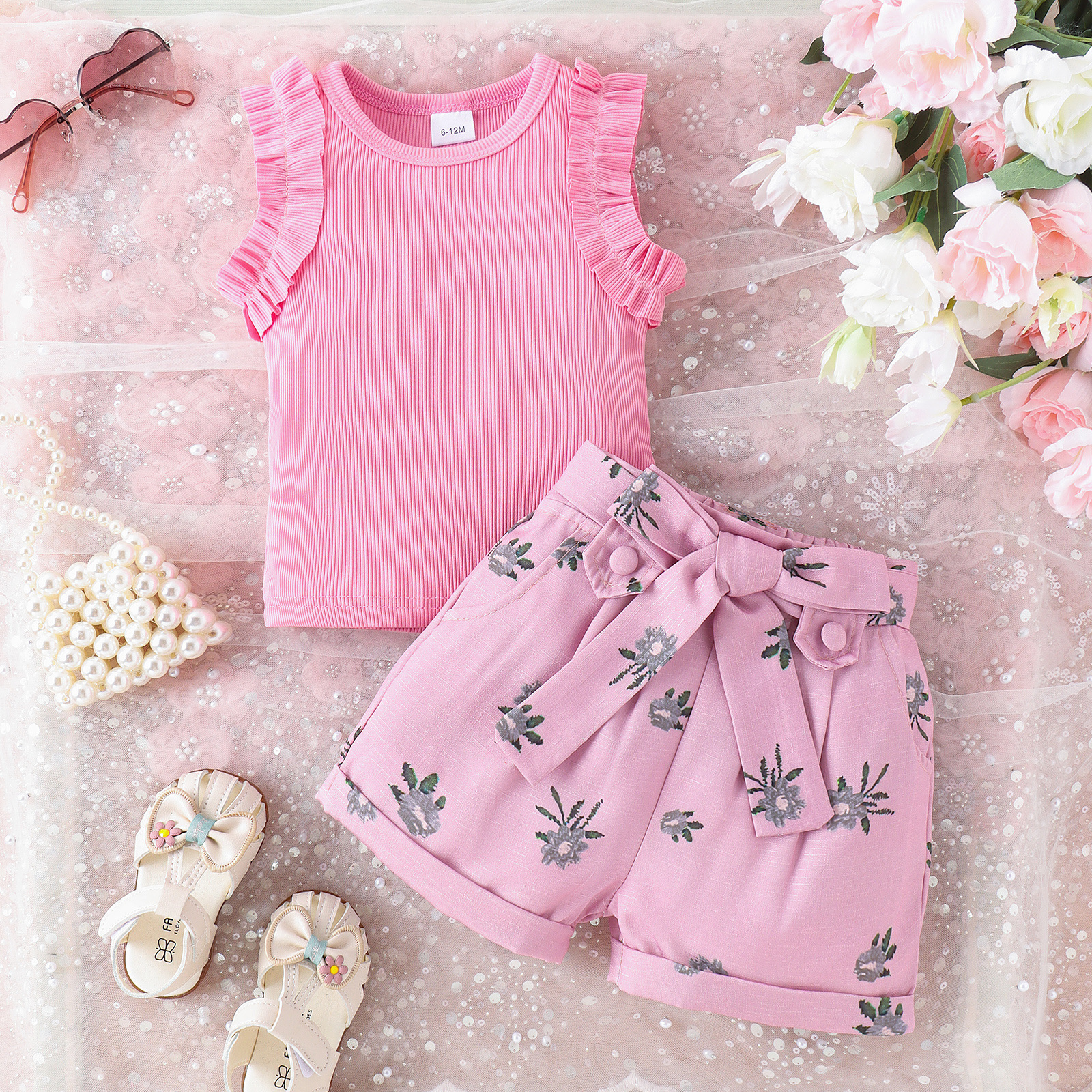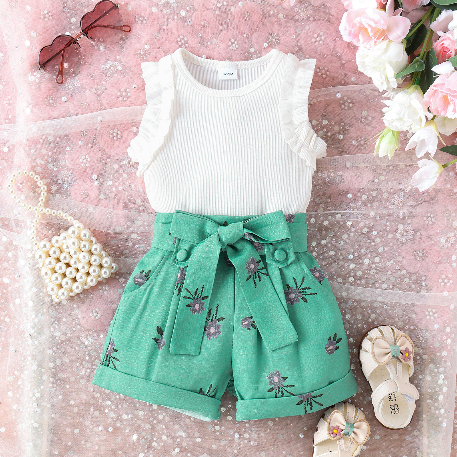 바옥신 아동복 국경 유럽 및 미국 여름 중소형 소녀 피트 스트립 레이스 탑 프린트 반바지 벨트 세트