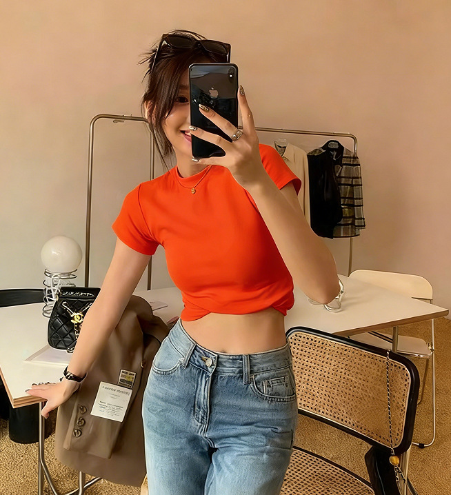 새로운 대외 무역의 국경 밑바닥 슬림 반팔 티셔츠 여성 한국어 버전 슬림 짧은 패션 최고 여성 조수 도매스토어 가기