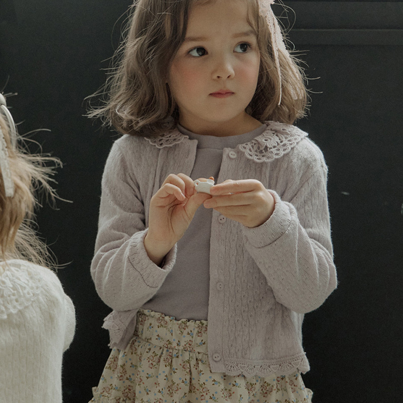 봄 2024 딸기 샨 한국 소녀 어린이 부드러운 2 색 니트 레이스 니트 카디건 재고스토어 가기
