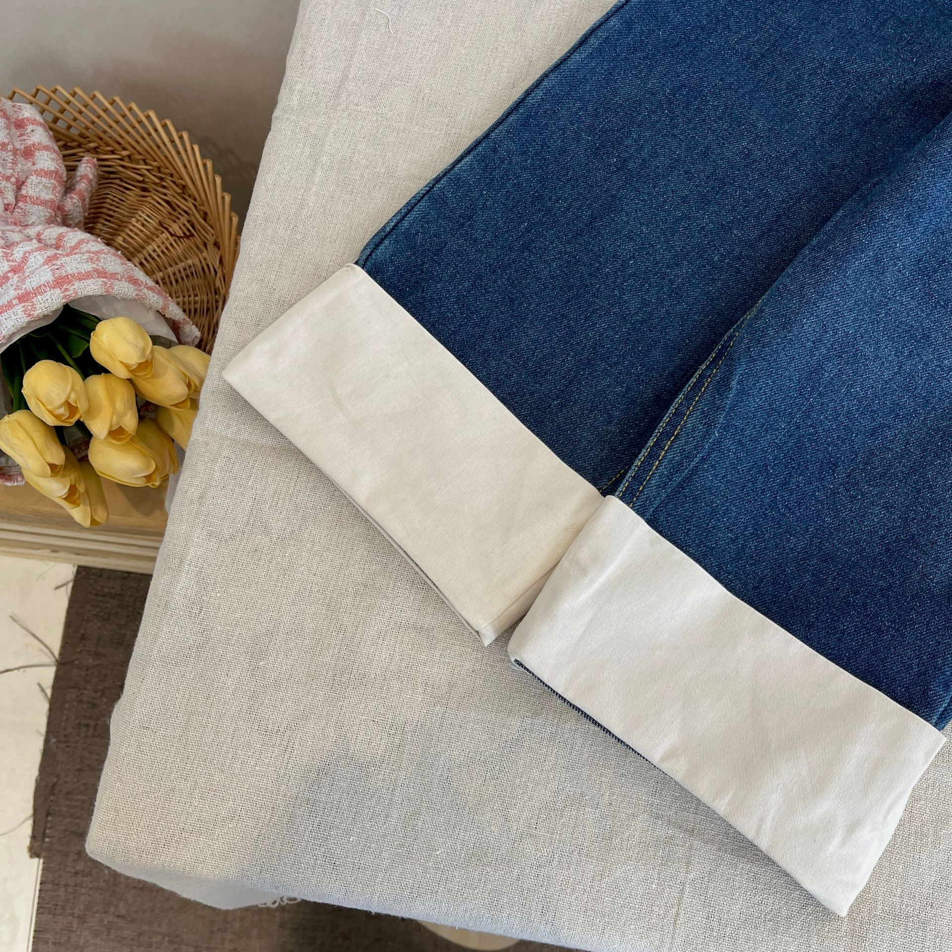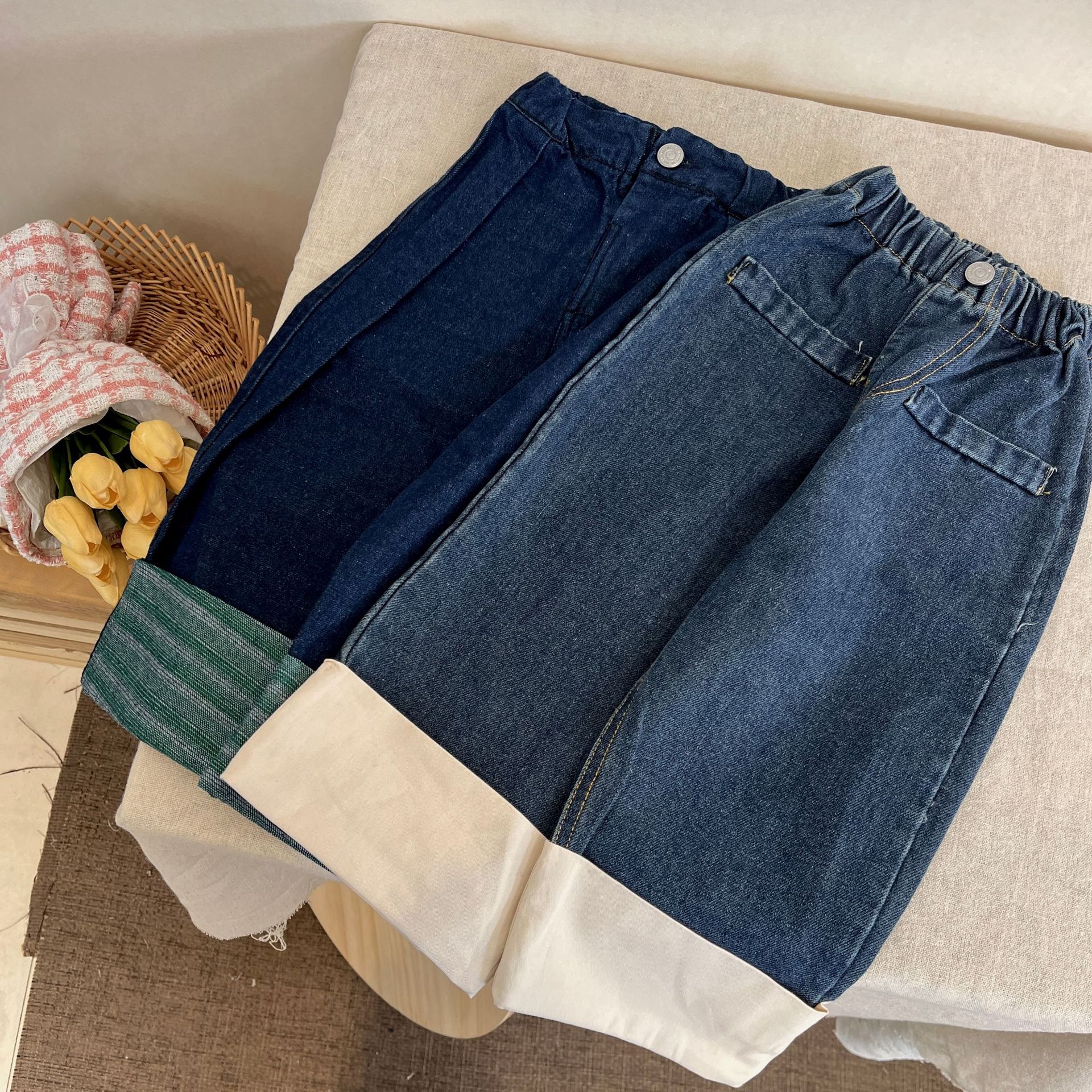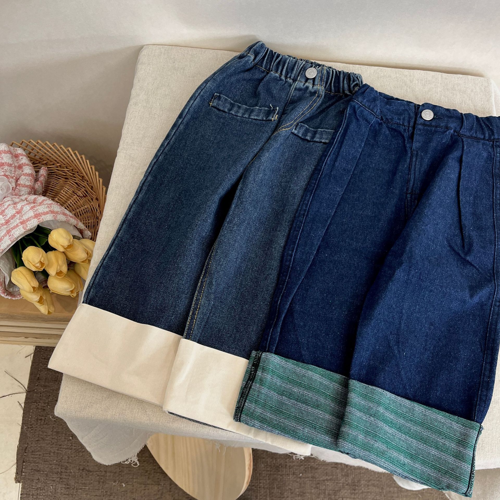 재고 정리~ 아동용 밑단 접이식 데님 팬츠 유치원용 다용도 부드러운 데님 밑단 접이식 스트라이프 긴바지 트렌디스토어 가기