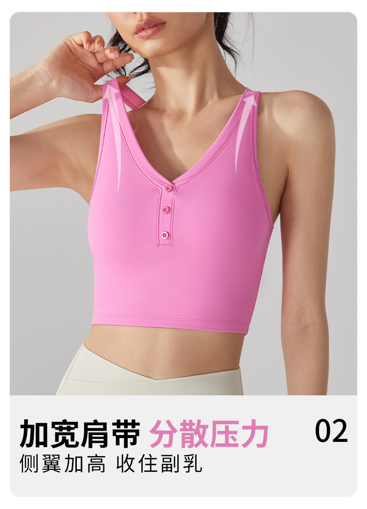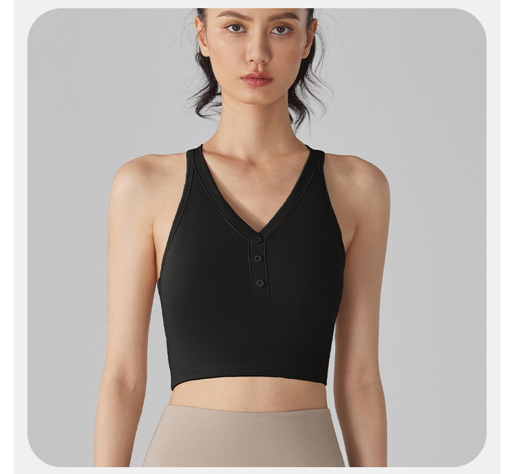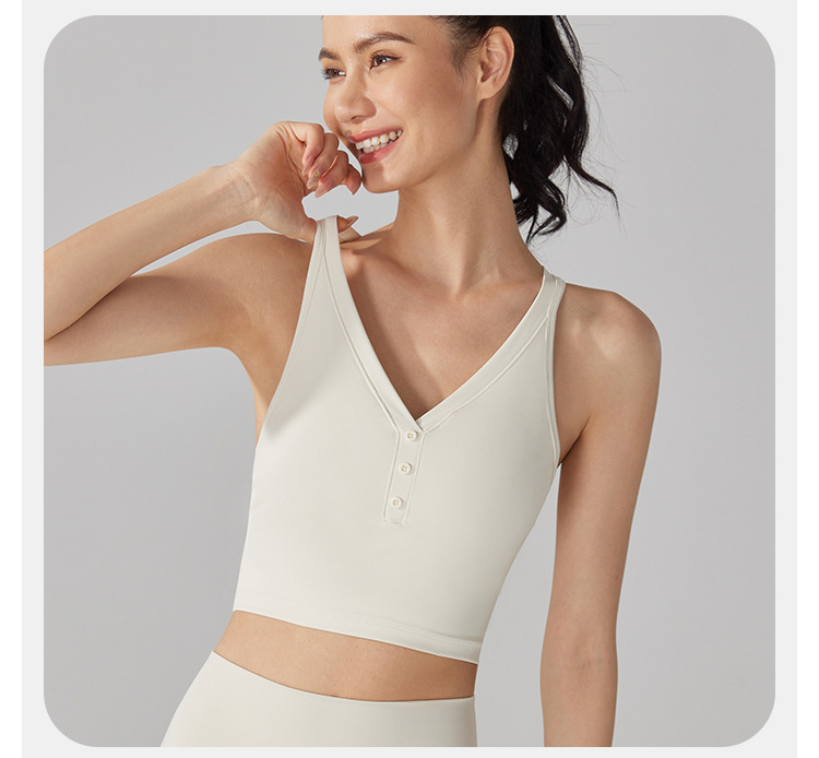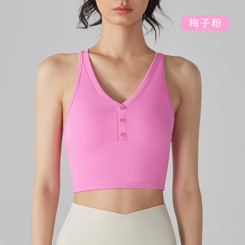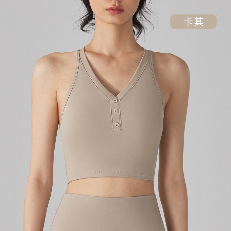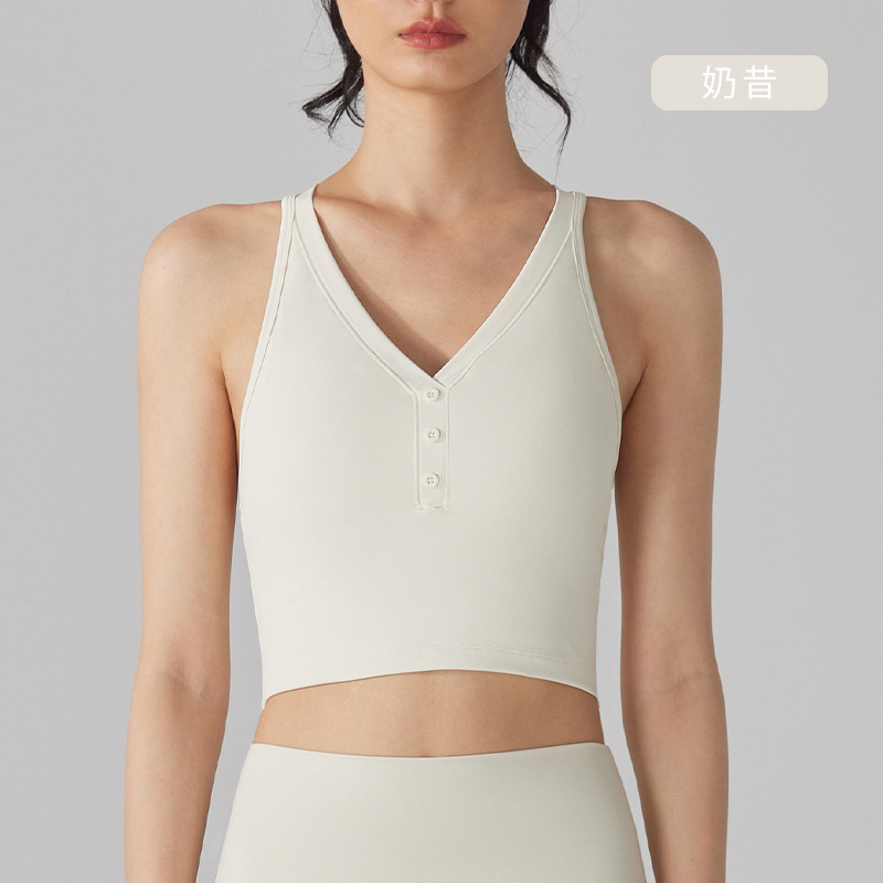 여성을위한 가슴 패드 충격 방지 크로스 백 브라 요가 의류 최고 피트니스 조끼가있는 여름 V 넥 버튼 스포츠 조끼스토어 가기