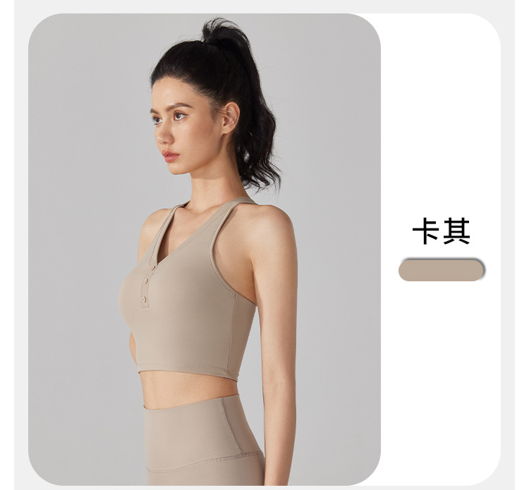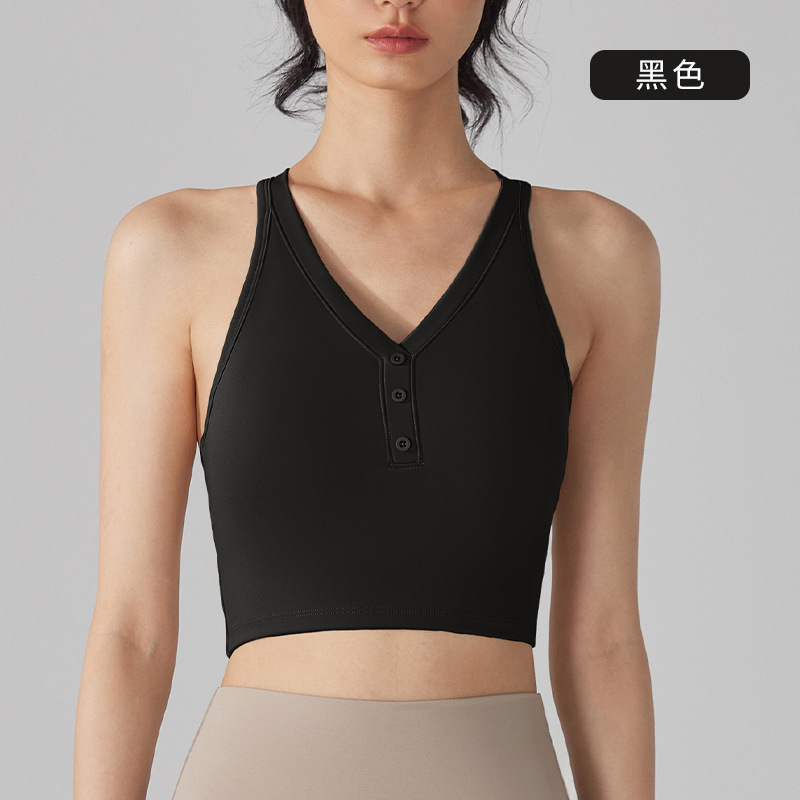 여성을위한 가슴 패드 충격 방지 크로스 백 브라 요가 의류 최고 피트니스 조끼가있는 여름 V 넥 버튼 스포츠 조끼