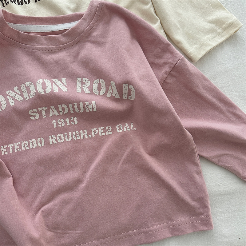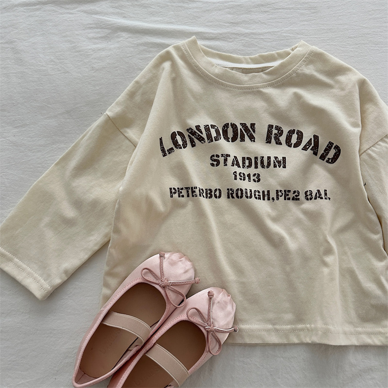 Xifan 2025 봄 신제품 어린이 한국 스타일 솔리드 컬러 인쇄 편지 티셔츠 소년과 소녀 긴팔 라운드 넥 탑스토어 가기