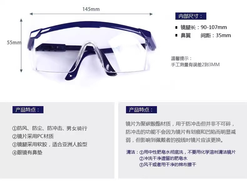 사이클링 방풍 고글 망원경 블루 블랙 프레임 플라스틱 안경 보호 방진 단양 안경 도매