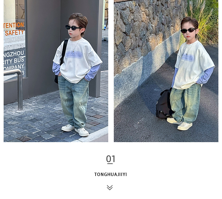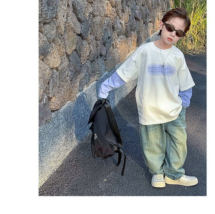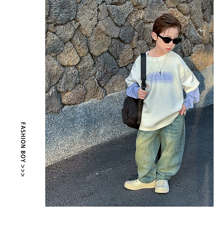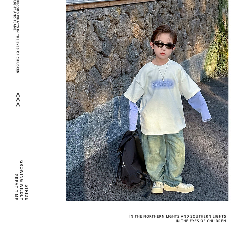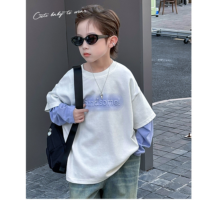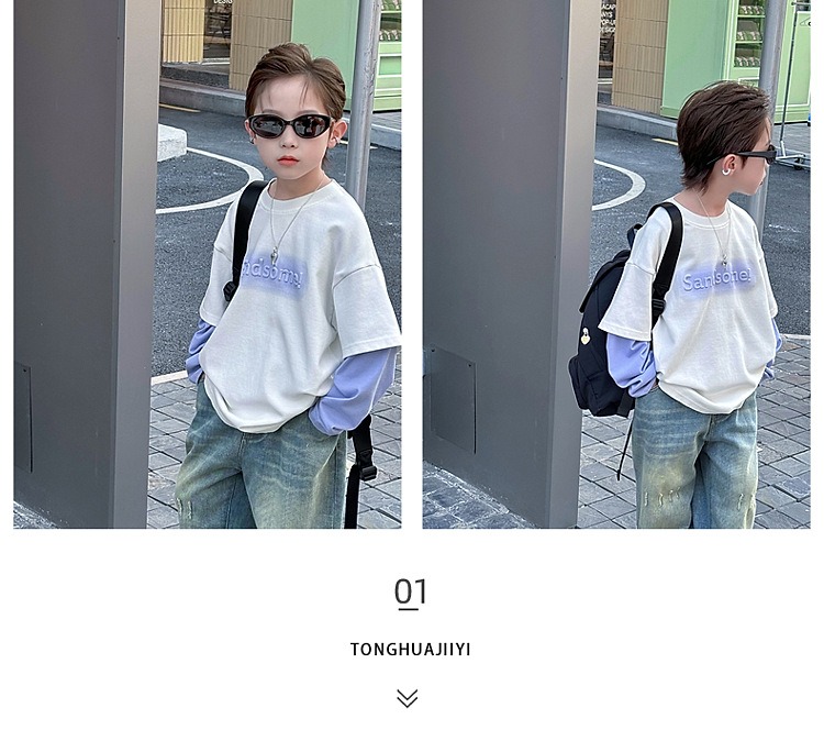 동화 메모리 소년 긴팔 티셔츠 봄 의류 2025 새로운 어린이 봄 가짜 투피스 화이트 코튼 탑 봄스토어 가기
