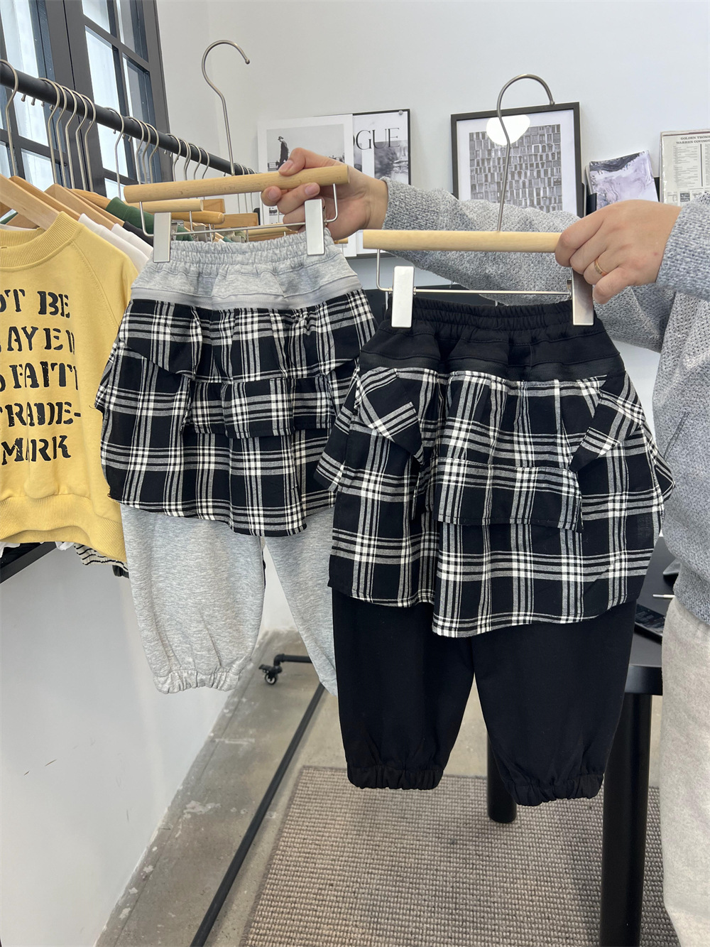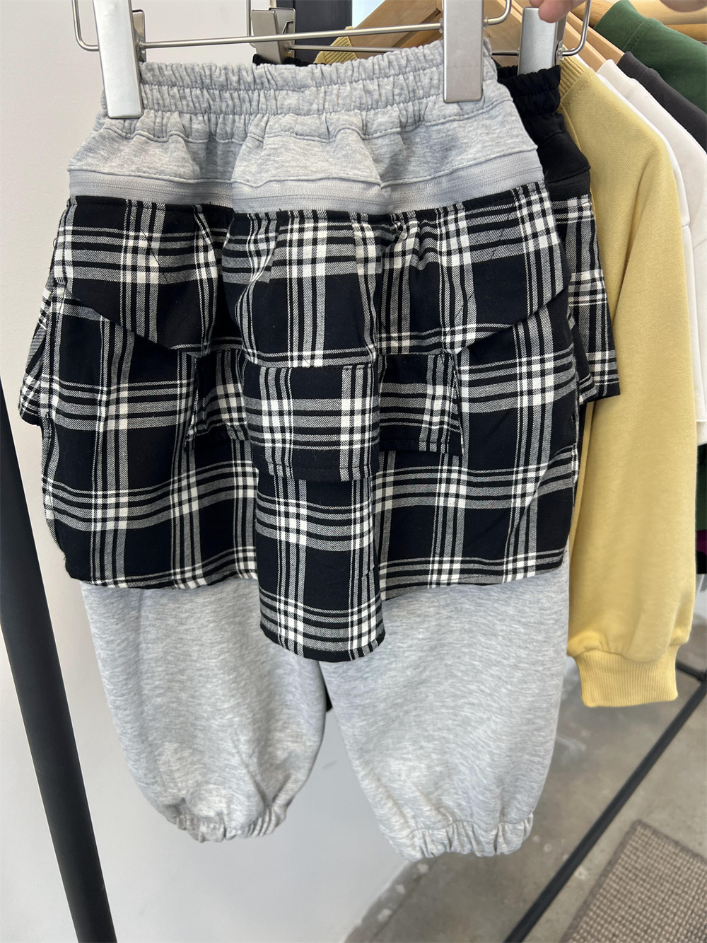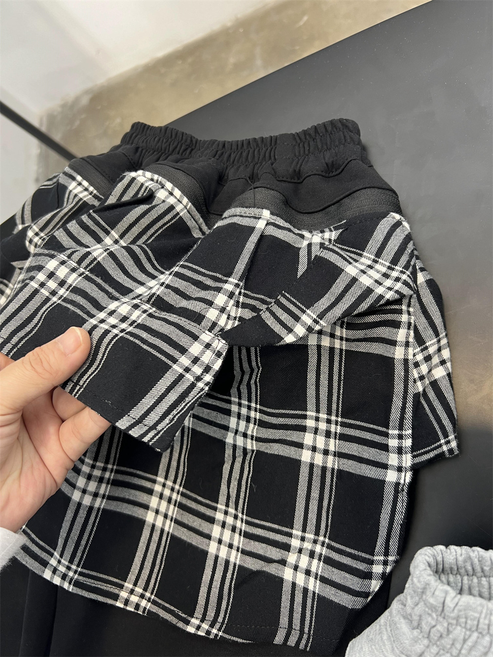 2024 봄 어린이 가짜 2 피스 방귀 커튼 바지 소년과 소녀 아메리칸 스트리트 댄스 격자 무늬 패치 워크 바지 분리 가능한 바지