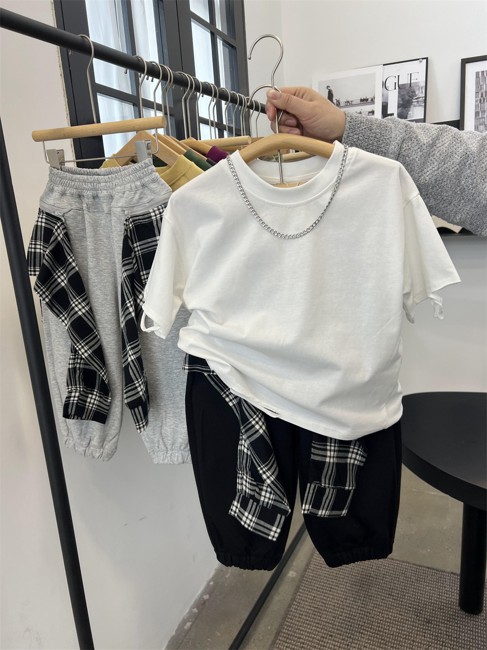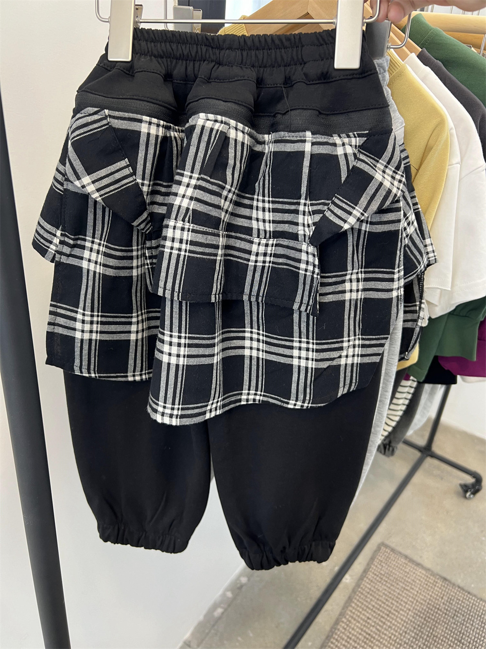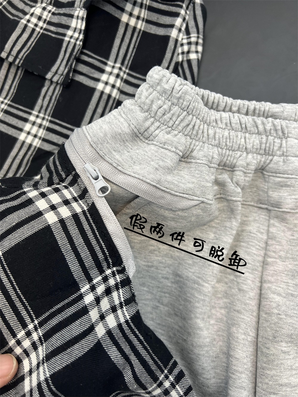 2024 봄 어린이 가짜 2 피스 방귀 커튼 바지 소년과 소녀 아메리칸 스트리트 댄스 격자 무늬 패치 워크 바지 분리 가능한 바지