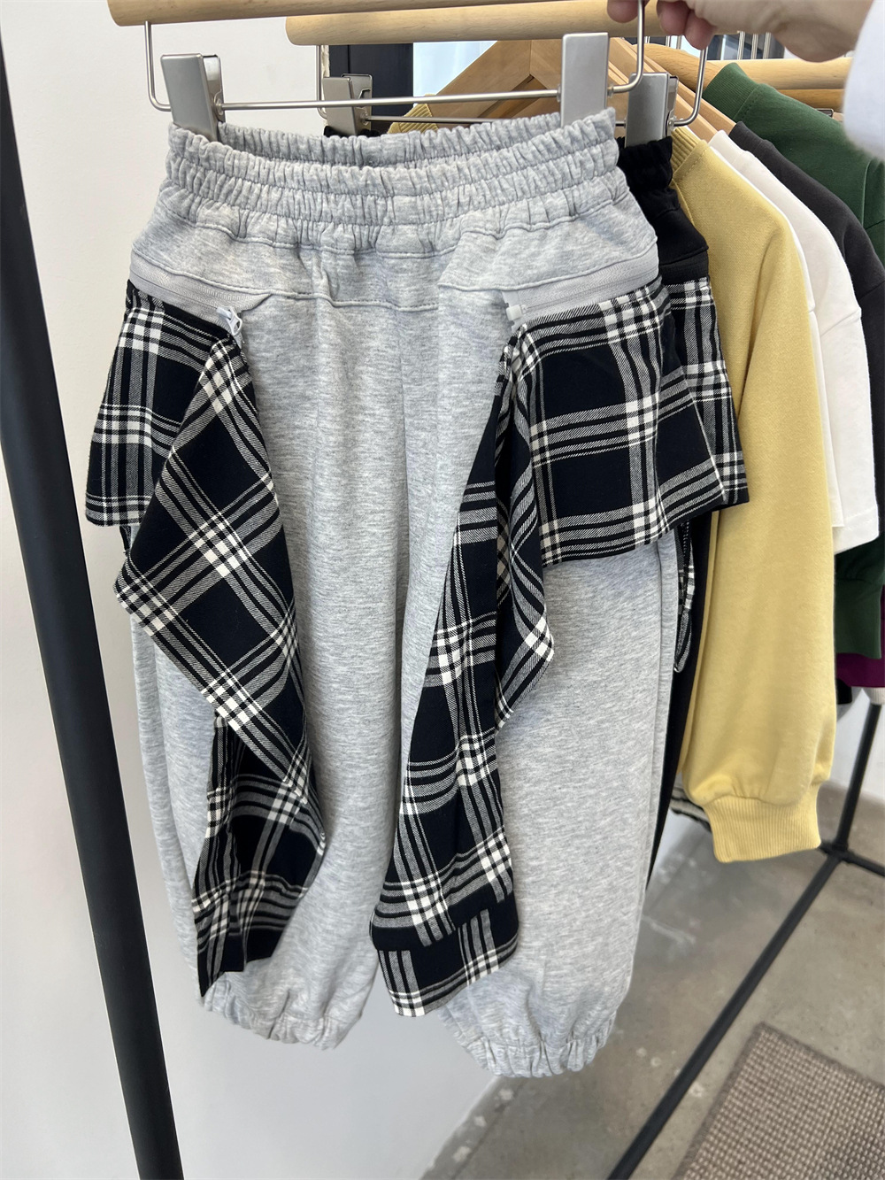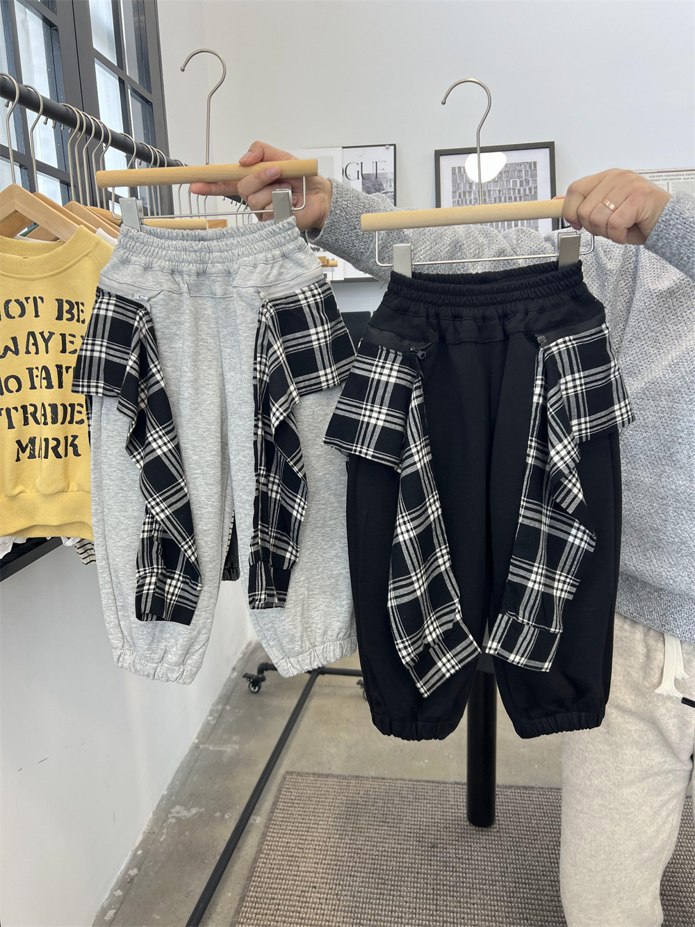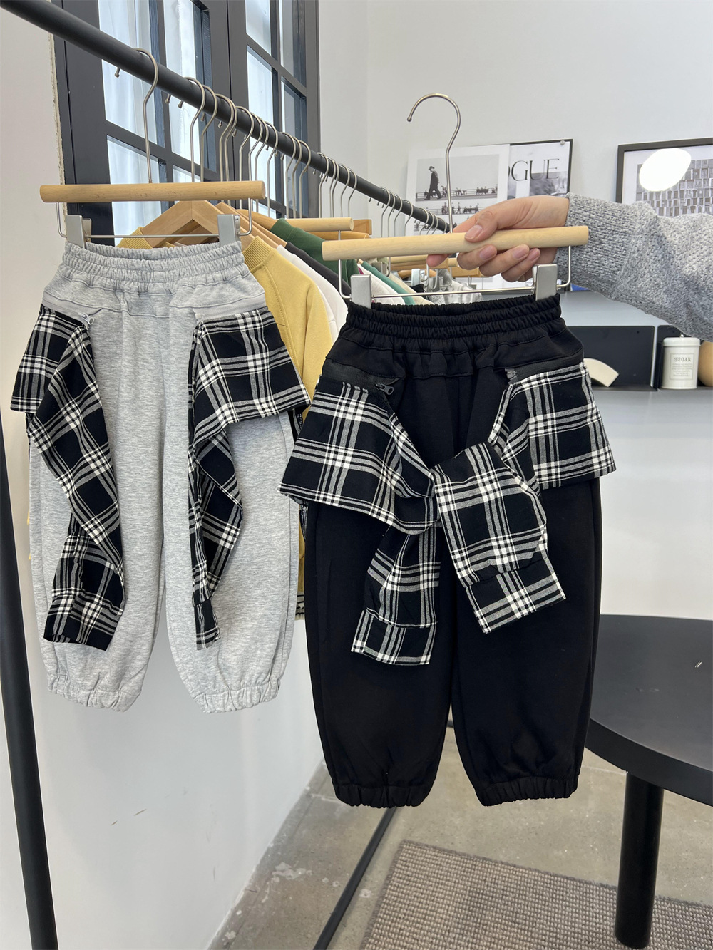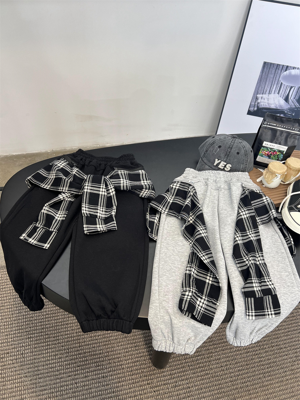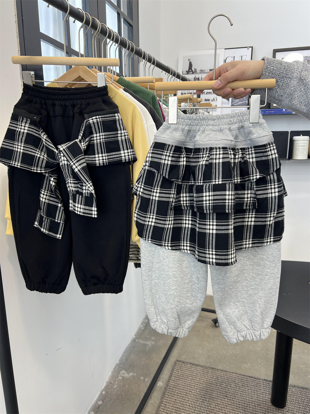 2024 봄 어린이 가짜 2 피스 방귀 커튼 바지 소년과 소녀 아메리칸 스트리트 댄스 격자 무늬 패치 워크 바지 분리 가능한 바지스토어 가기