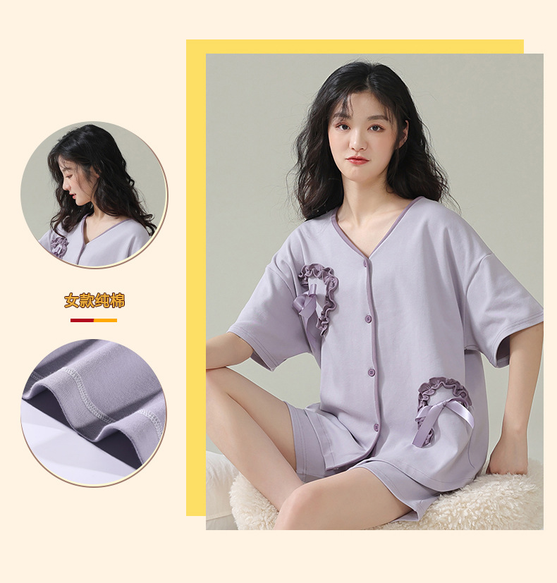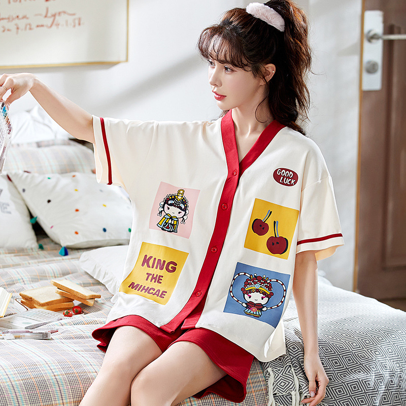 만화 귀여운 잠옷 여성의 여름 순면 반팔 V 넥 카디건 홈 옷 얇은 느슨한 하이 엔드 세트스토어 가기
