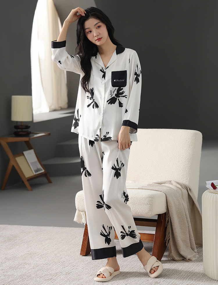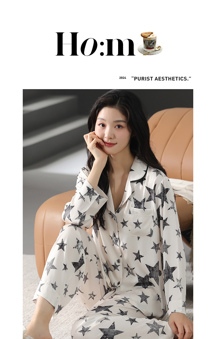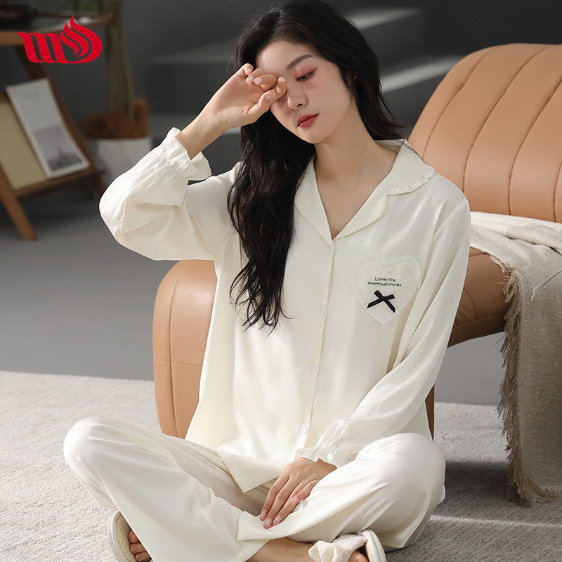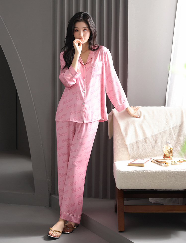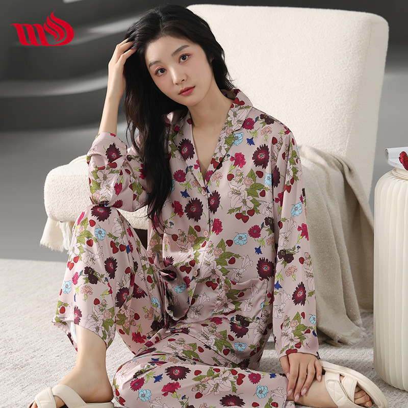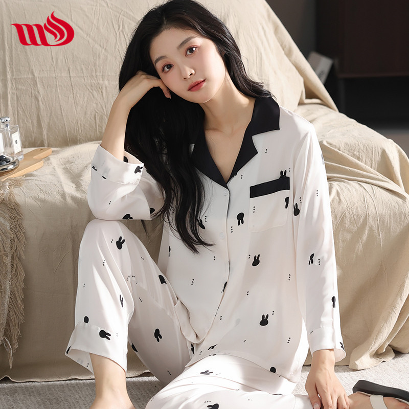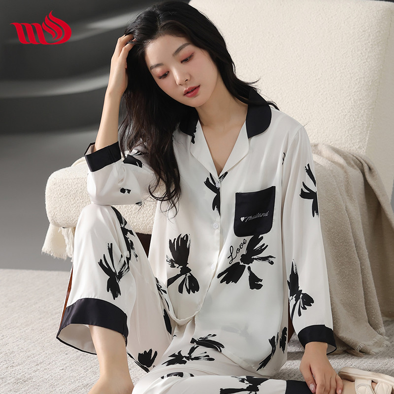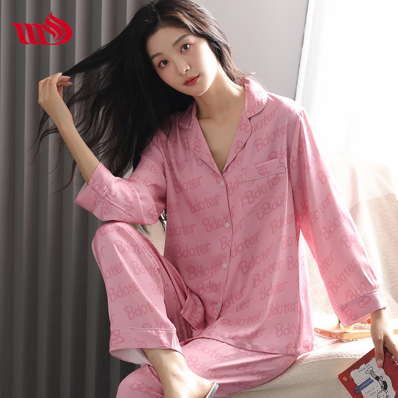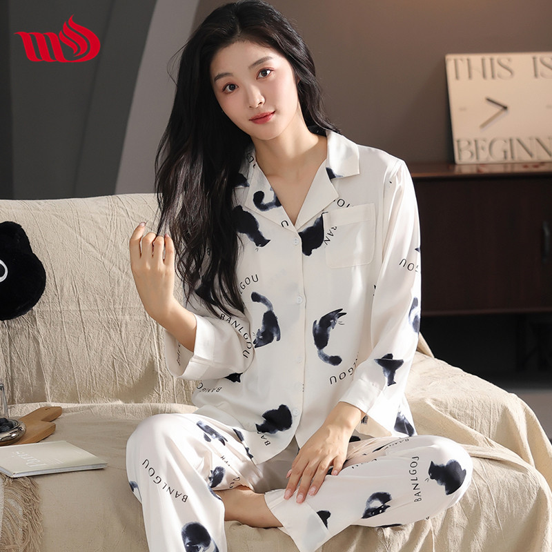 Longshijia 아이스 실크 잠옷 봄과 가을 얇은 긴 소매 새로운 여성의 인공 실크 고급 가정복 세트스토어 가기
