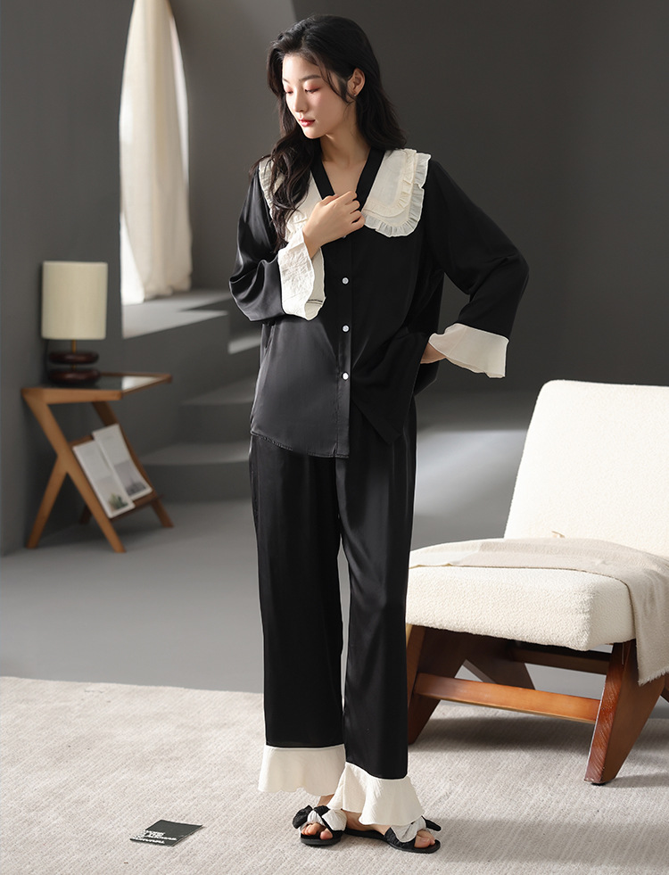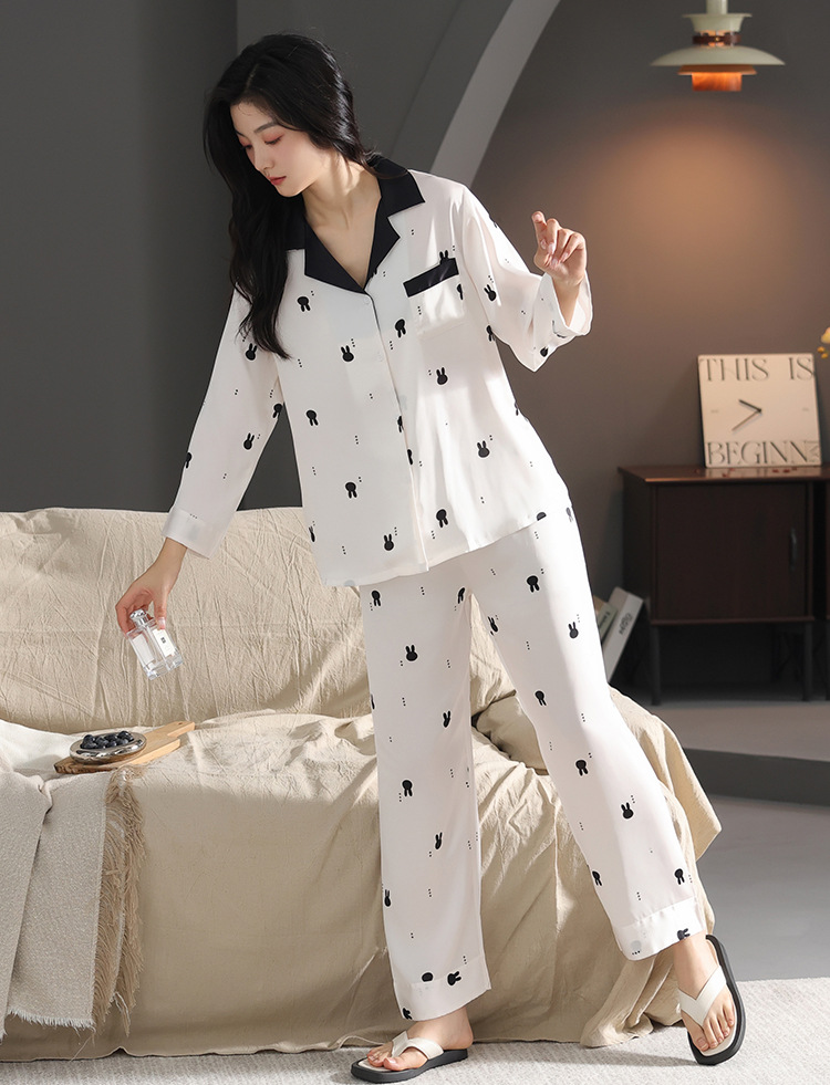 Longshijia 아이스 실크 잠옷 봄과 가을 얇은 긴 소매 새로운 여성의 인공 실크 고급 가정복 세트