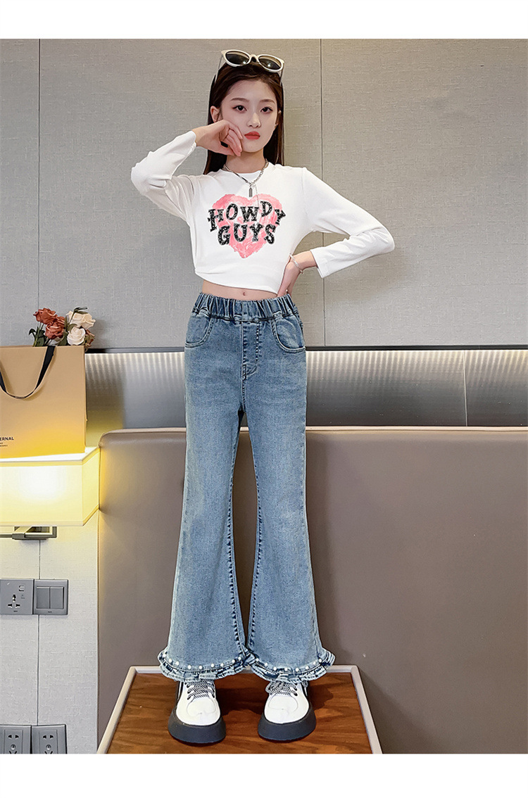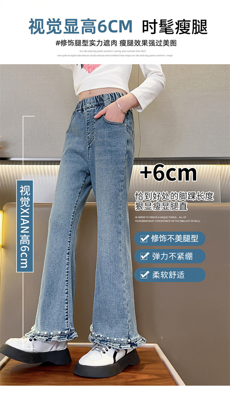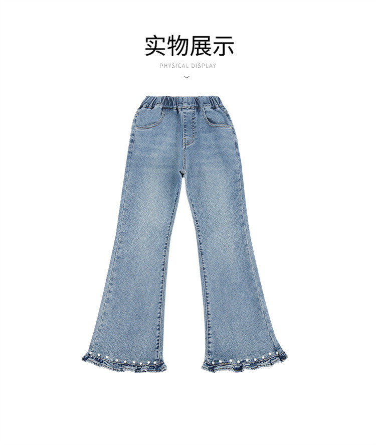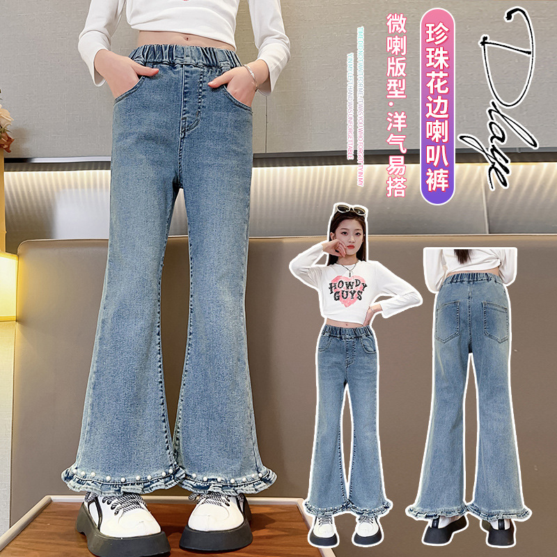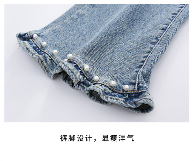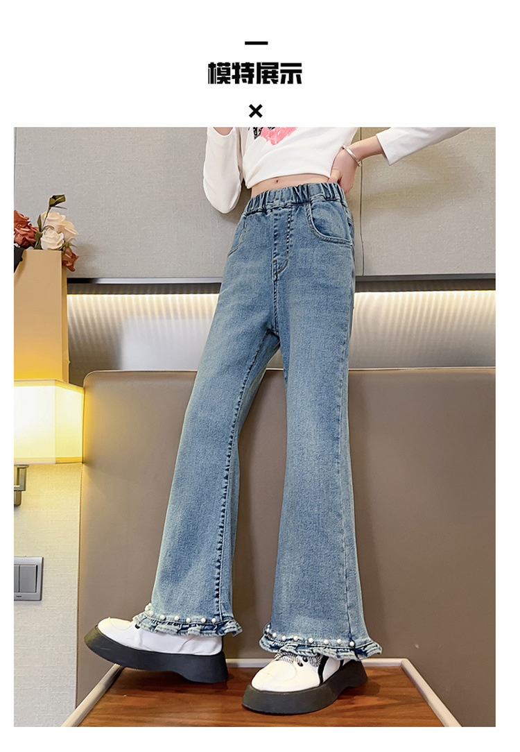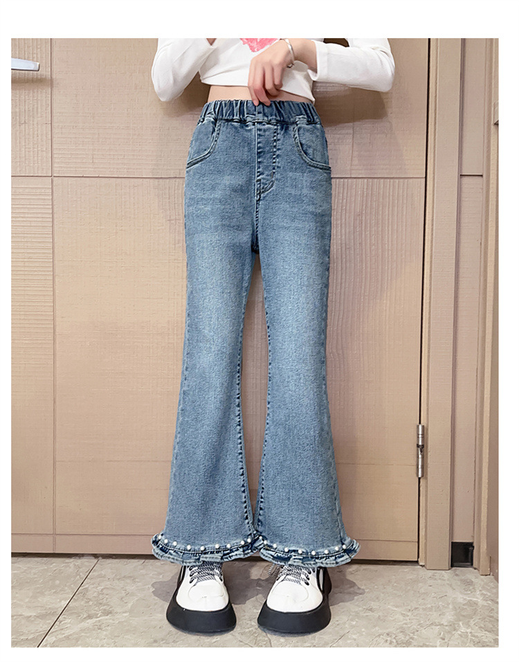 소녀의 새 봄 옷 어린이 데님 플레어 바지 한국 스타일 구슬 청바지 슬림 핏 어린이 바지 대외 무역