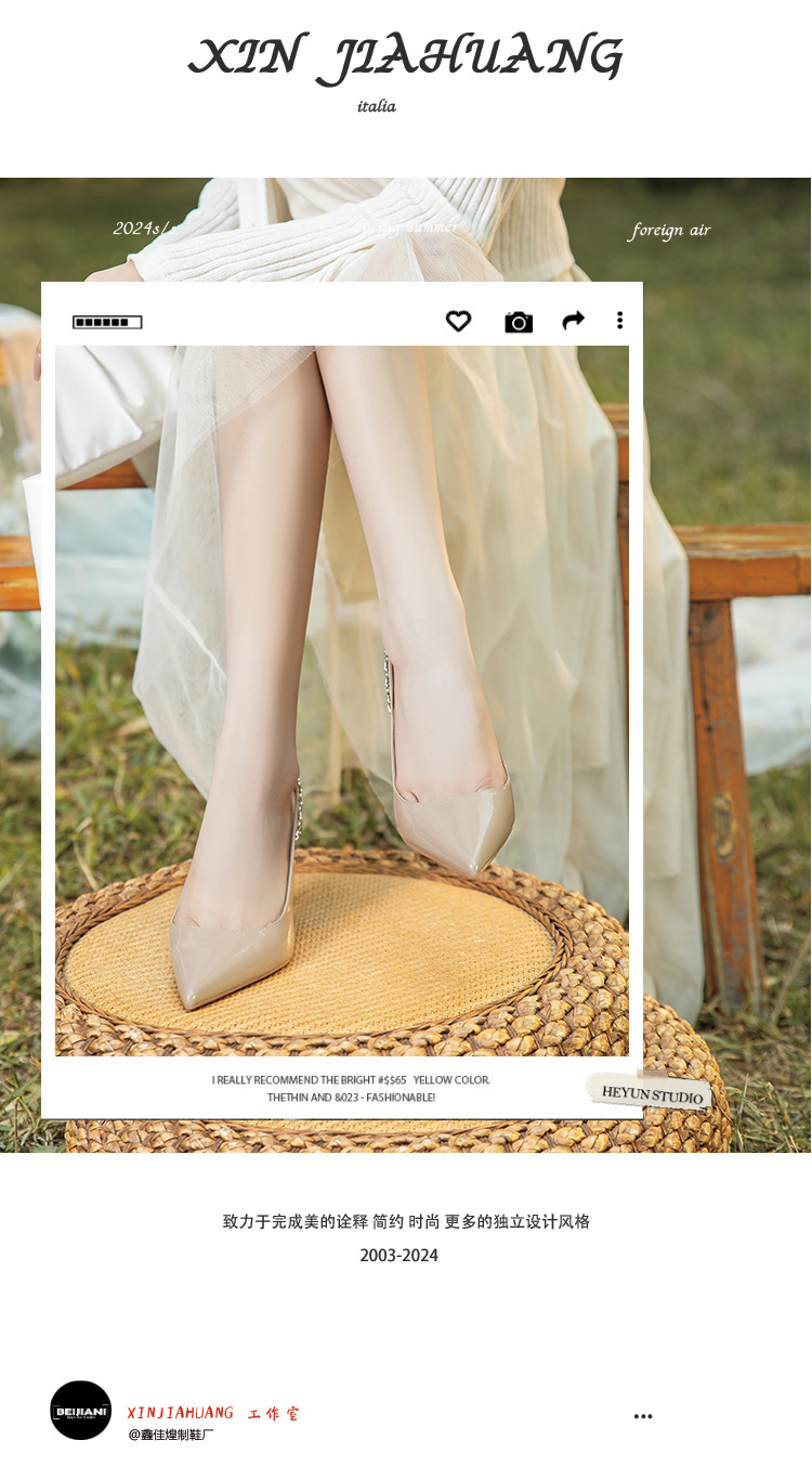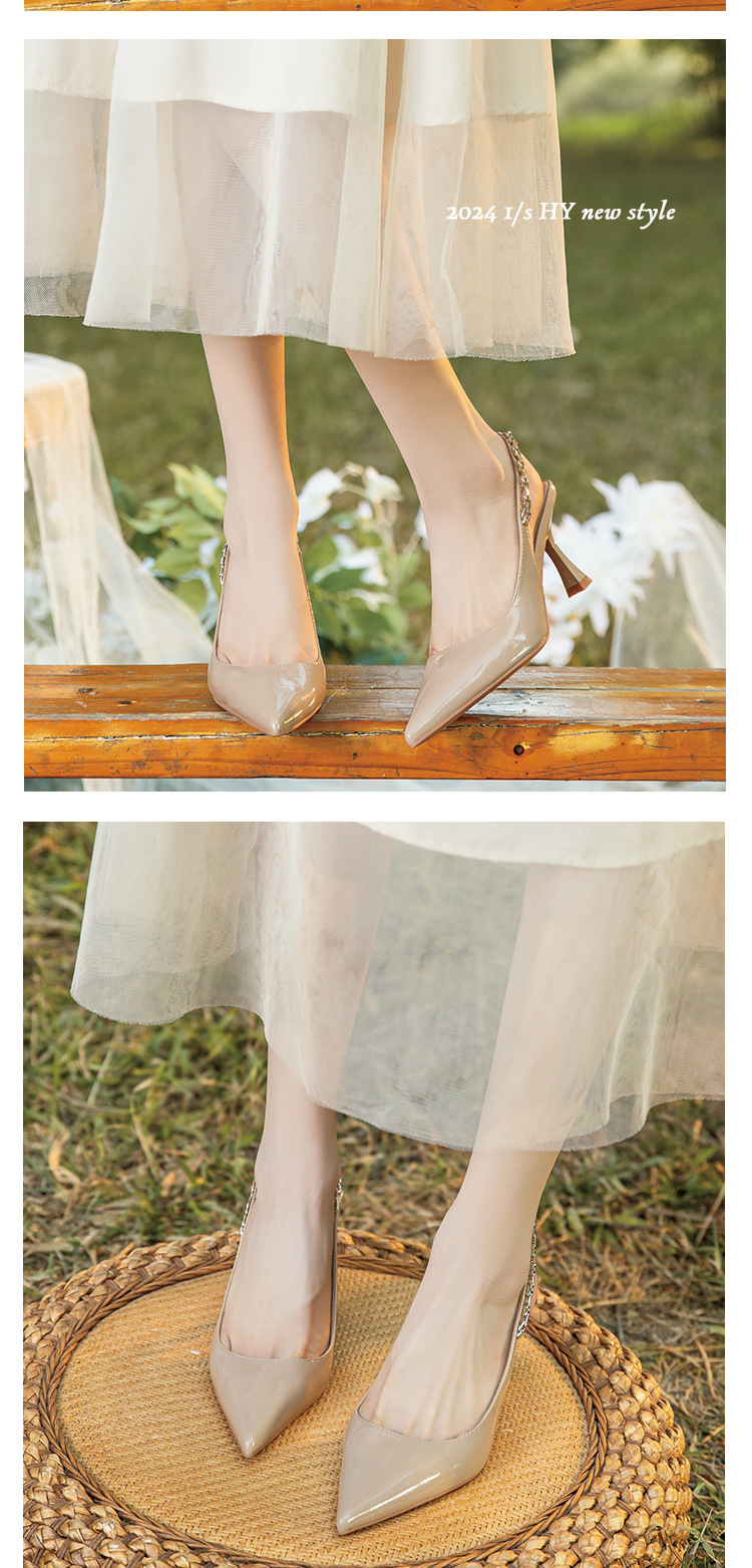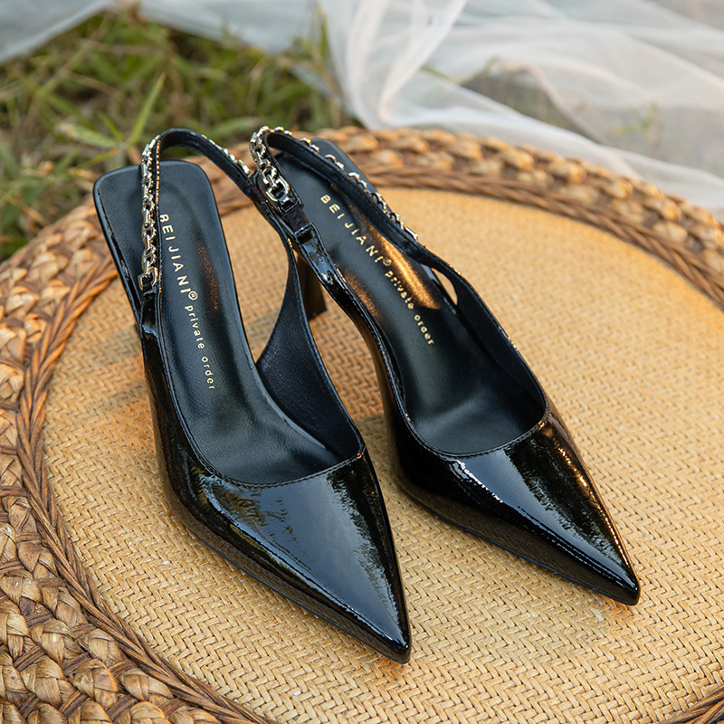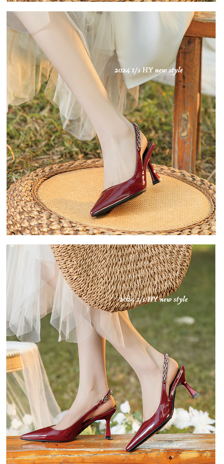 3299-12 프랑스 디자인 철 체인 장식 뾰족한 스틸레토 하이힐 싱글 레이어 신발 여성용 원 스트랩 우아한 닫힌 발가락 샌들