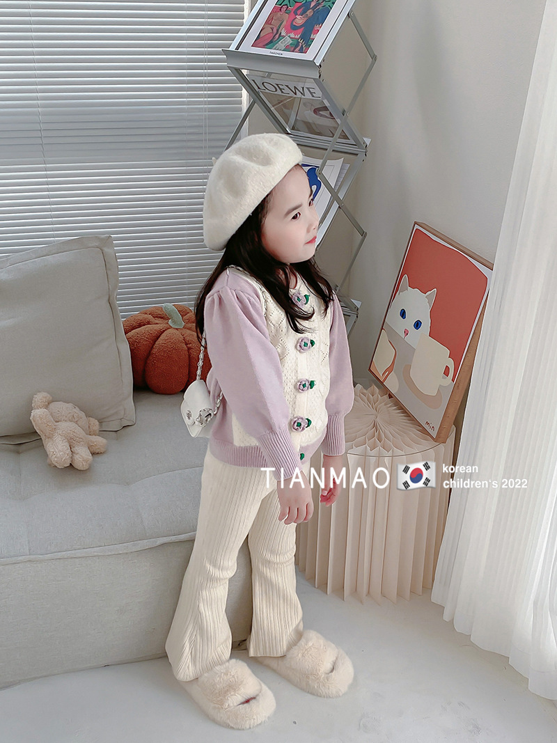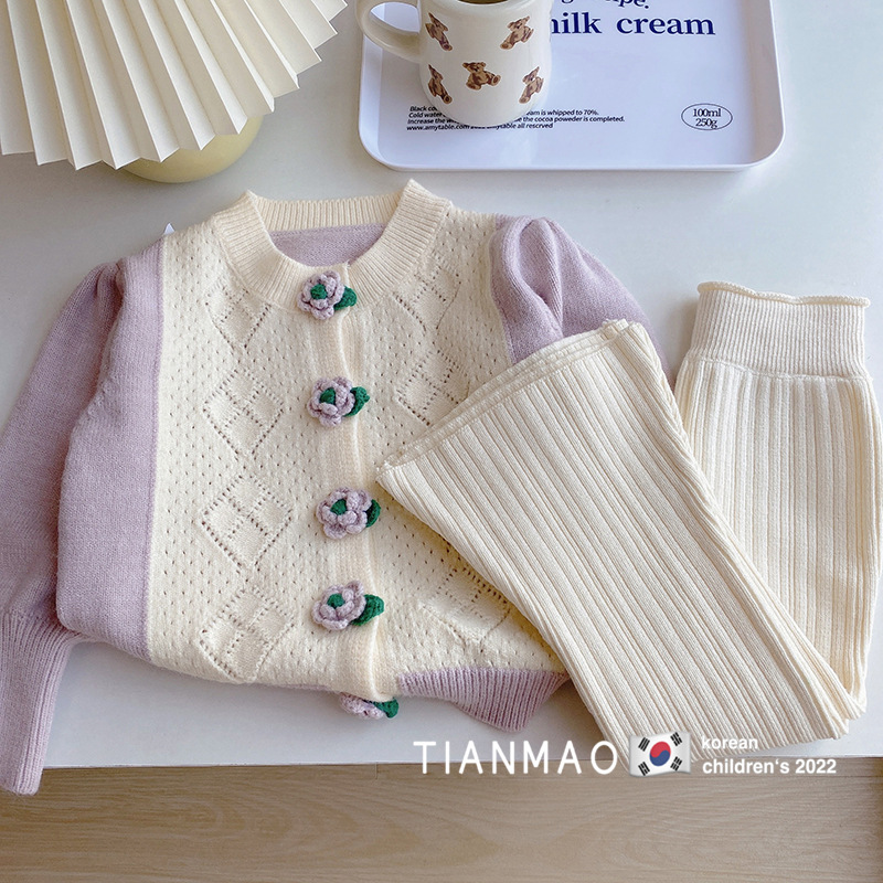 어린이 스타 라운드 소녀의 봄 옷 세트 새로운 도착 아기 소녀 서양식 니트 카디건 어린이 가을 플레어 바지 투피스 세트