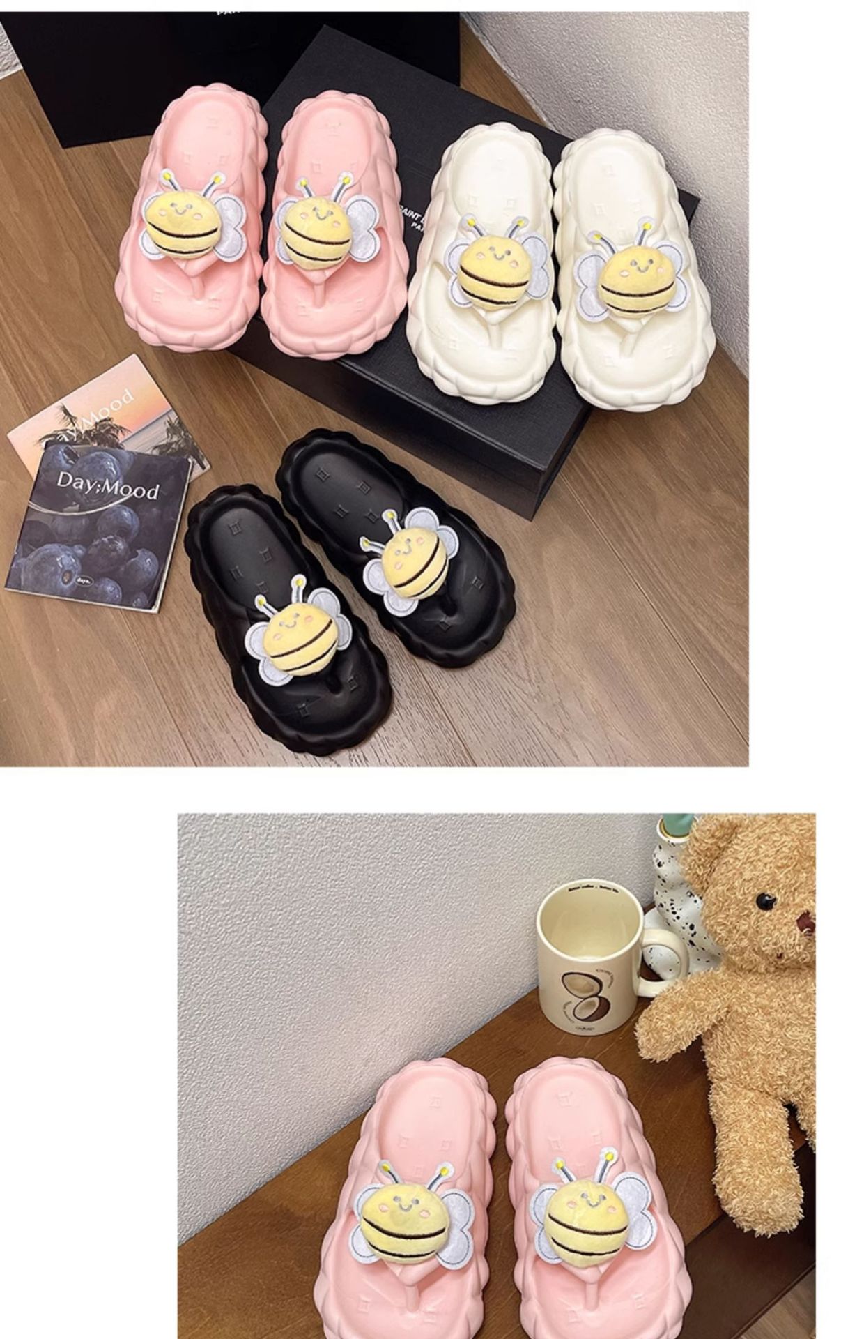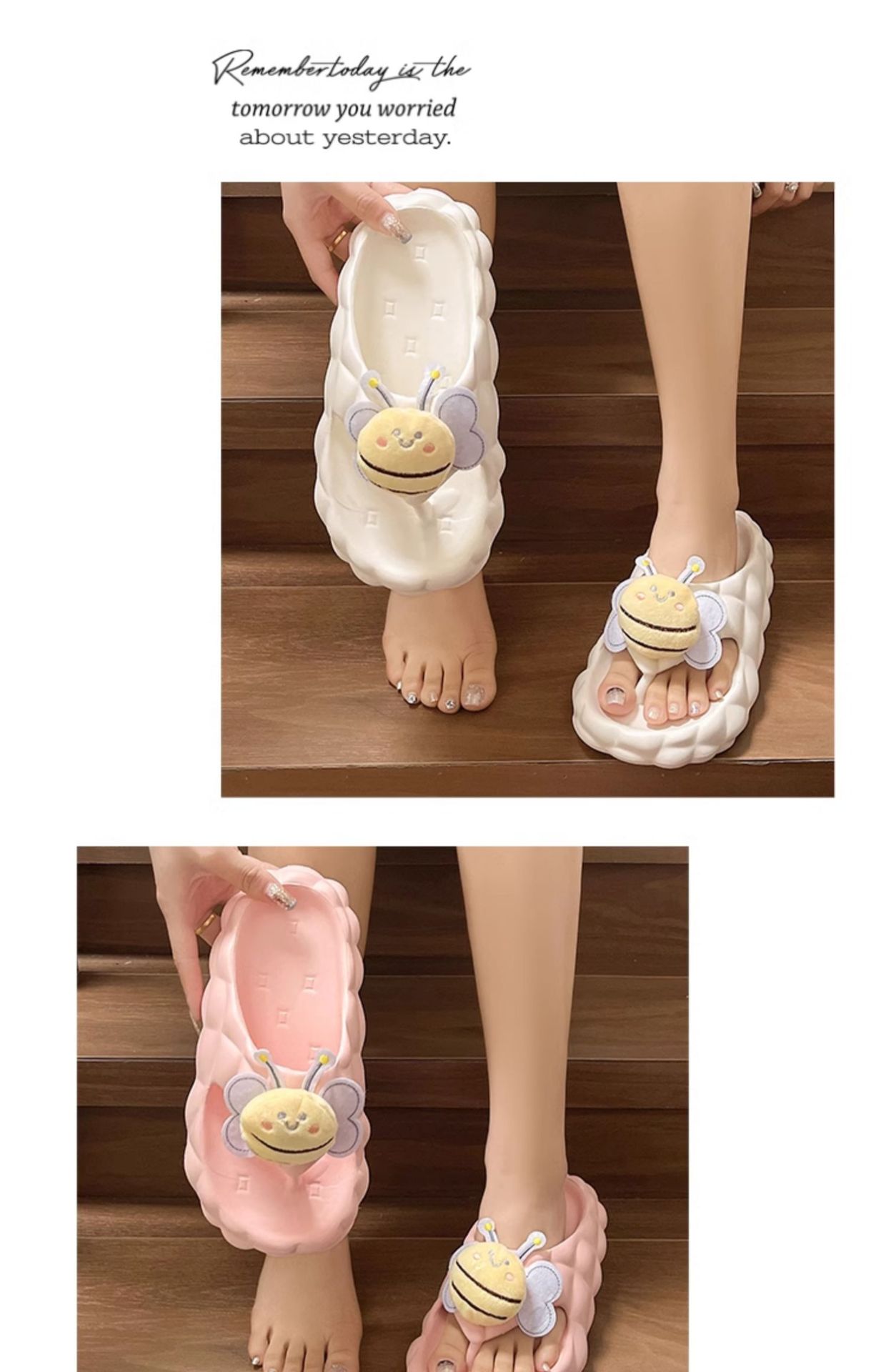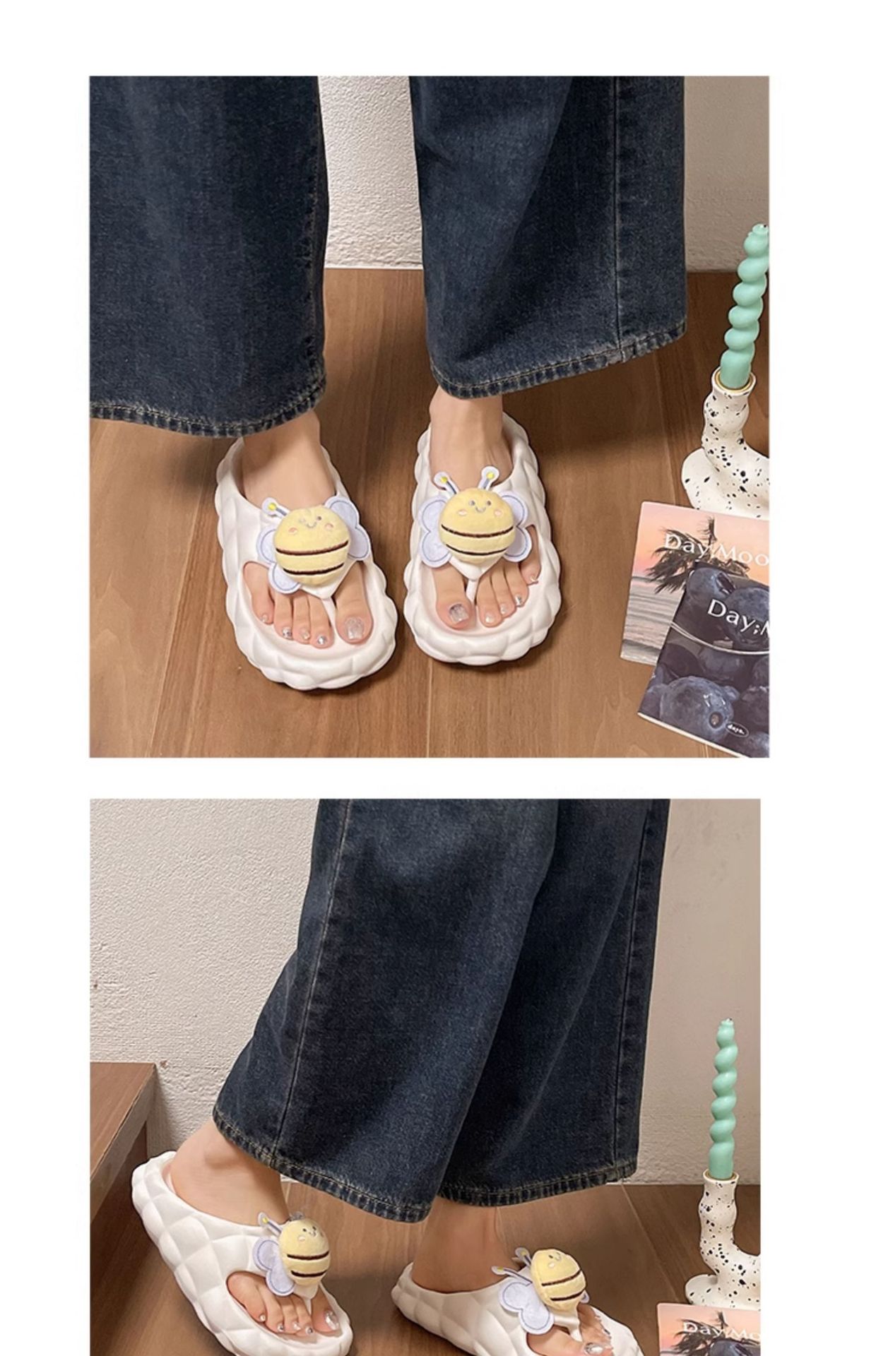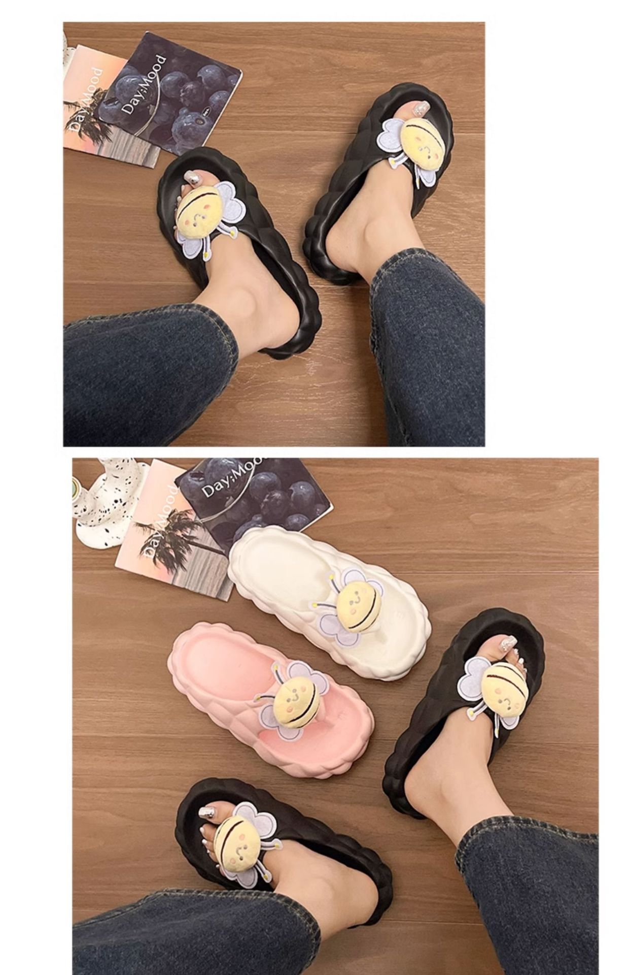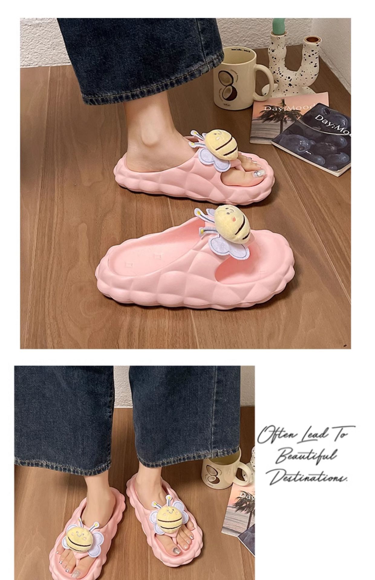 Flip-Flops 여성 여름 2024 새로운 귀여운 꿀벌 야외 착용 eva 두꺼운 바닥 똥 느낌 해변 샌들 도매스토어 가기