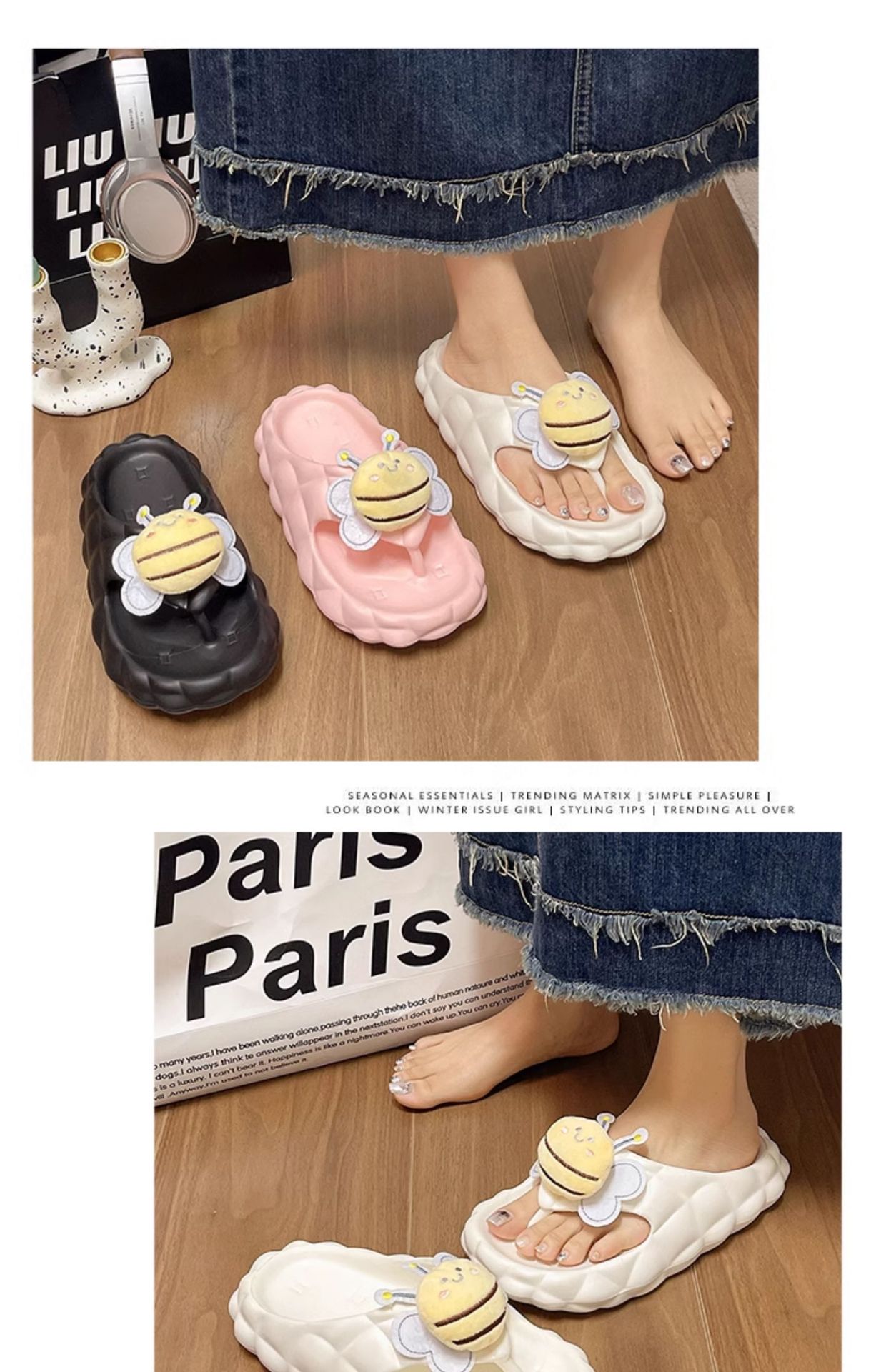 Flip-Flops 여성 여름 2024 새로운 귀여운 꿀벌 야외 착용 eva 두꺼운 바닥 똥 느낌 해변 샌들 도매