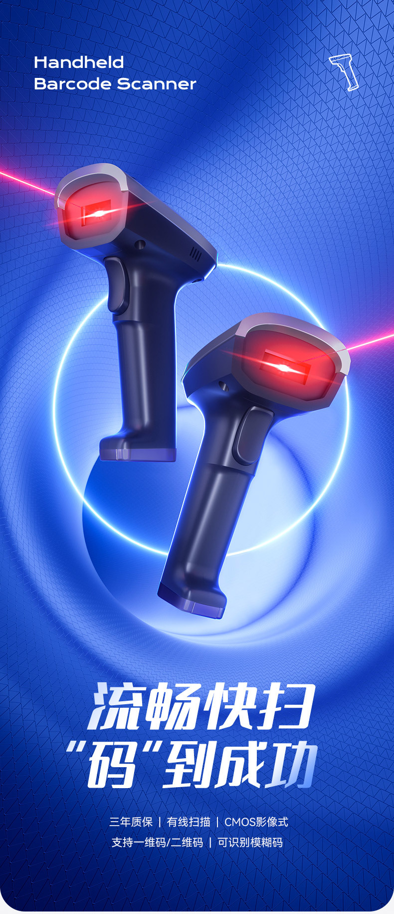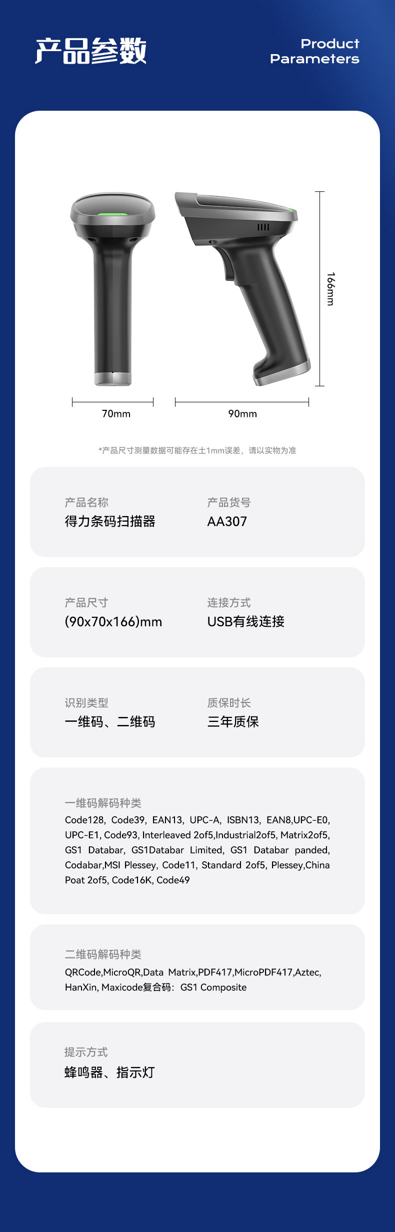 델리 AA307 스캔 총 슈퍼마켓 특수 계산원 1 QR 코드 지불 코드 창고 익스프레스 바코드 스캐너