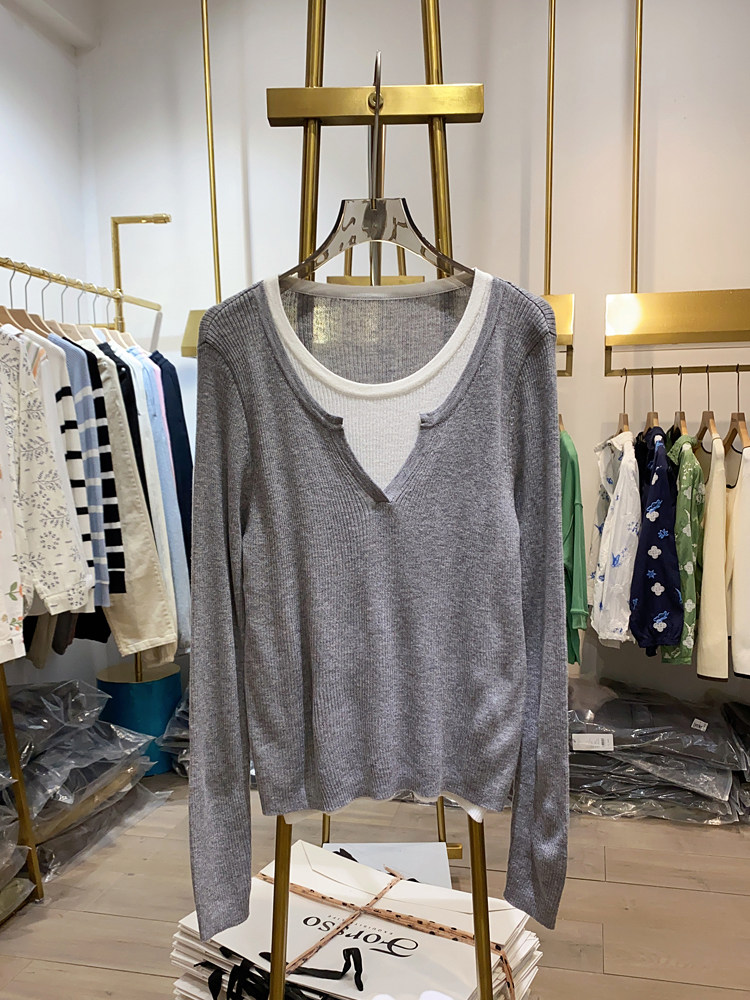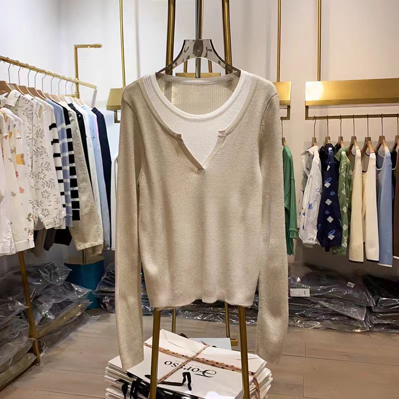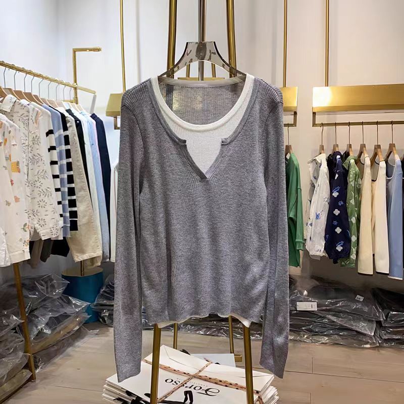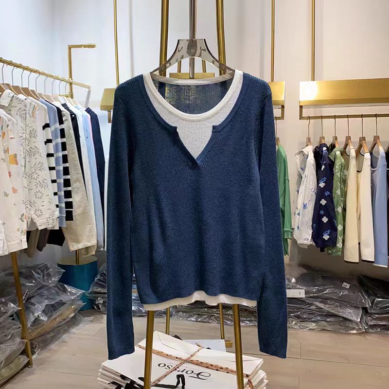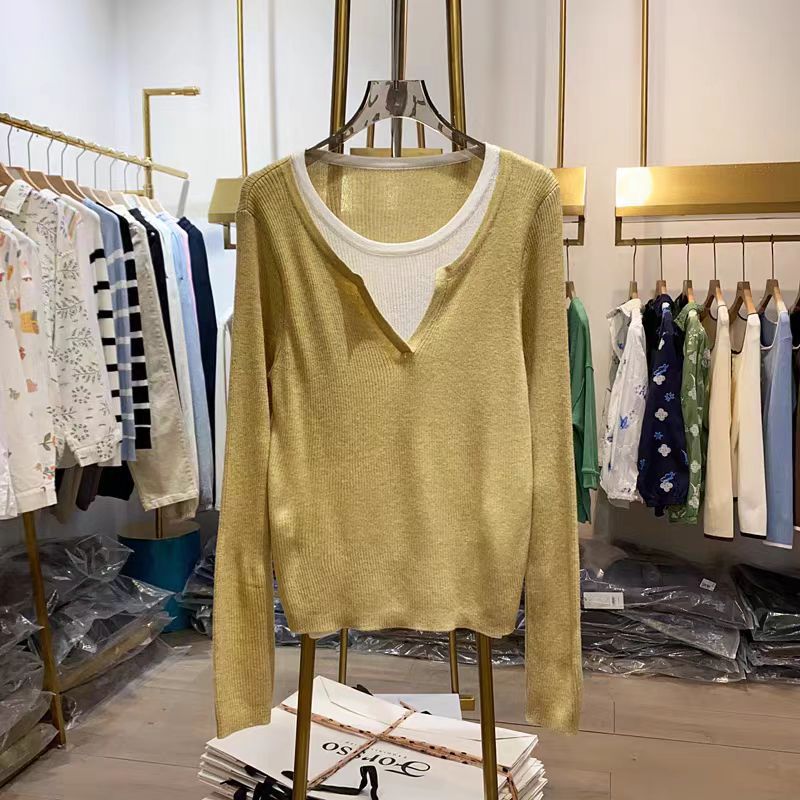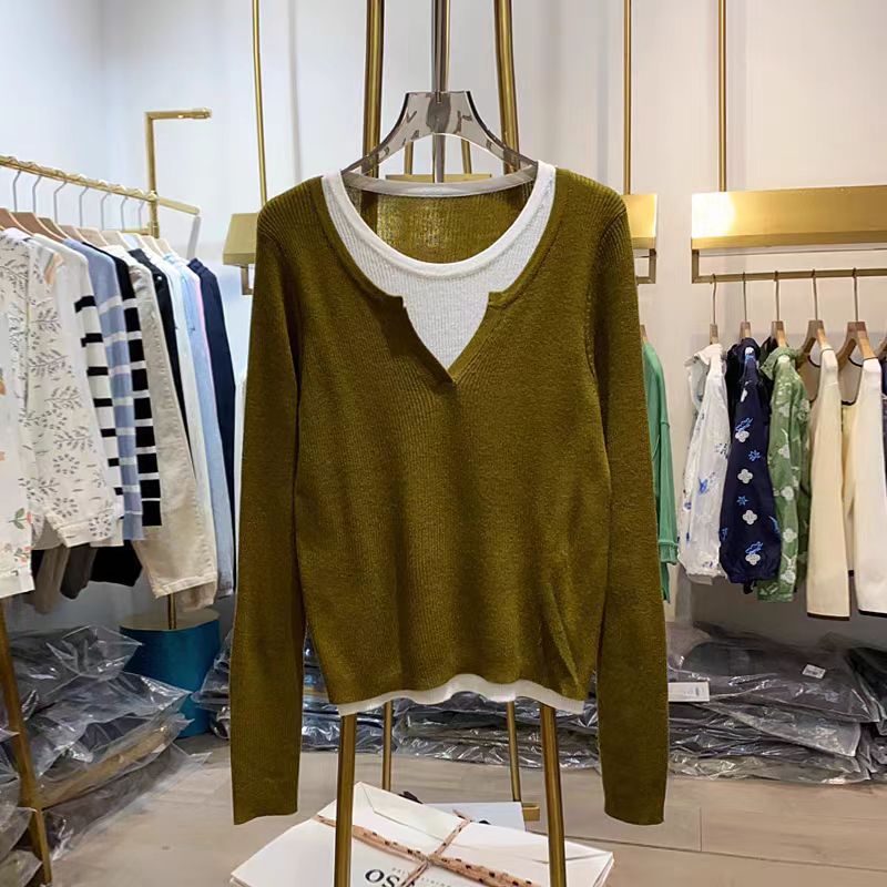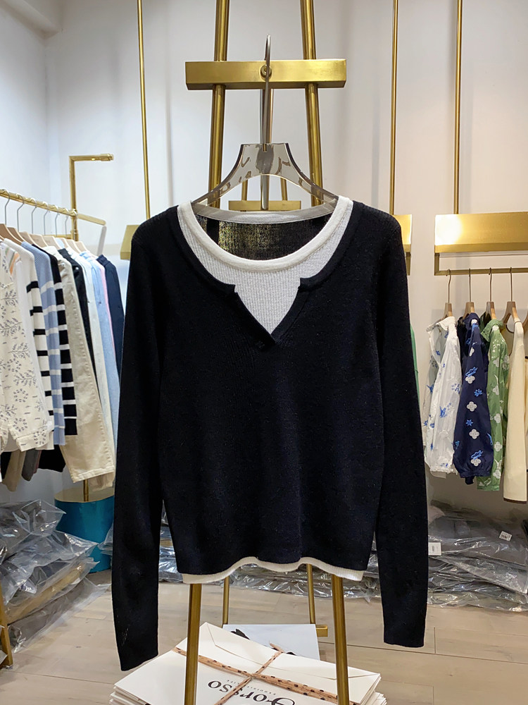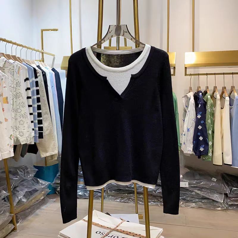 여성을위한 봄 바닥 스웨터 봄 2024 새로운 짧은 스티칭 대비 컬러 가짜 투피스 풀오버 탑 슬림 핏 패션스토어 가기