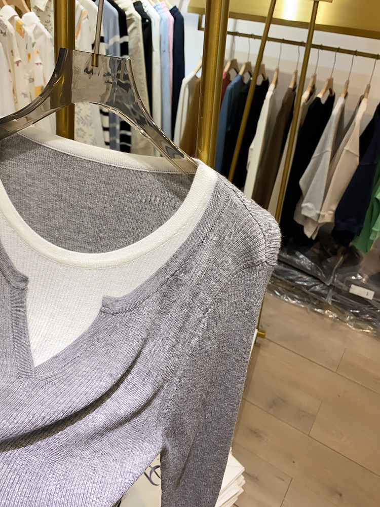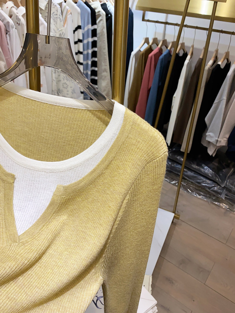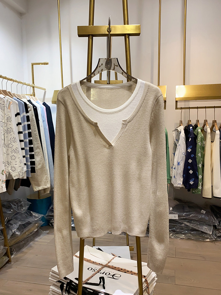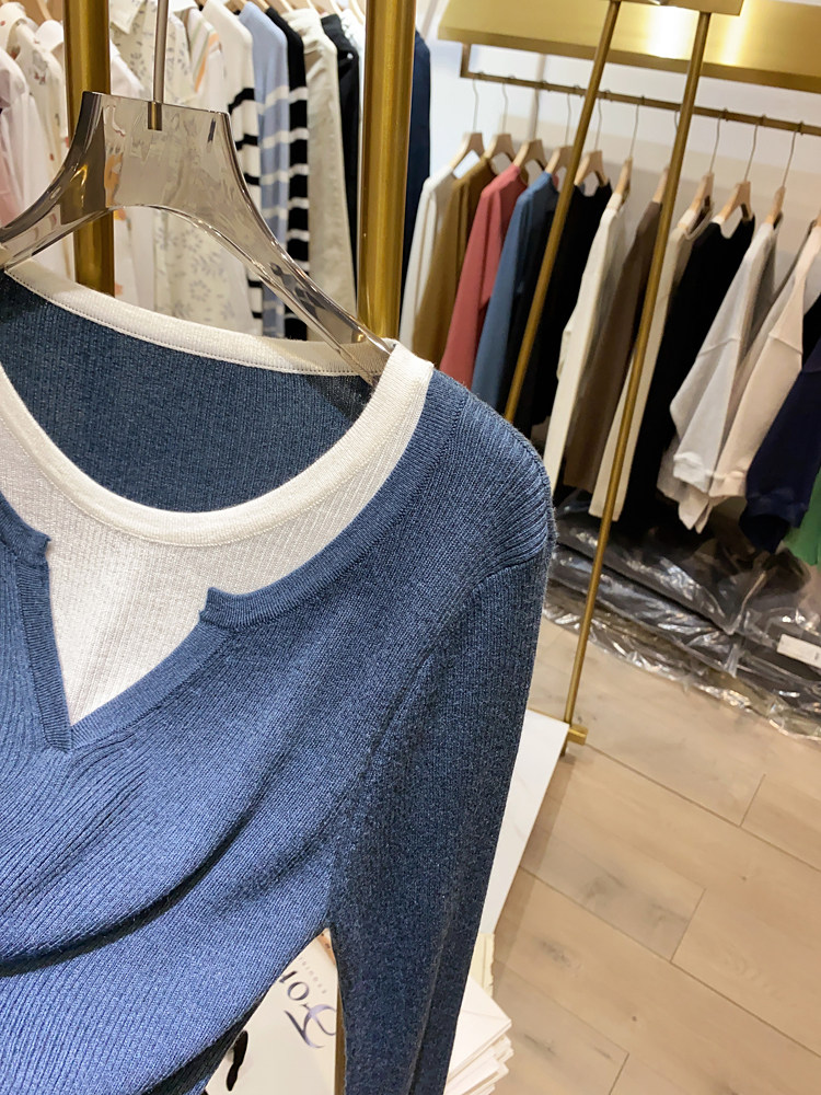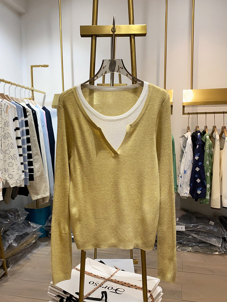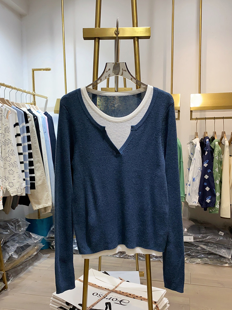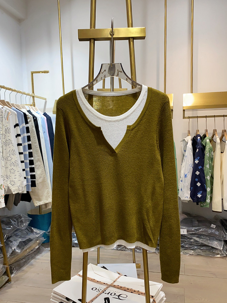 여성을위한 봄 바닥 스웨터 봄 2024 새로운 짧은 스티칭 대비 컬러 가짜 투피스 풀오버 탑 슬림 핏 패션스토어 가기