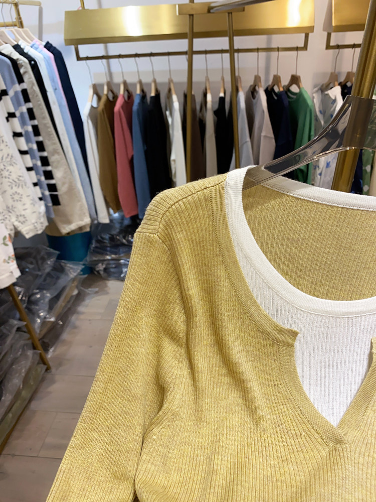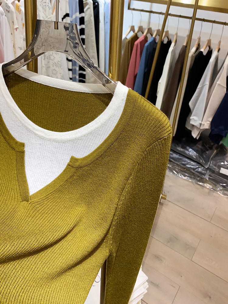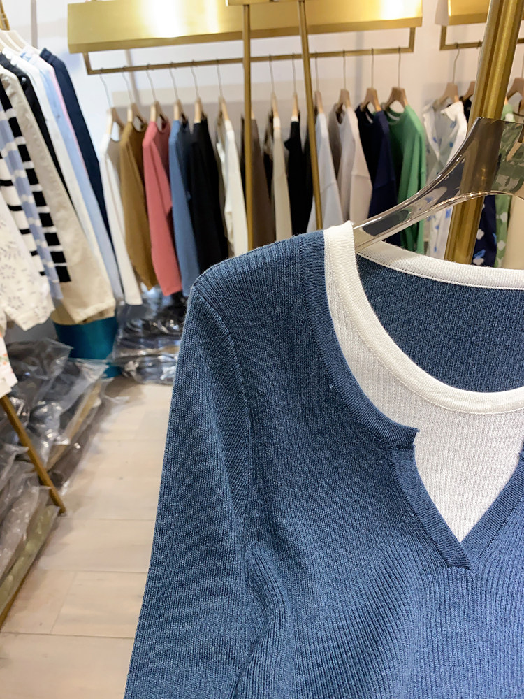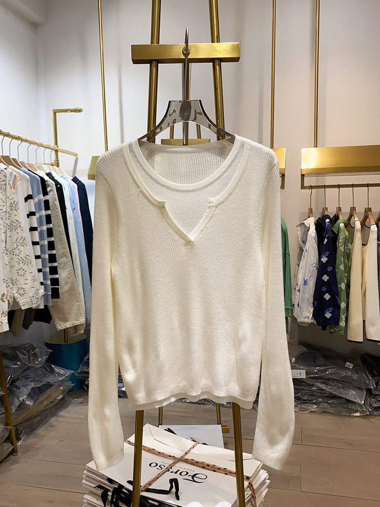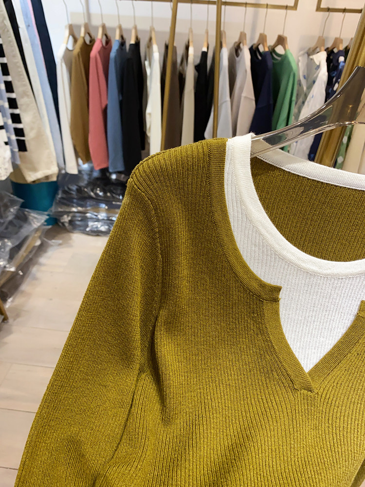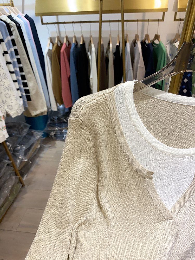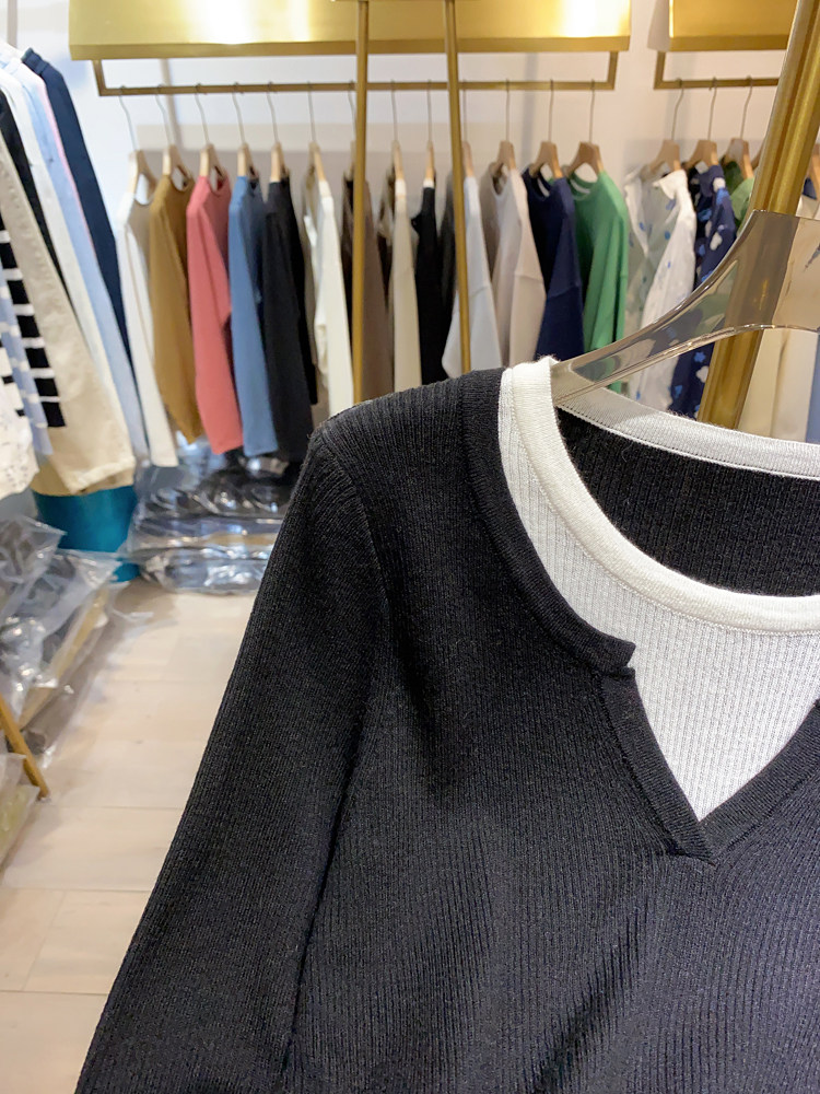 여성을위한 봄 바닥 스웨터 봄 2024 새로운 짧은 스티칭 대비 컬러 가짜 투피스 풀오버 탑 슬림 핏 패션스토어 가기