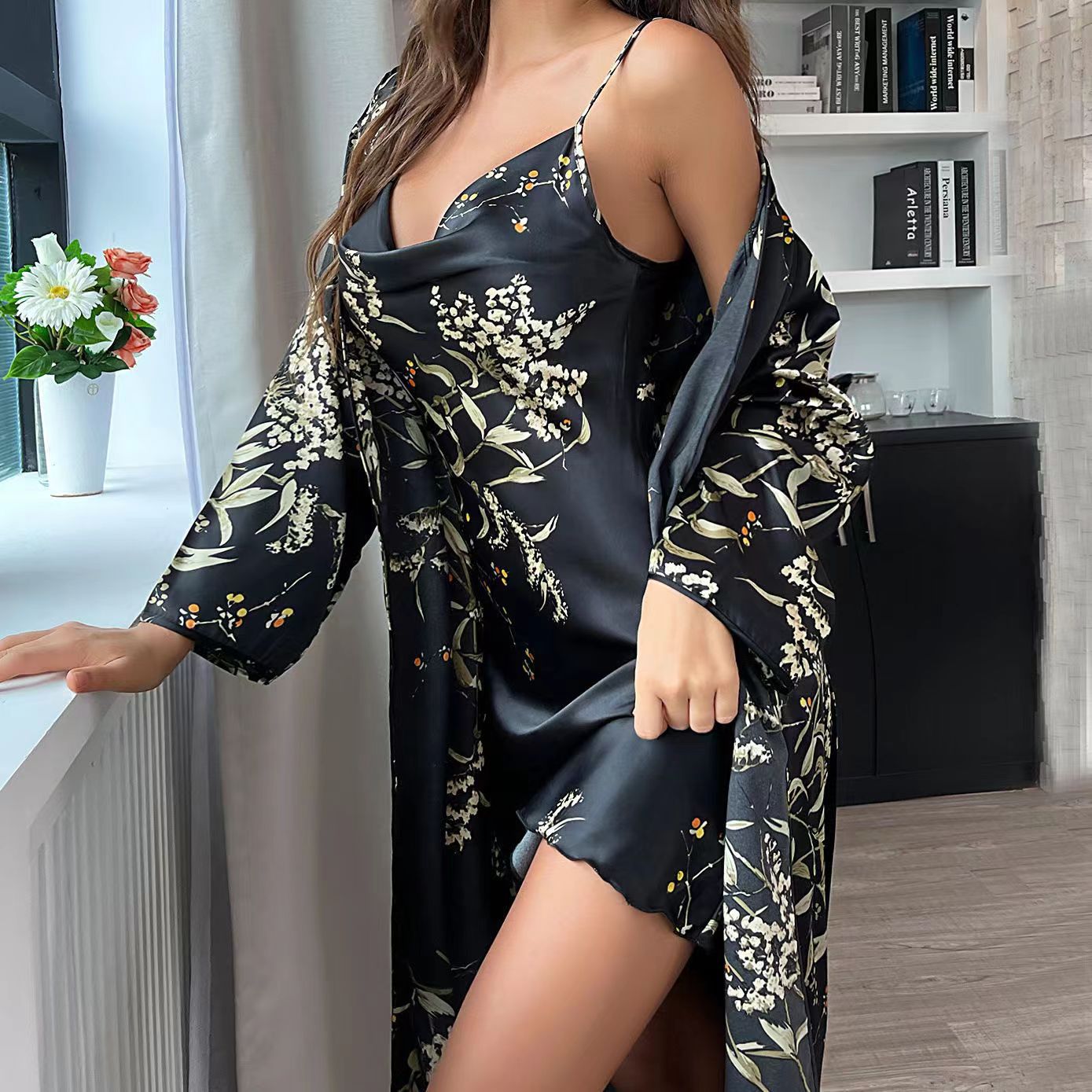 인기있는 아이스 실크 잠옷 여성 호텔 욕실 레이스 업 목욕 가운 여름 통기성 얇은 패션 체리 프린트 긴 소매 수면스토어 가기