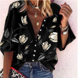 새로운 3D 꽃무늬 프린트 긴팔 상의 여성용 해외 무역 봄 여성복 패션 V넥 셔츠 제조업체 도매스토어 가기
