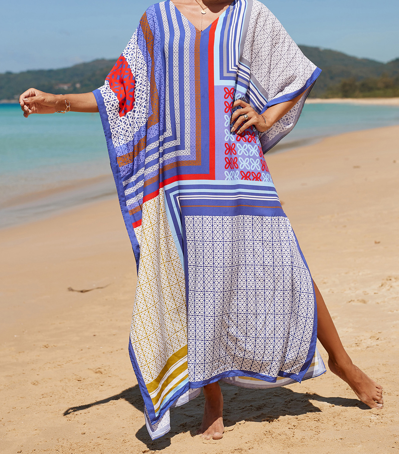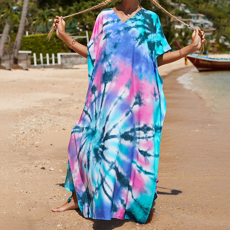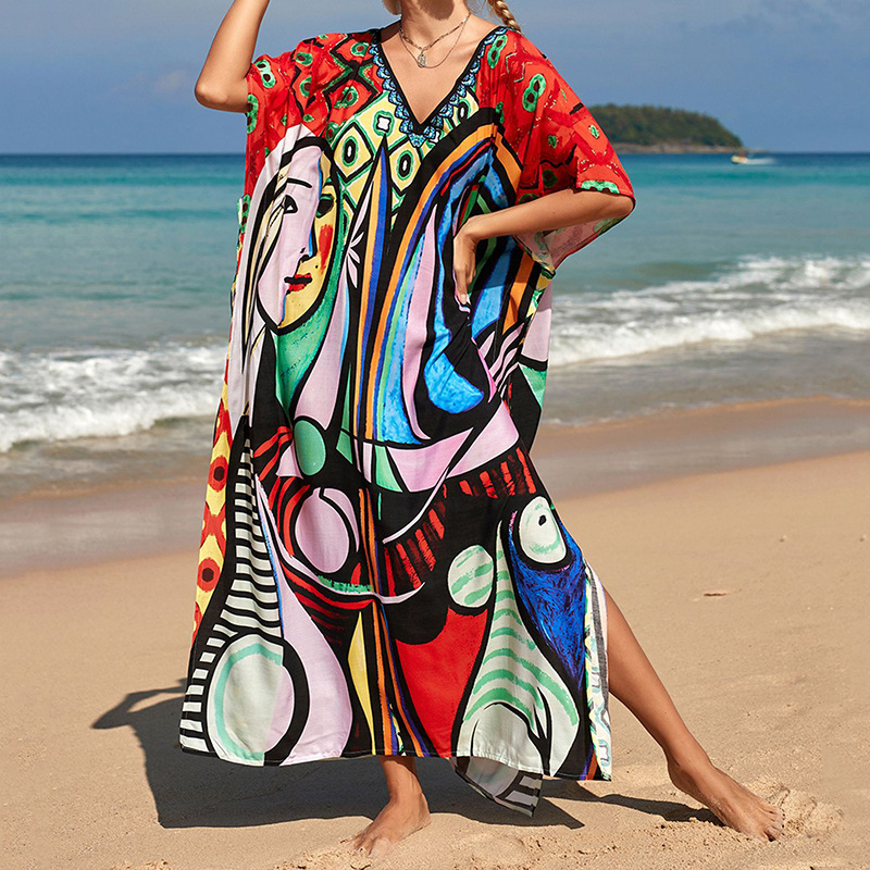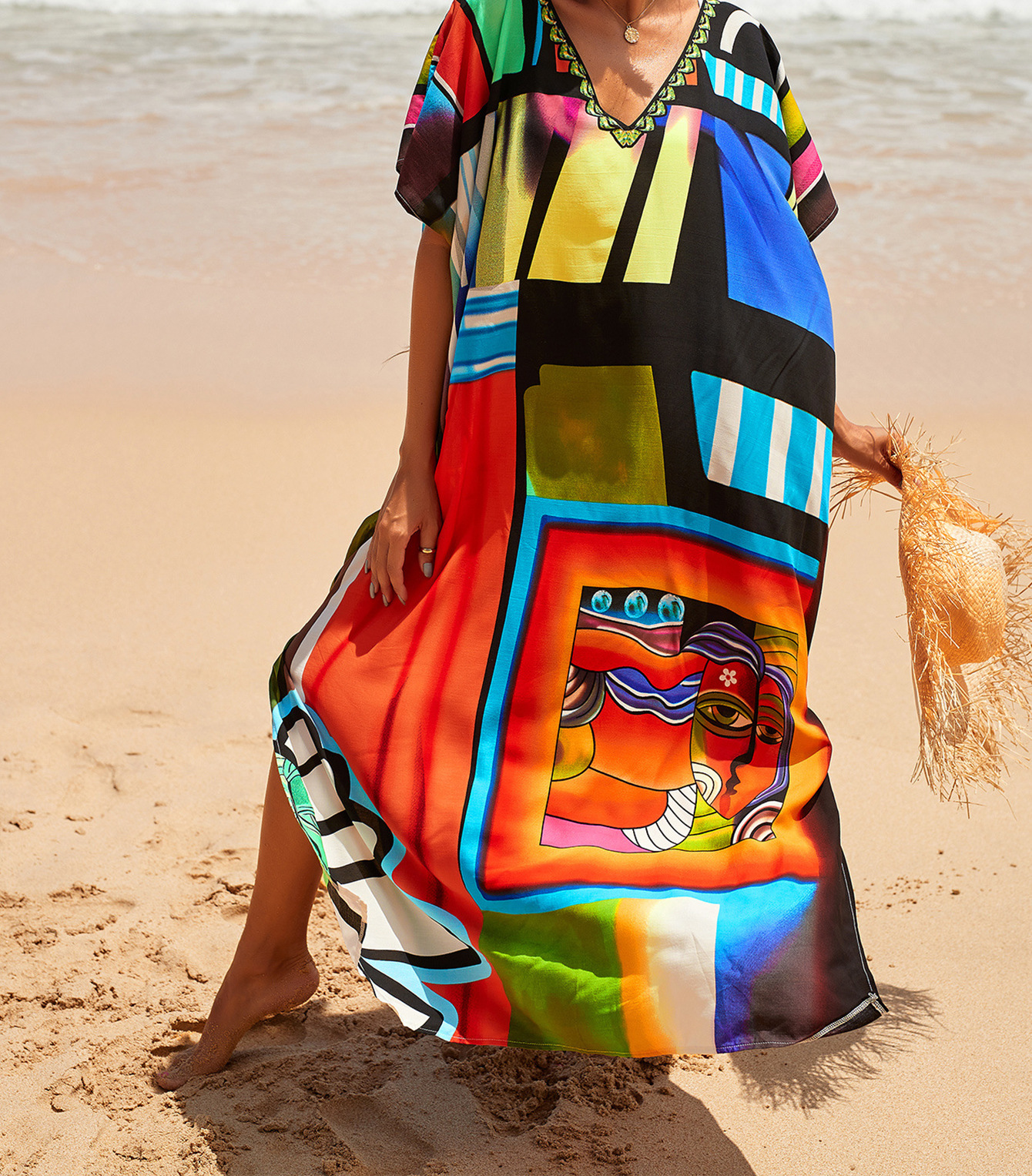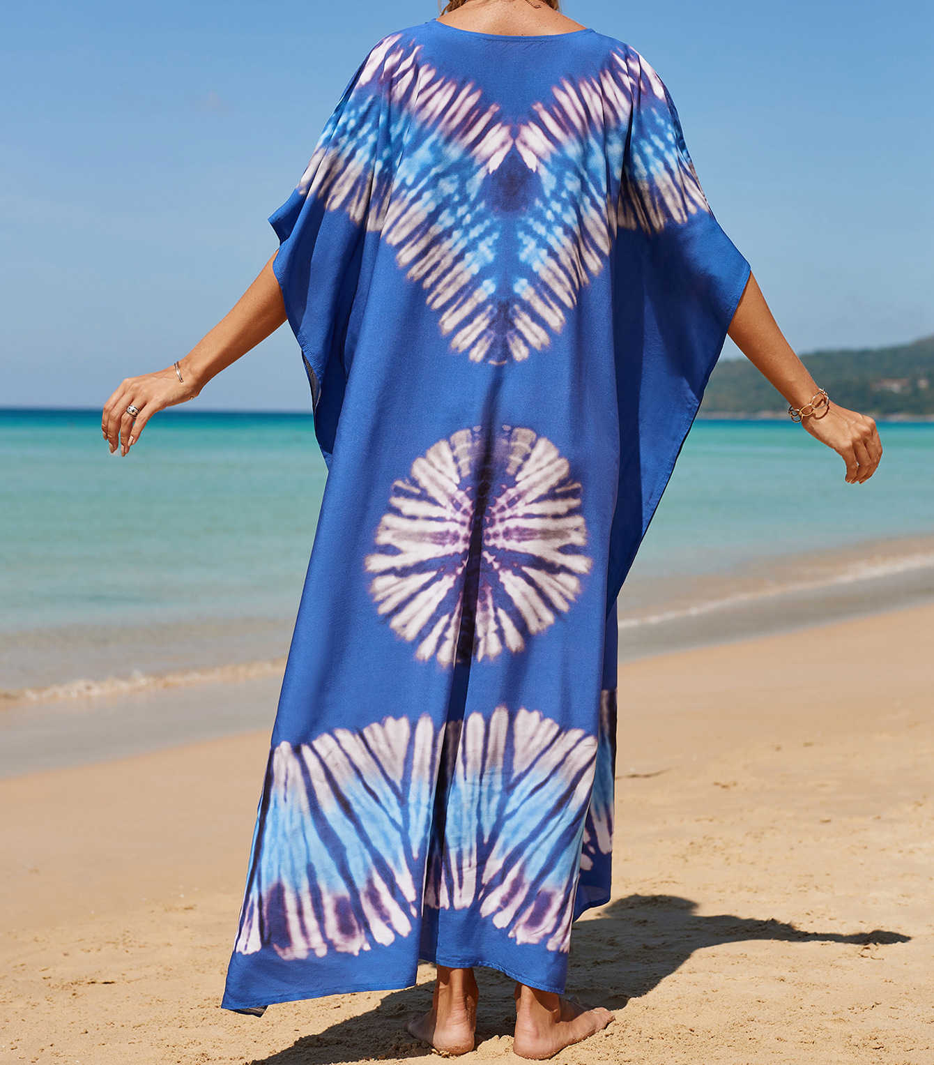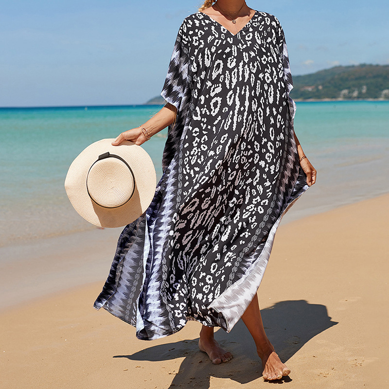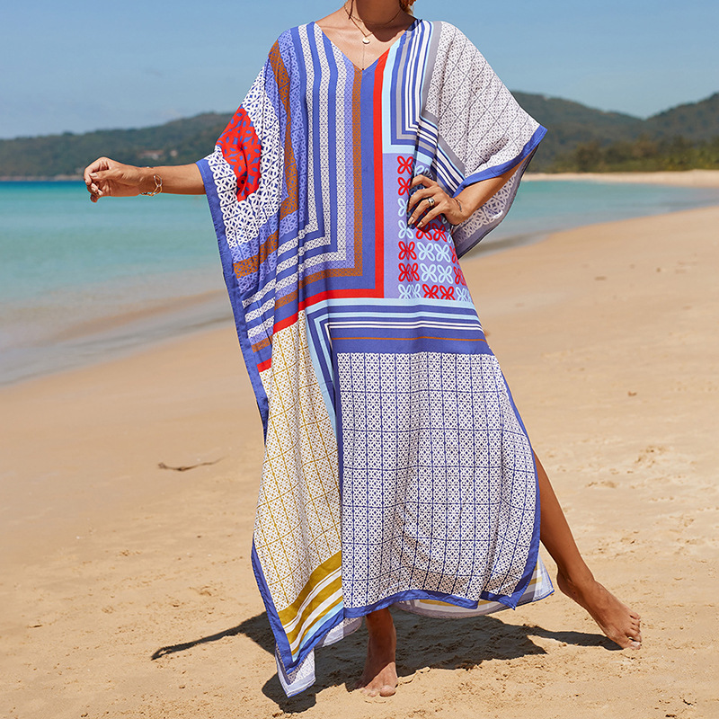 2024 유럽과 미국의 국경 간 아마존 여름 프린트 비치 블라우스 휴가 캐주얼 태양 방지 해변 원피스 느슨한 플러스 사이즈