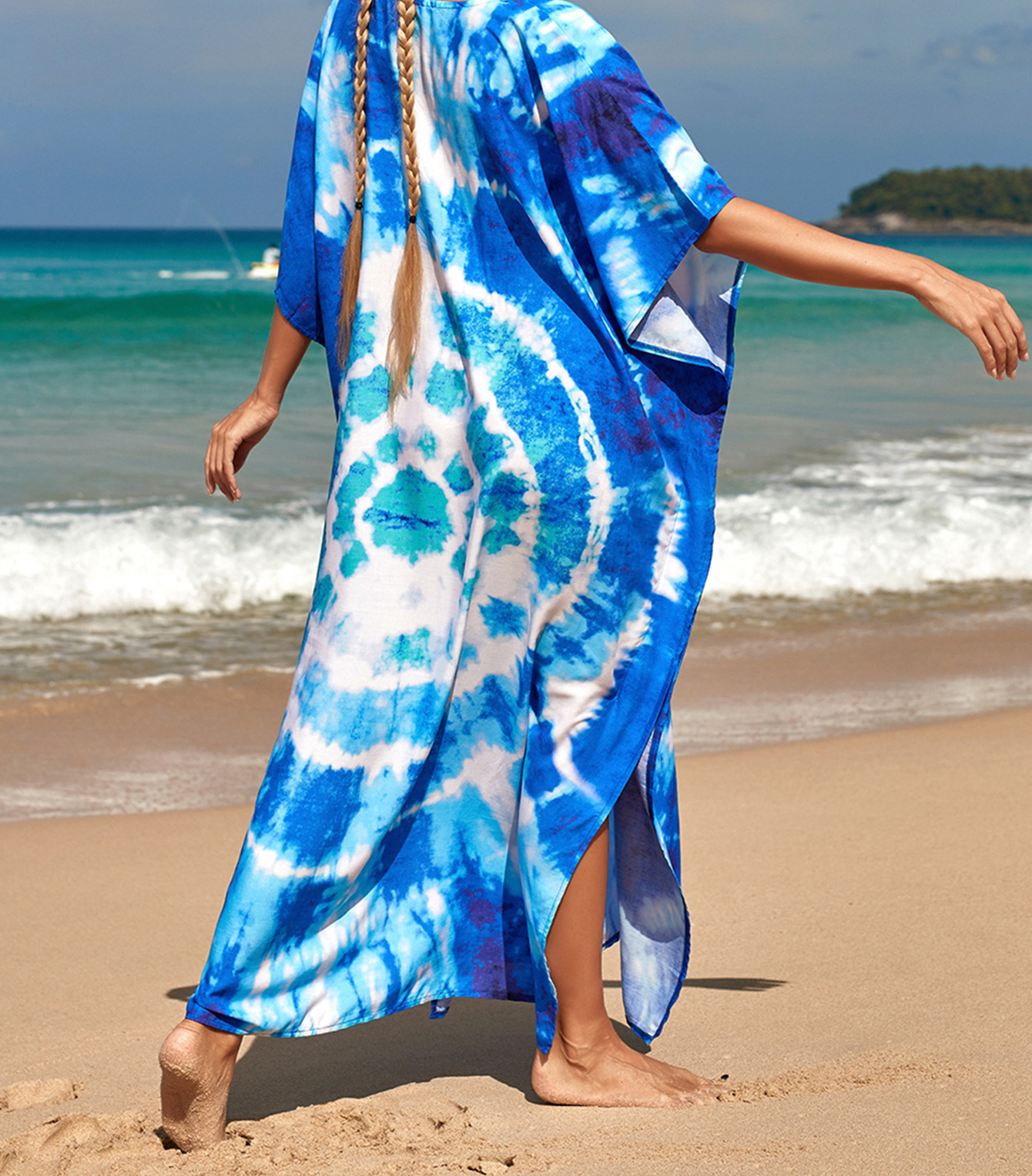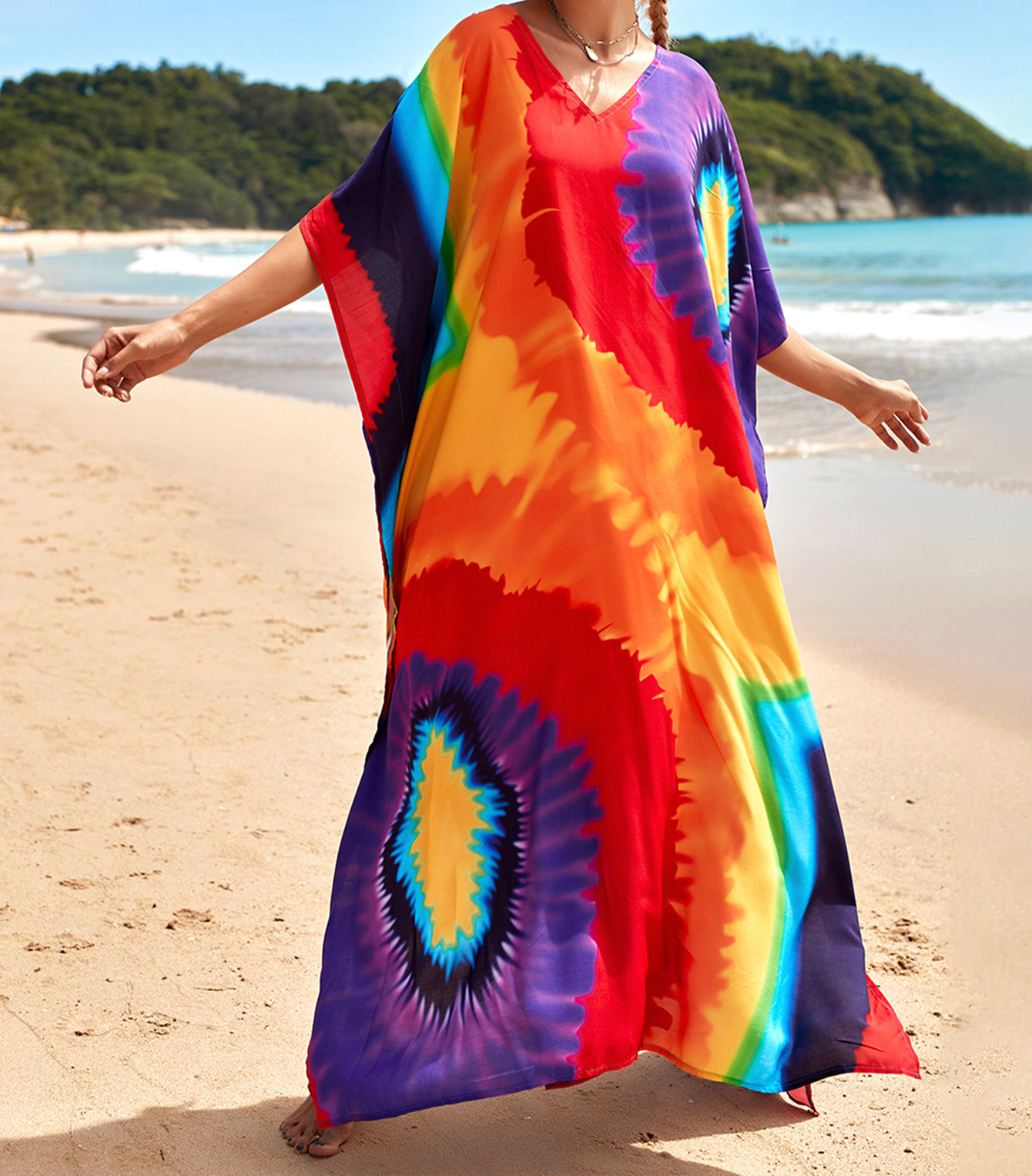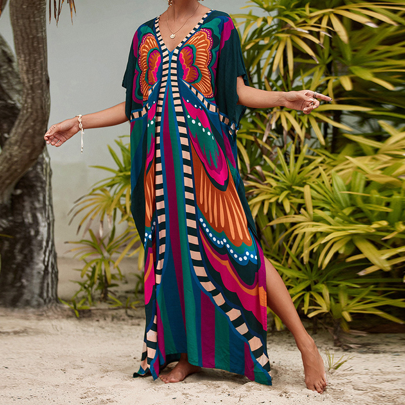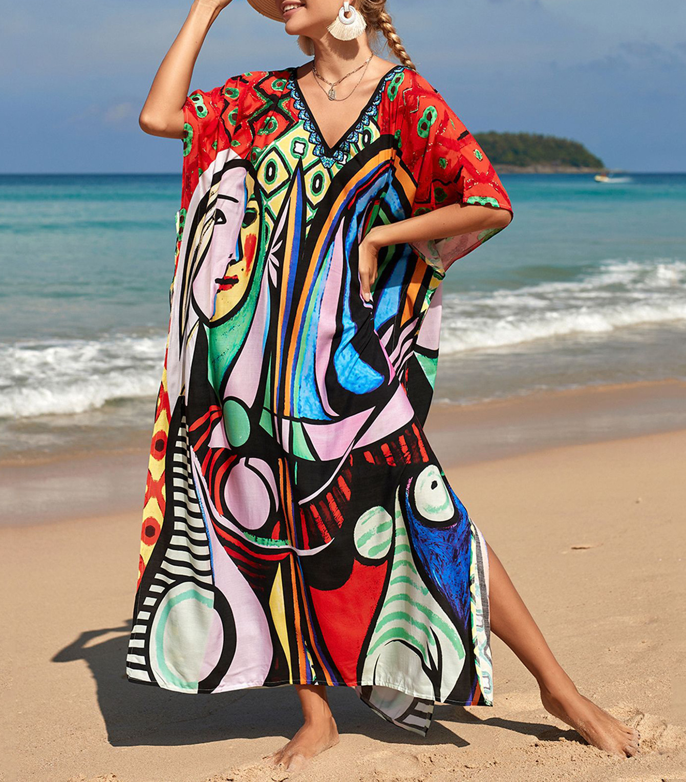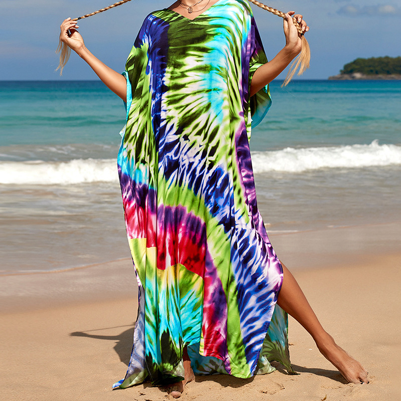 2024 유럽과 미국의 국경 간 아마존 여름 프린트 비치 블라우스 휴가 캐주얼 태양 방지 해변 원피스 느슨한 플러스 사이즈