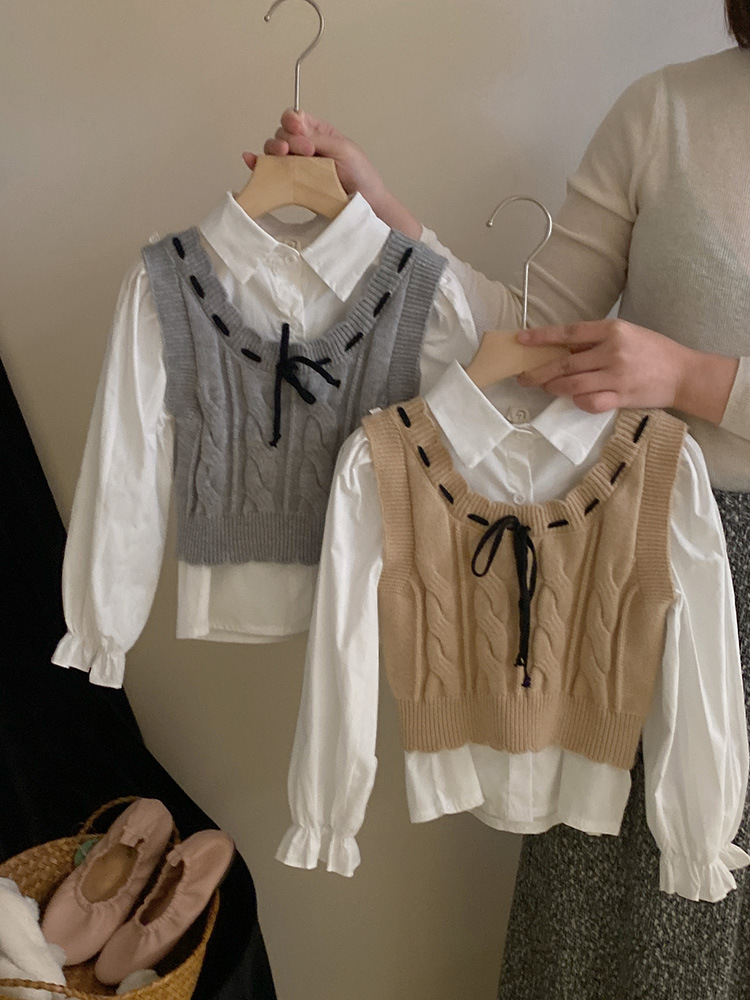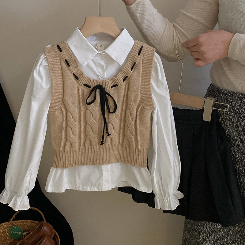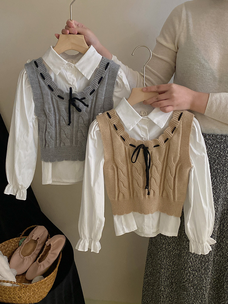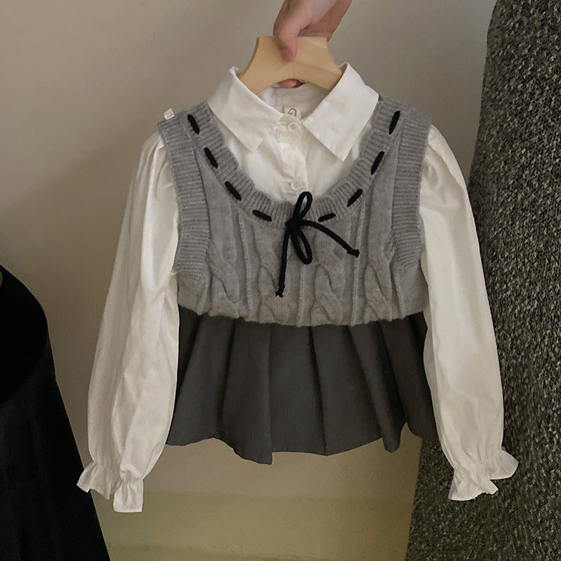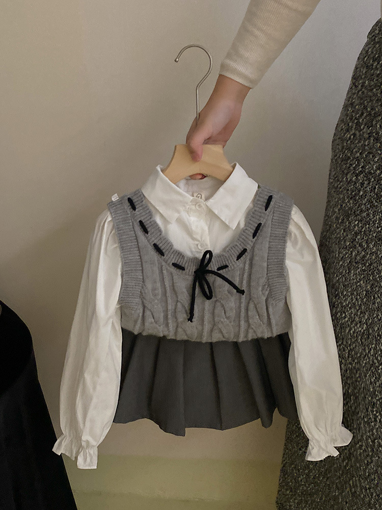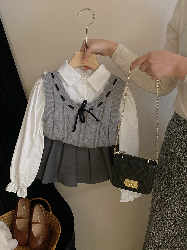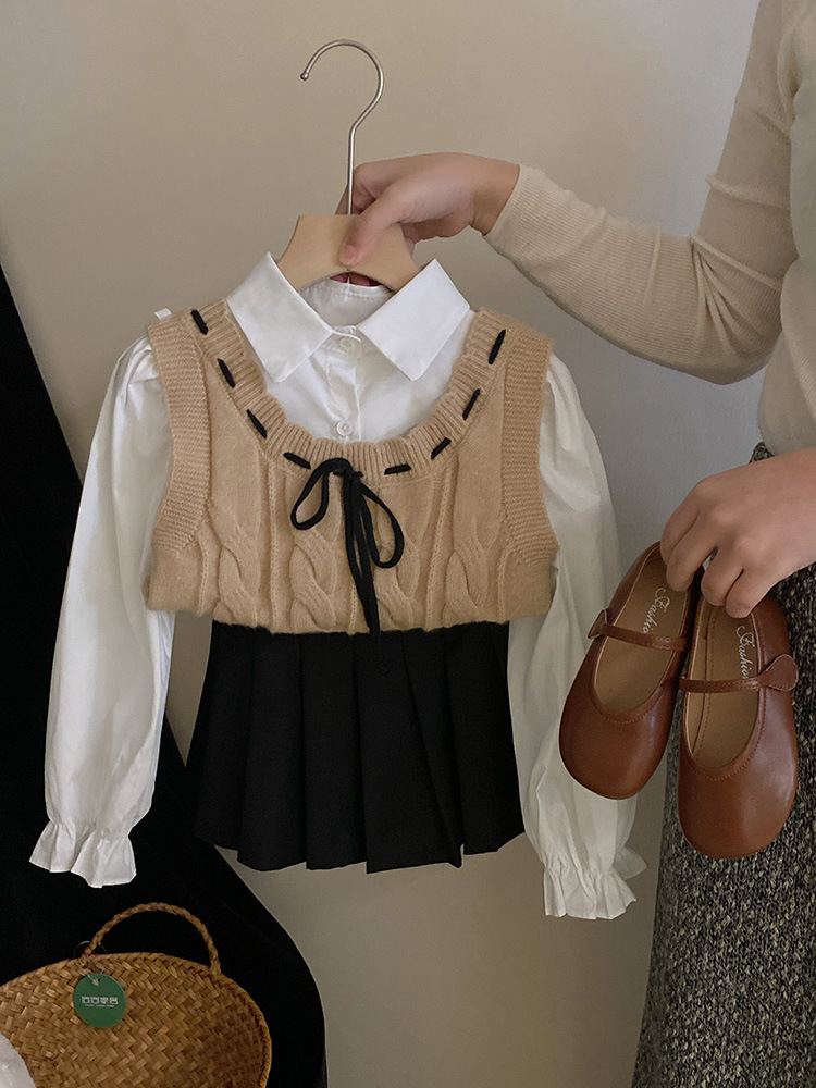 소녀 니트 조끼 셔츠 최고 대학 스타일 세트 2024 봄 새로운 서양식 플리츠 스커트 트렌디 한 아동복스토어 가기