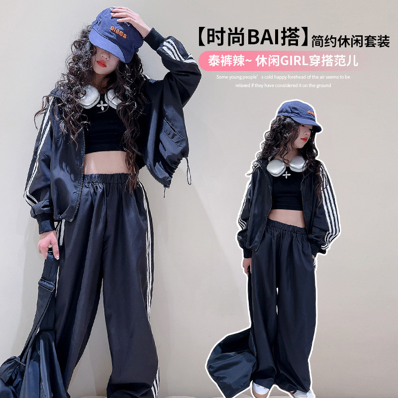 소녀 봄 세트 2024 새로운 패션 소녀 중대형 어린이 레저 스포츠 스트립 봄 투피스 세트 도매스토어 가기